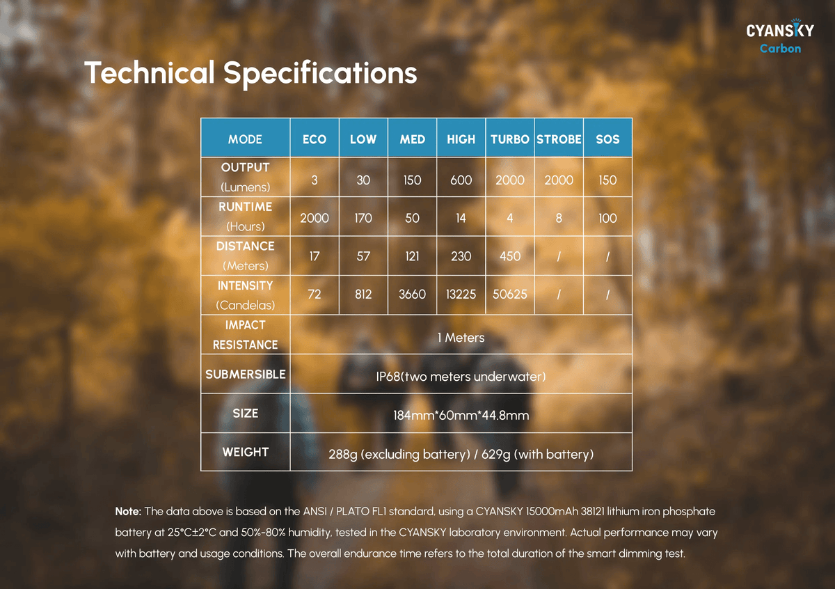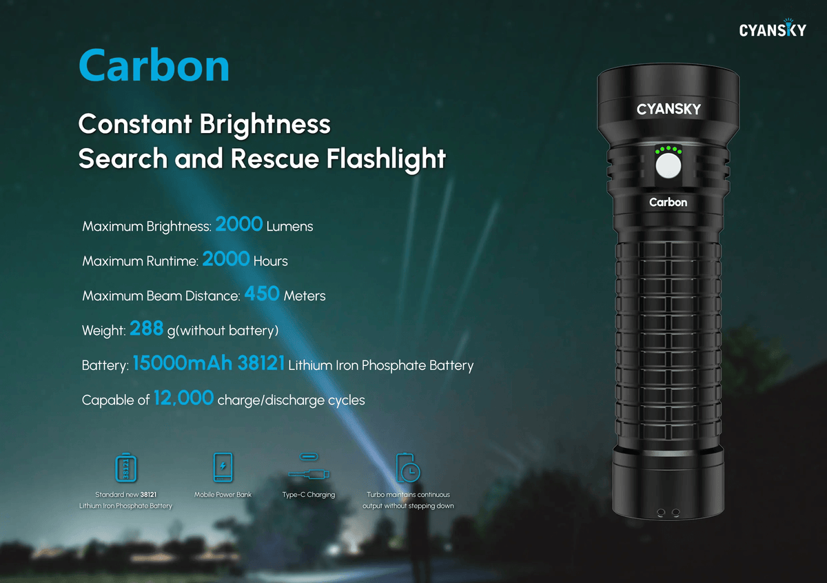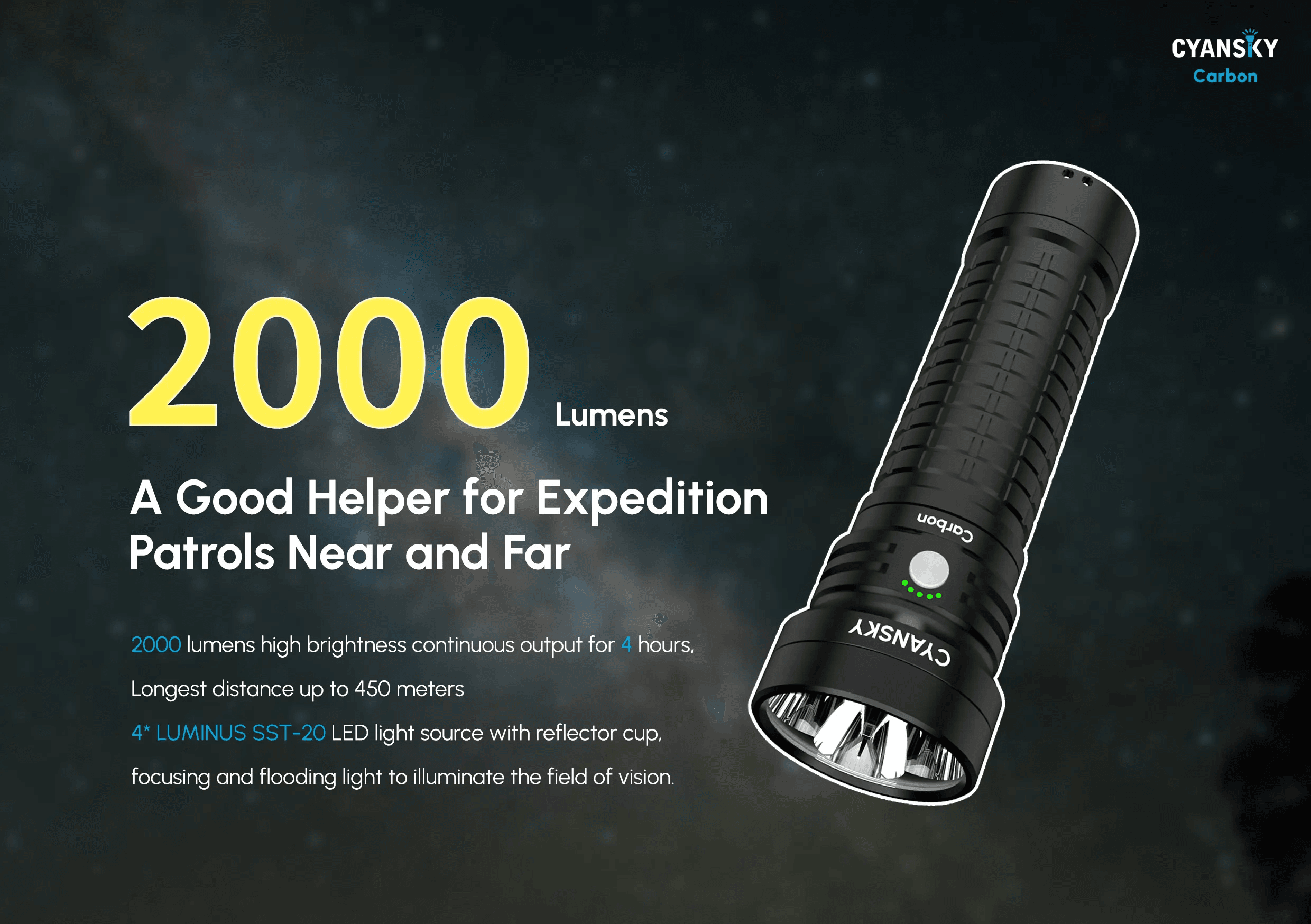 Introducing the Cyansky Carbon, a Portable Steady Beam Searchlight—a high-performance flashlight engineered for reliability and endurance in demanding conditions. Equipped with four Luminus SST-20 LEDs, it delivers a maximum output of 2,000 lumens, ensuring exceptional brightness for various applications.
