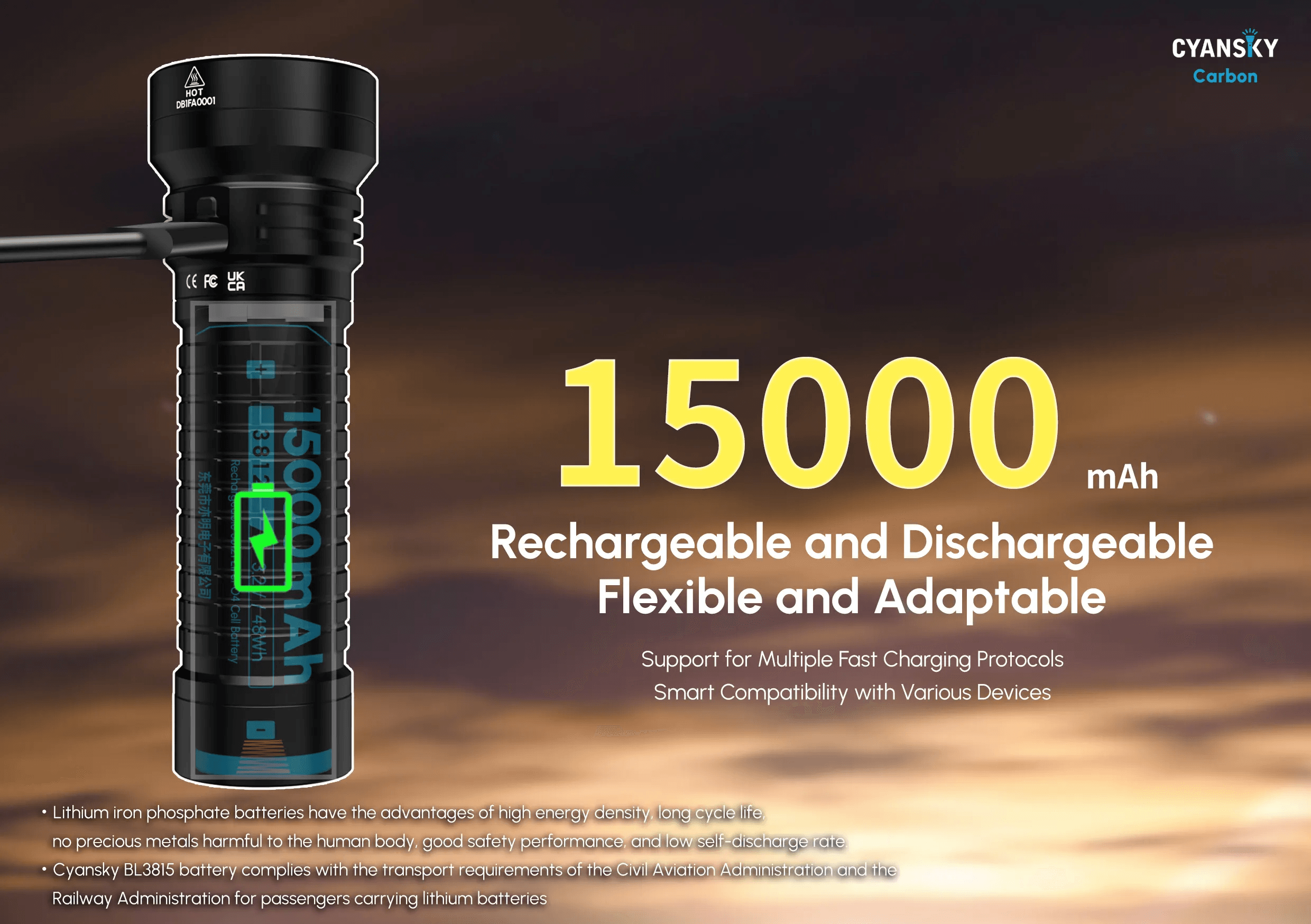 • Extended Runtime: Powered by a 15,000mAh Lithium Iron Phosphate (LiFePO₄) battery, offering up to 2,000 hours of operation on the lowest setting.