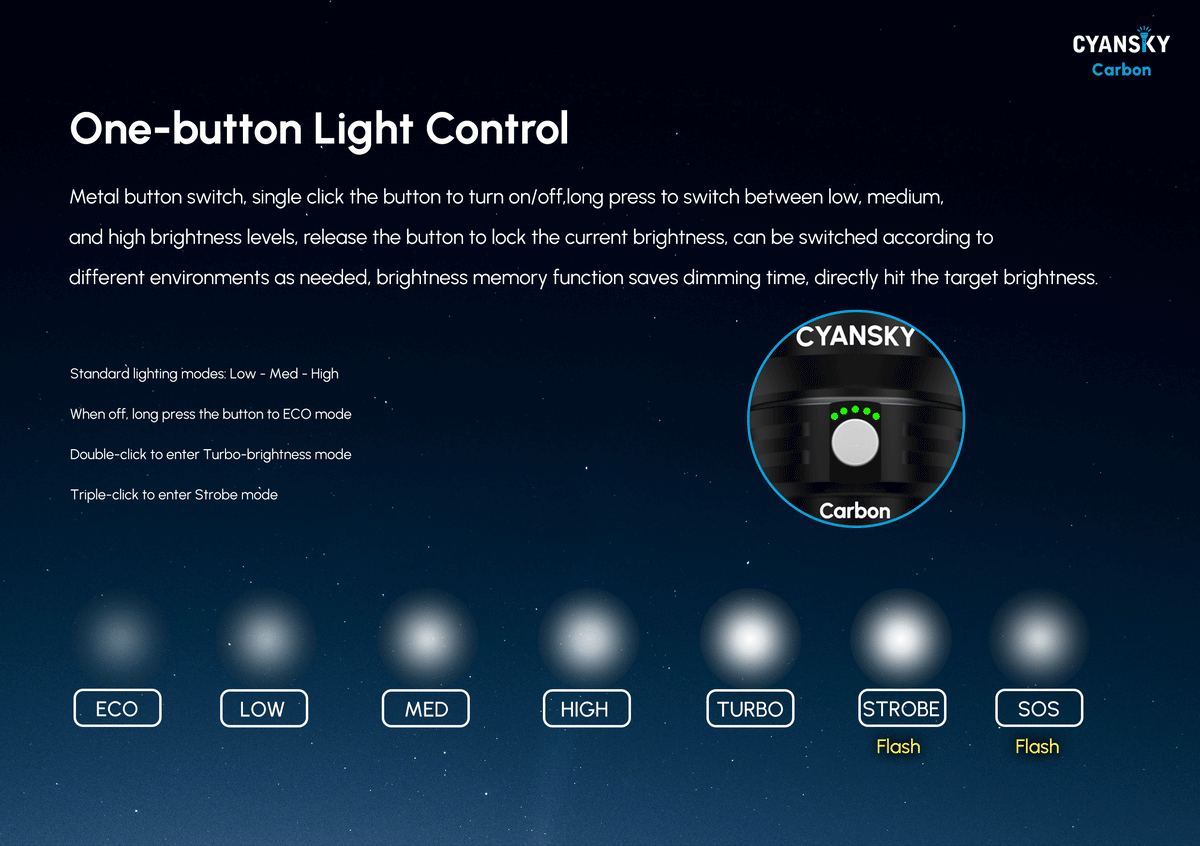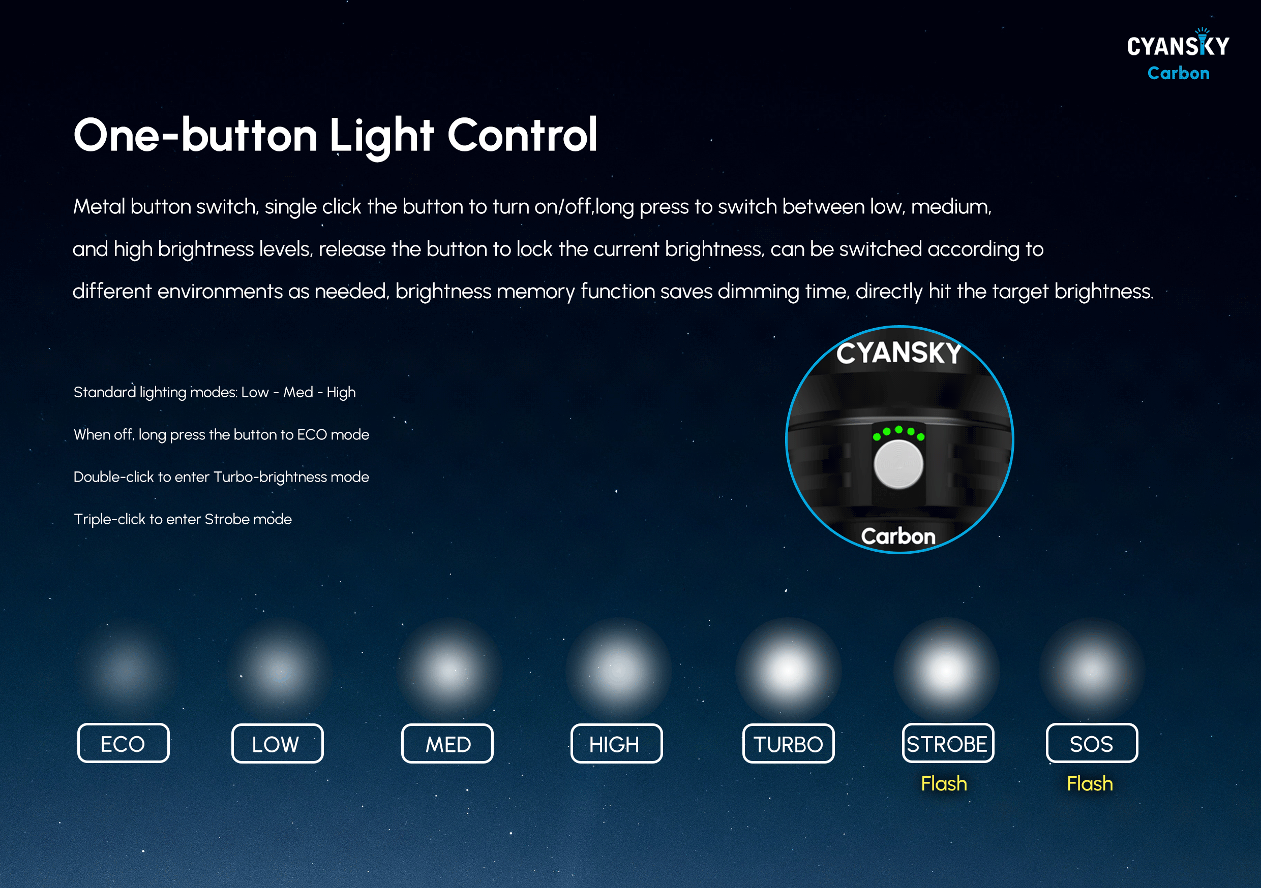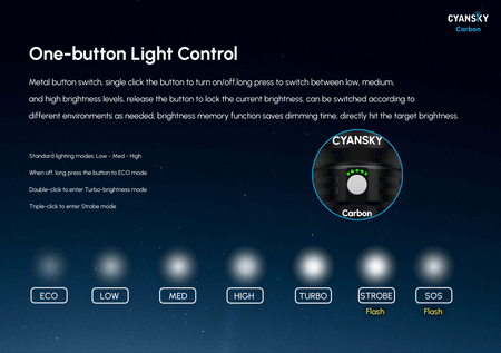 • Versatile Modes: Features multiple lighting modes, including Turbo, High, Medium, Low, Eco, Strobe, and SOS, to adapt to various situations.