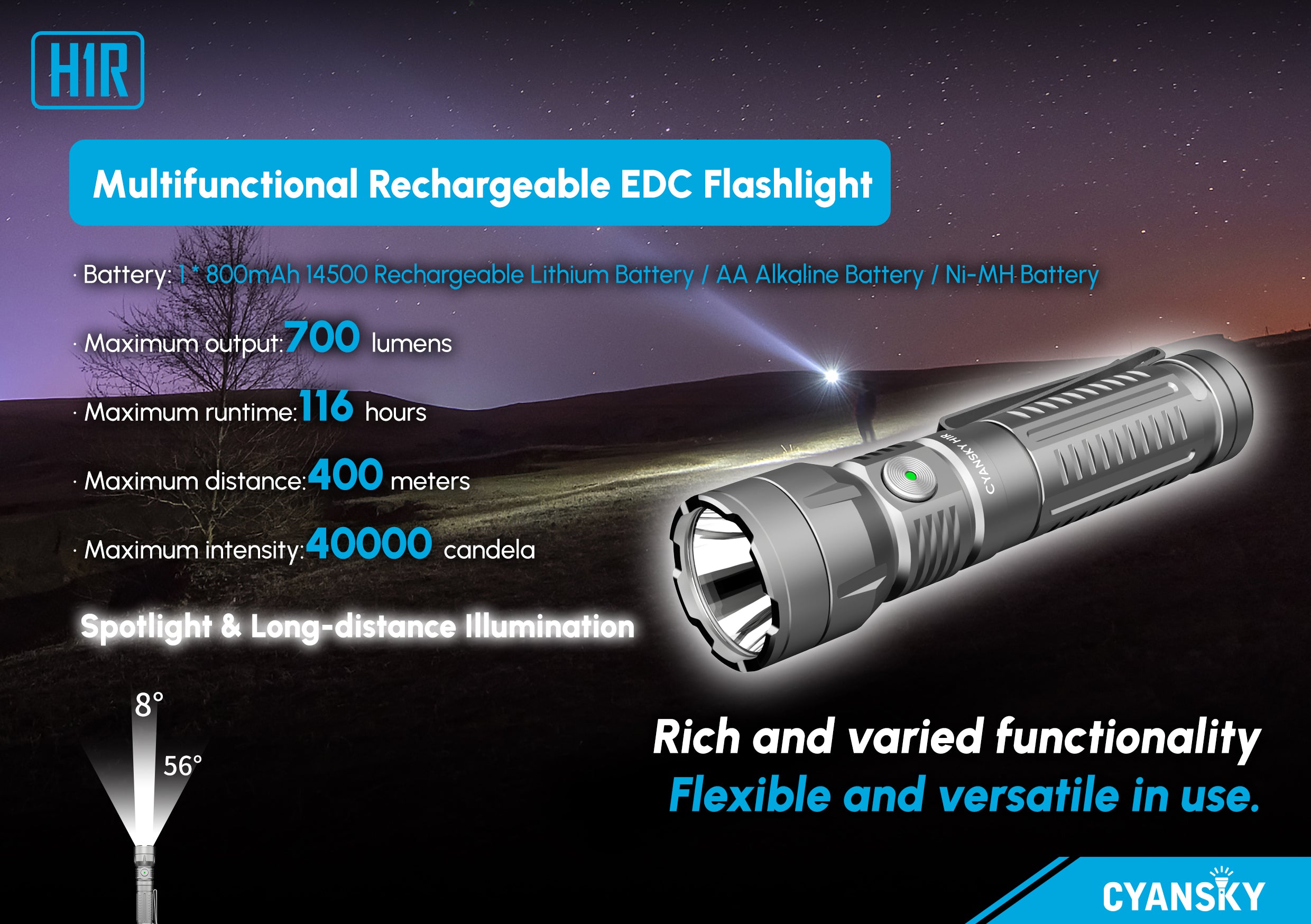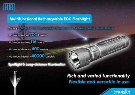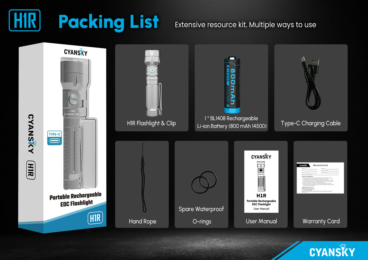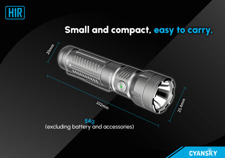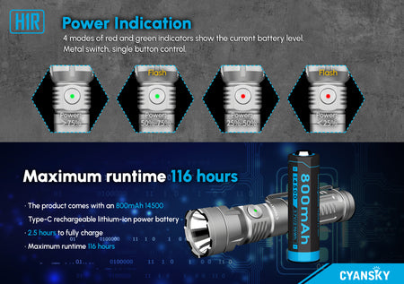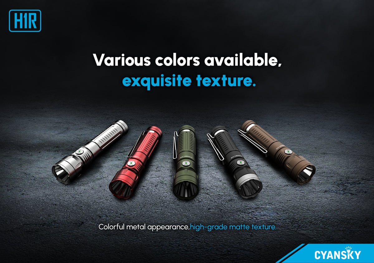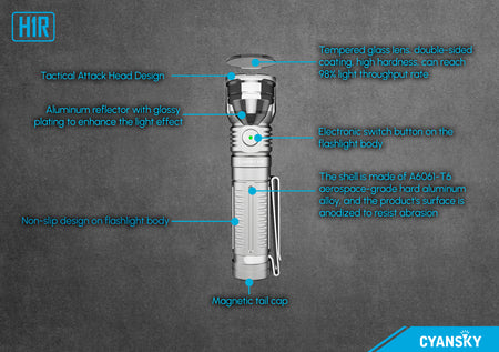 The Cyansky H1R Silver Edition is a lightweight, portable, and compact EDC mini flashlight. H1R uses a 14500-lithium battery power supply (included), compatible with the common AA Alkaline battery and NI-MH battery on the market. USB Type-C charging interface, plug, and charge, convenient and fast. Max runtime 168 hours. H1R using OSRAM KW CSLNM1. TG LED. With a full metal reflector, it has a max brightness of 700 lumens and a max distance of 60 meters—body switch design, with the clip. The tail with a magnetic suction function, In addition, the H1R flashlight achieves an IP68 waterproof and dustproof level, resistant to 2 meters impact, to meet the needs of outdoor, leisure and maintenance, and other lighting needs in various environments.