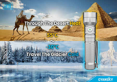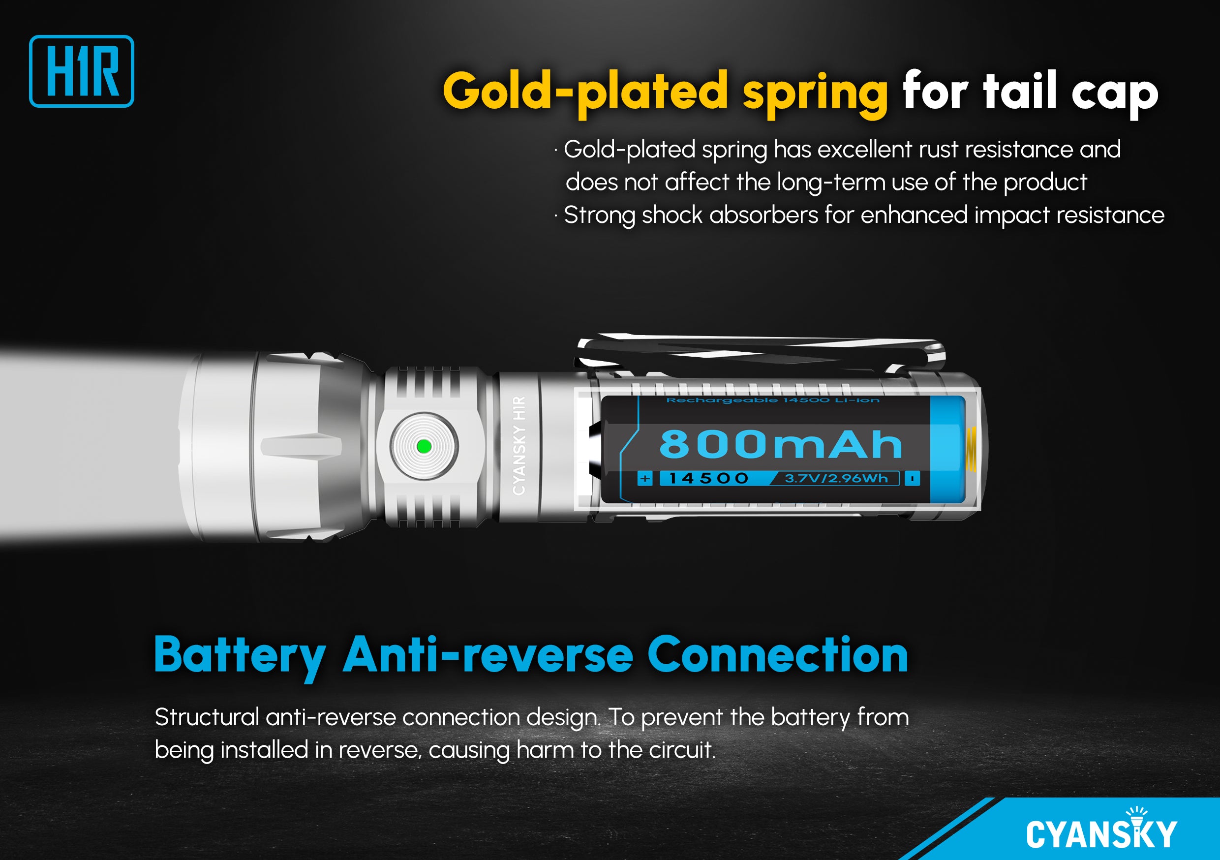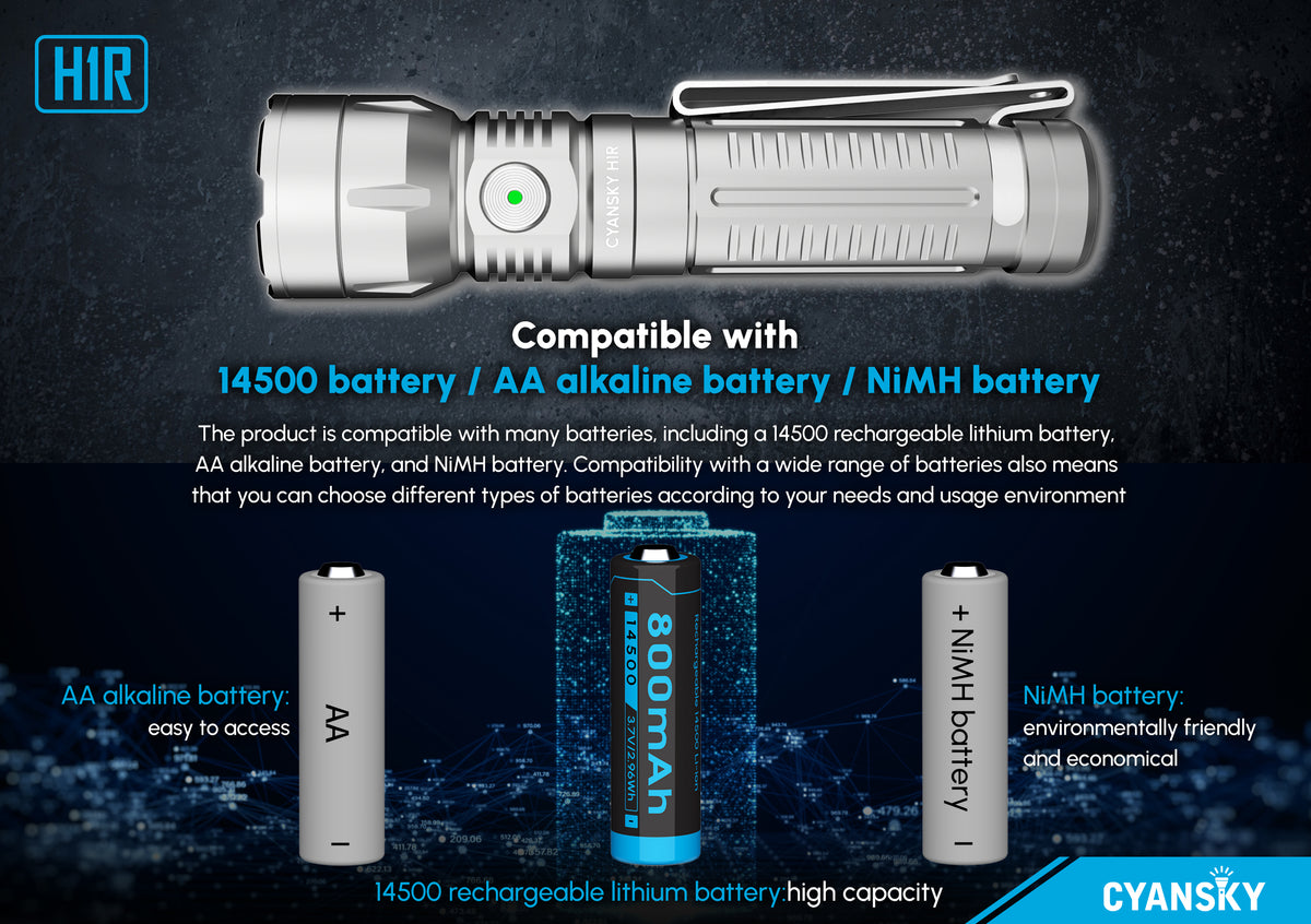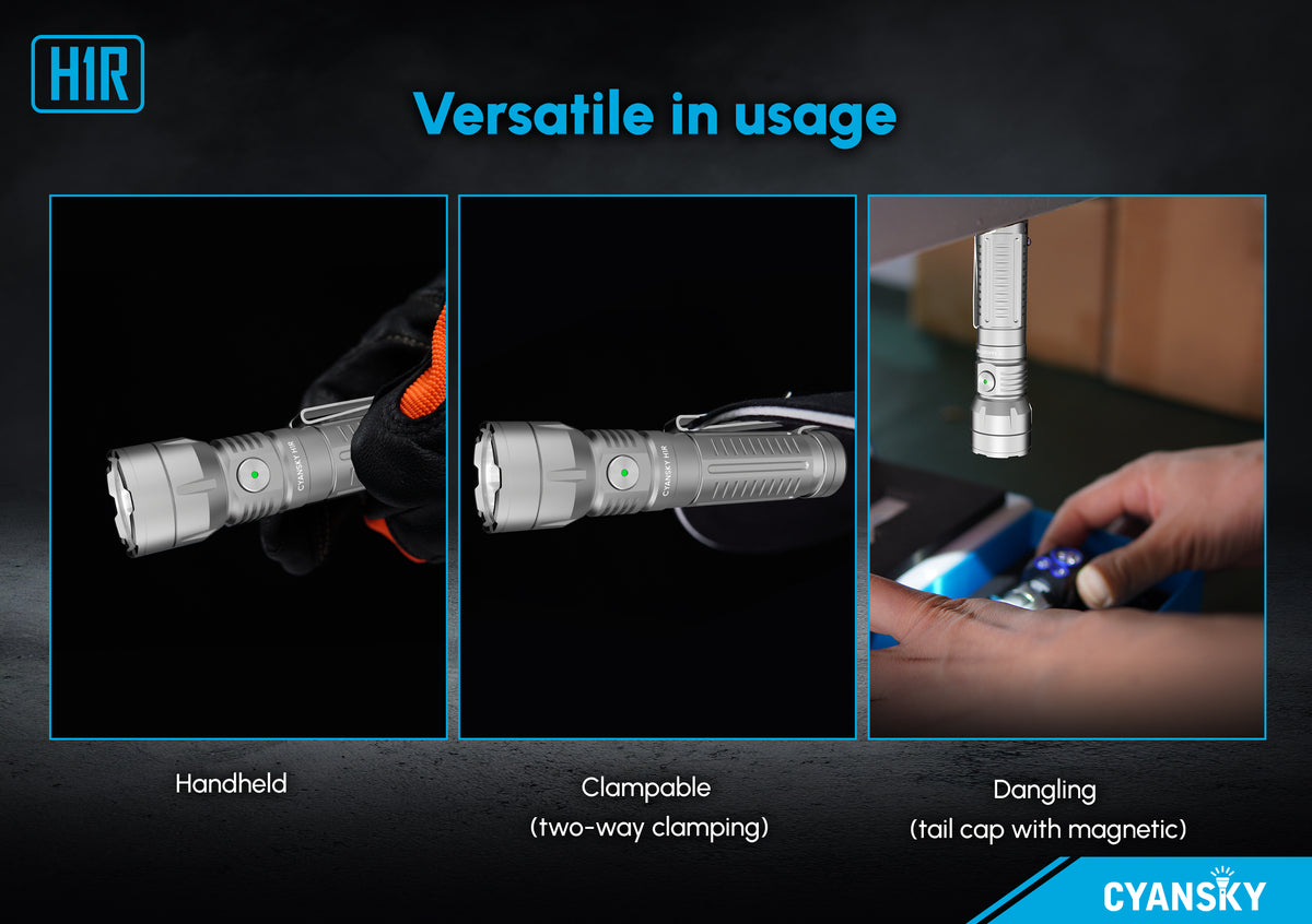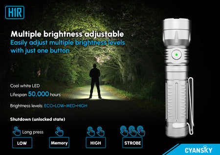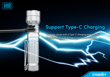 The Cyansky H1R Silver Edition is a lightweight, portable, and compact EDC mini flashlight. H1R uses a 14500-lithium battery power supply (included), compatible with the common AA Alkaline battery and NI-MH battery on the market. USB Type-C charging interface, plug, and charge, convenient and fast. Max runtime 168 hours. H1R using OSRAM KW CSLNM1. TG LED. With a full metal reflector, it has a max brightness of 700 lumens and a max distance of 60 meters—body switch design, with the clip. The tail with a magnetic suction function, In addition, the H1R flashlight achieves an IP68 waterproof and dustproof level, resistant to 2 meters impact, to meet the needs of outdoor, leisure and maintenance, and other lighting needs in various environments.