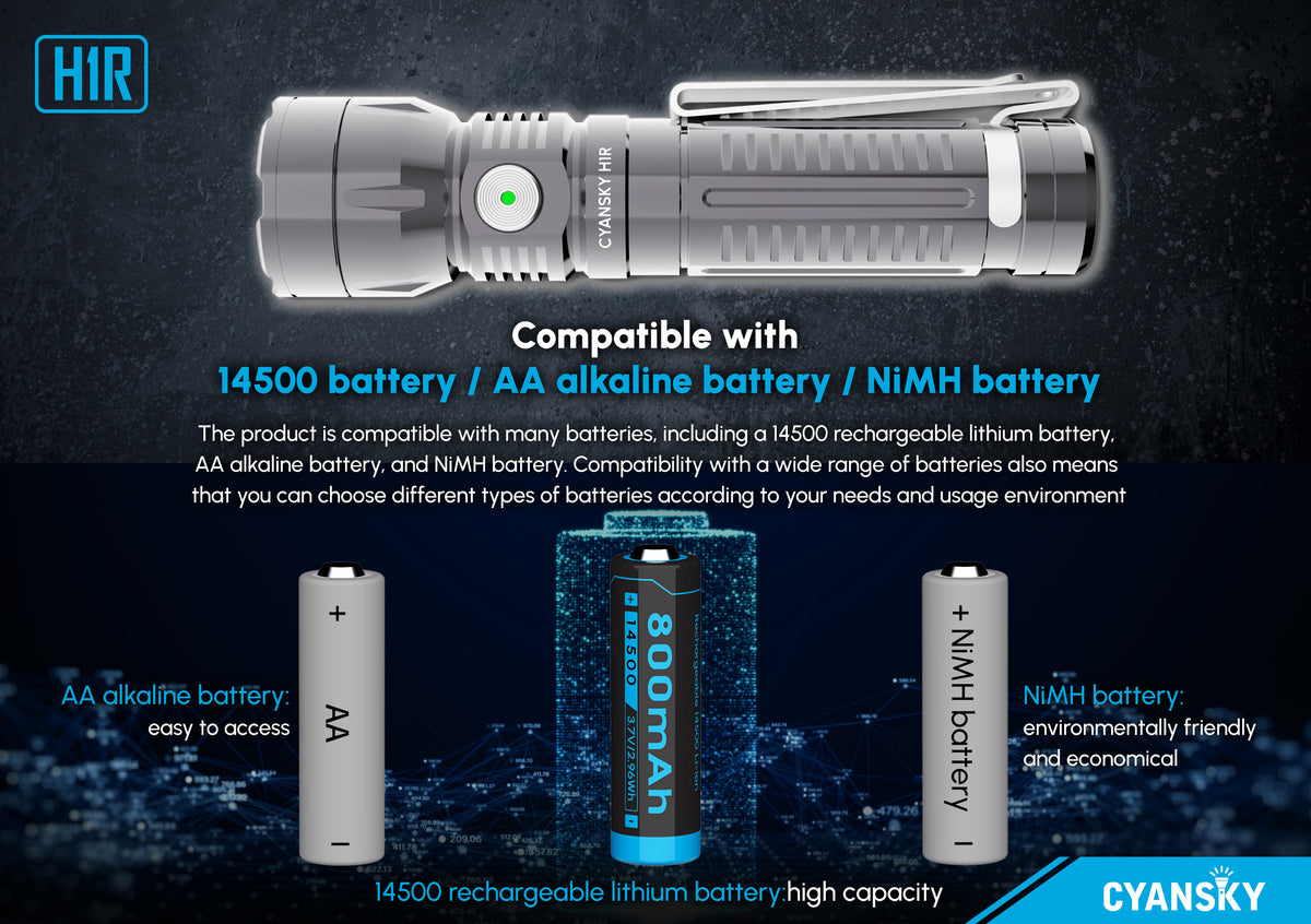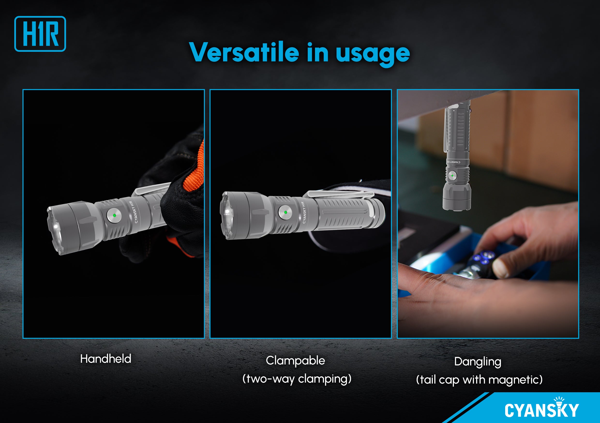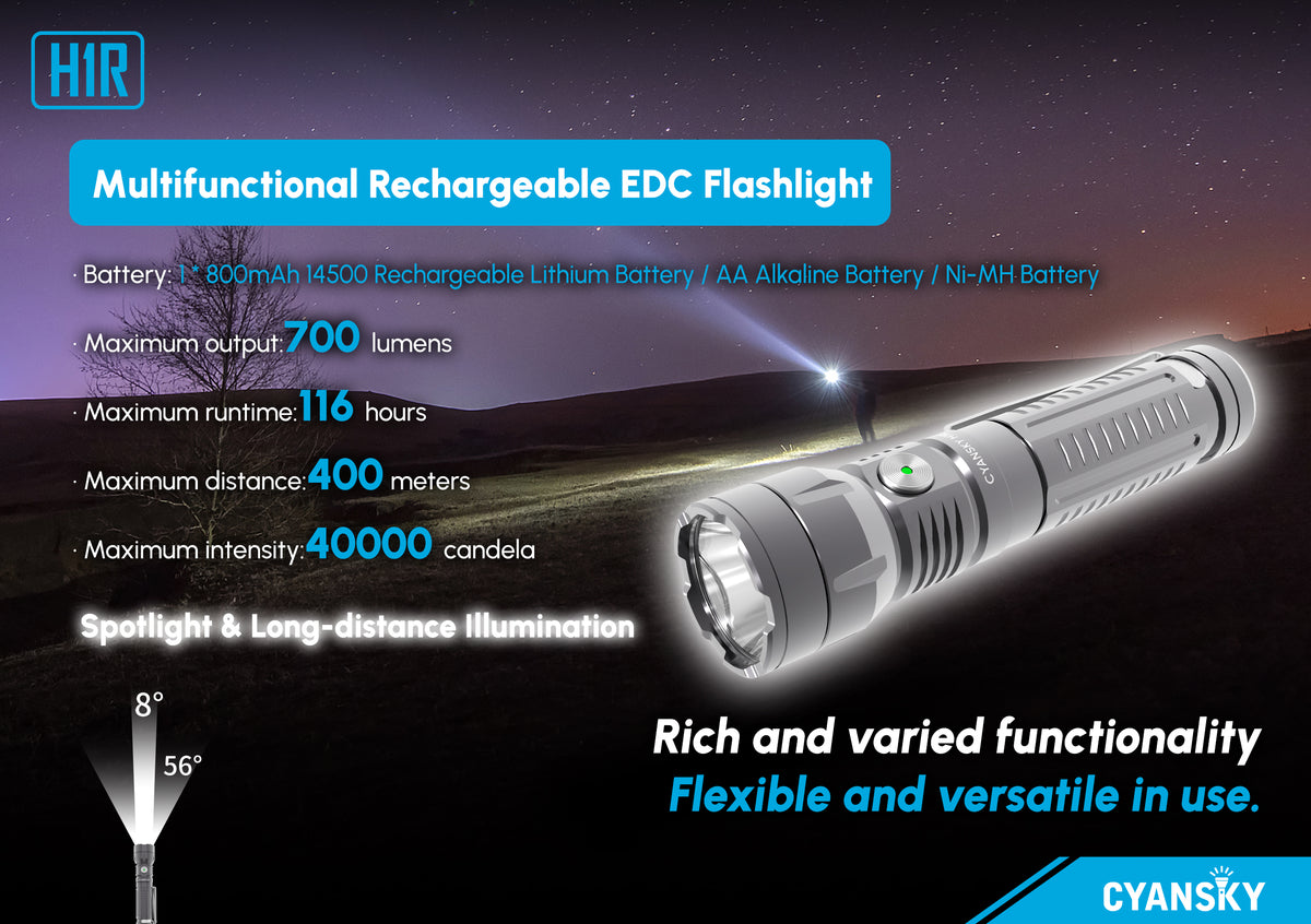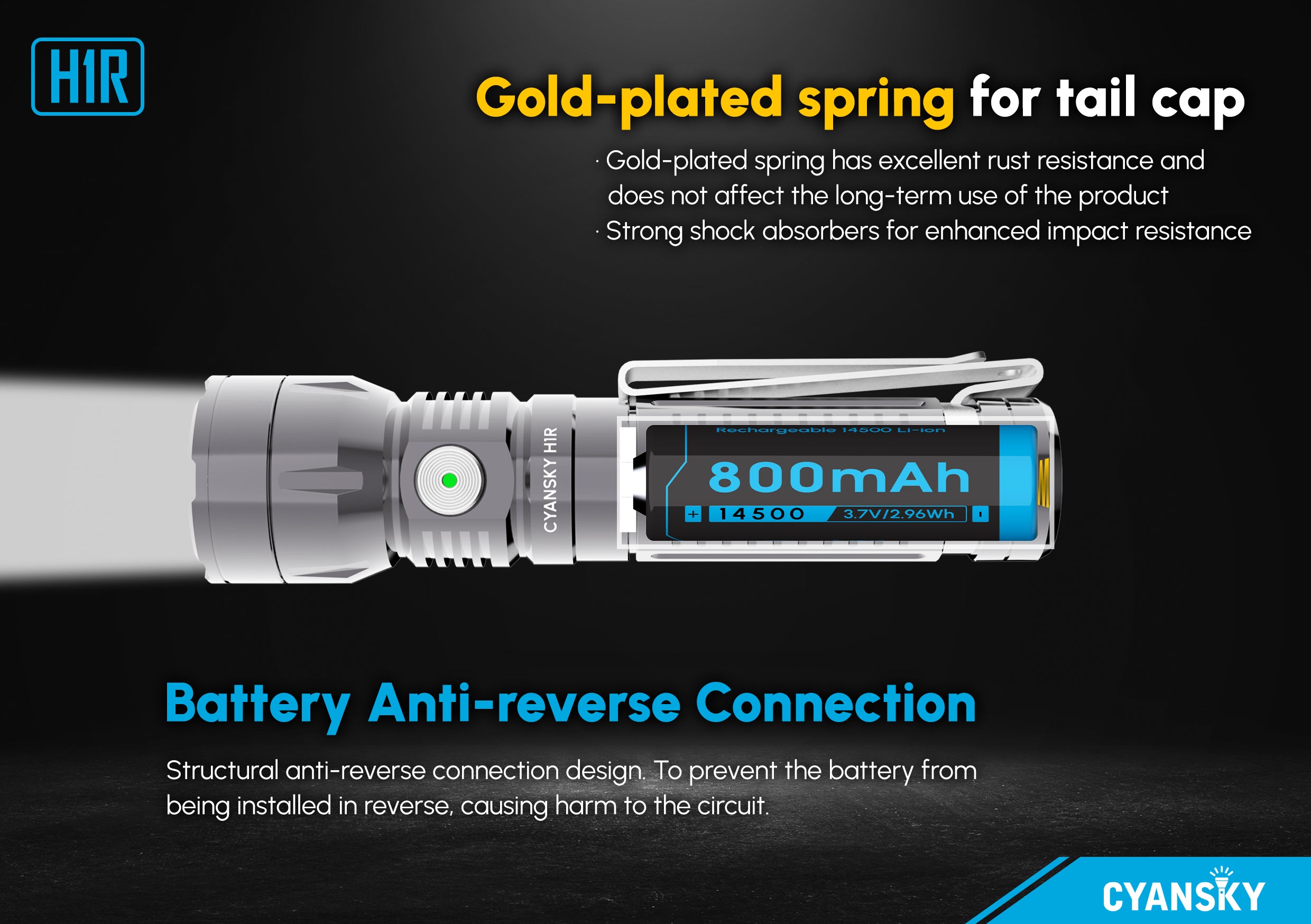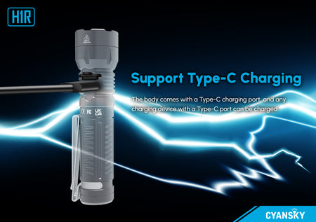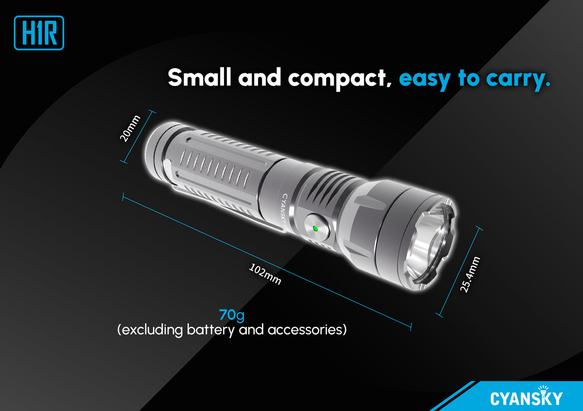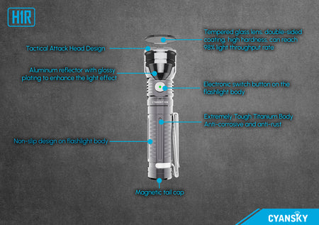 The Cyansky H1R Titanium Edition is a lightweight, portable, and compact EDC mini flashlight. H1R uses a 14500 lithium battery power supply, compatible with the common AA Alkaline battery and NI-MH battery on the market. USB Type-C charging interface, plug, and charge, convenient and fast. Max runtime 168 hours. H1R using OSRAM KW CSLNM1. TG LED. With a full metal reflector, it has a max brightness of 700 lumens and a max distance of 60 meters—body switch design, with the clip. The tail with a magnetic suction function, In addition, the H1R flashlight achieves an IP68 waterproof and dustproof level, resistant to 2 meters impact, to meet the needs of outdoor, leisure and maintenance, and other lighting needs in various environments.