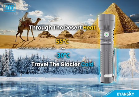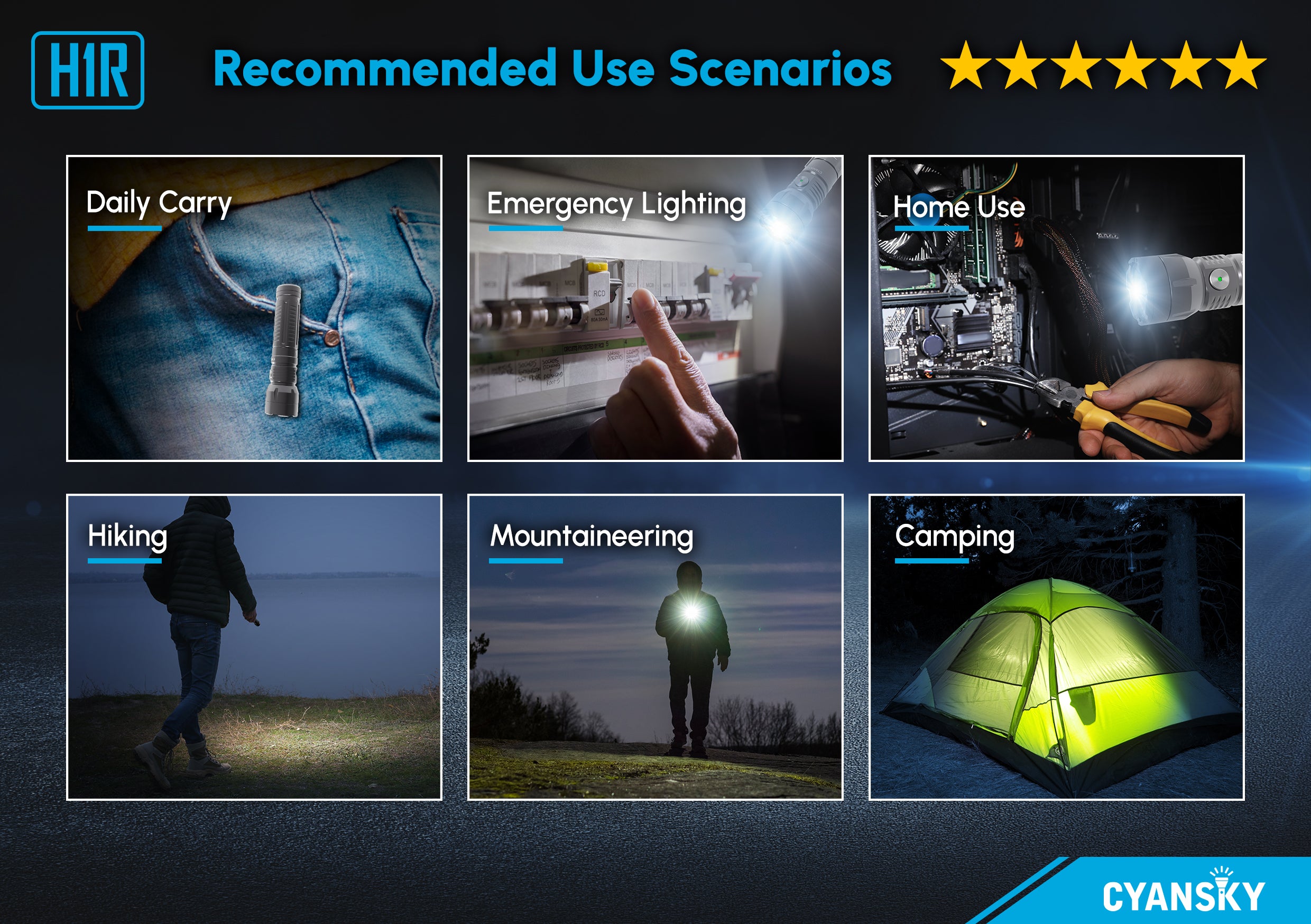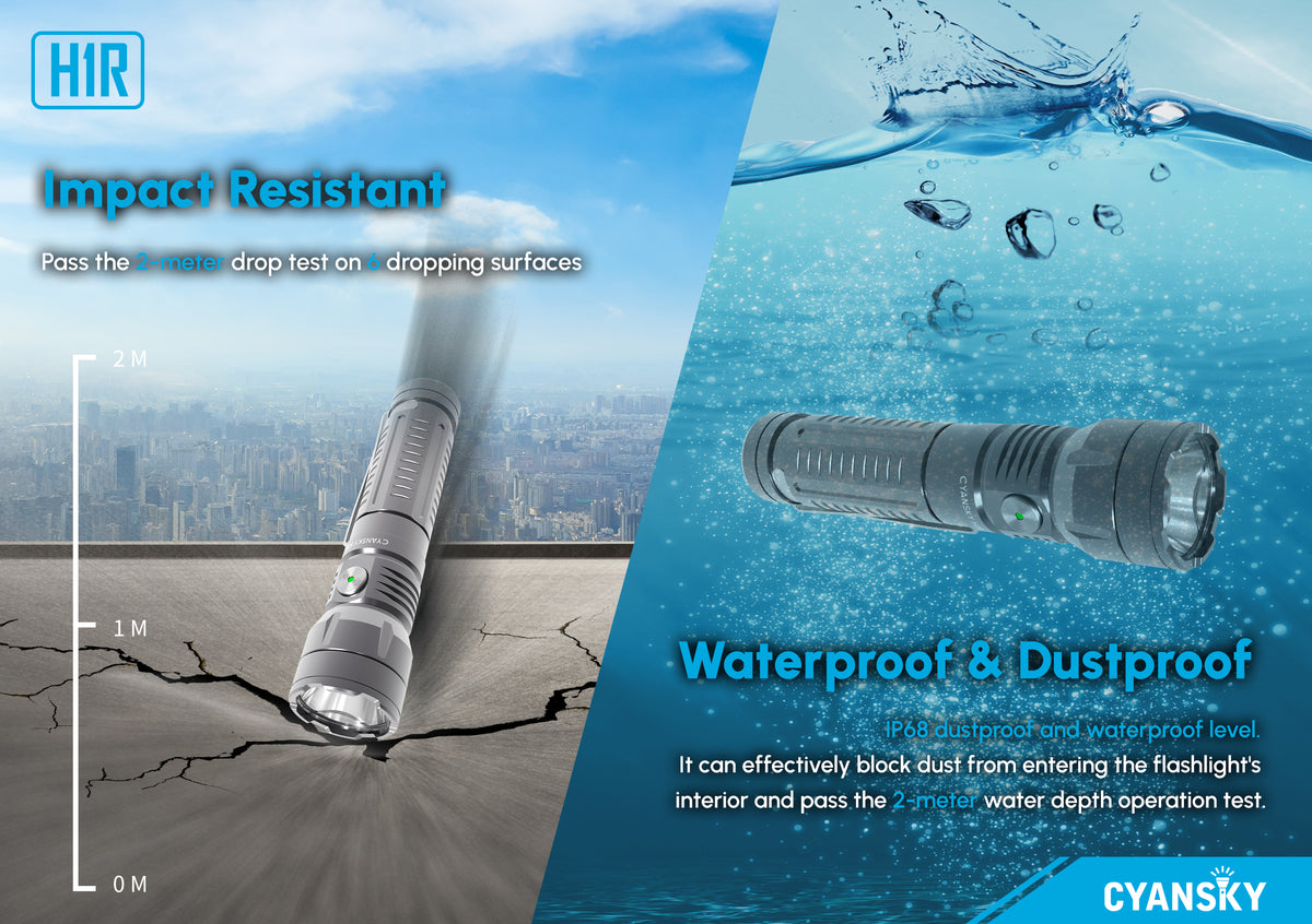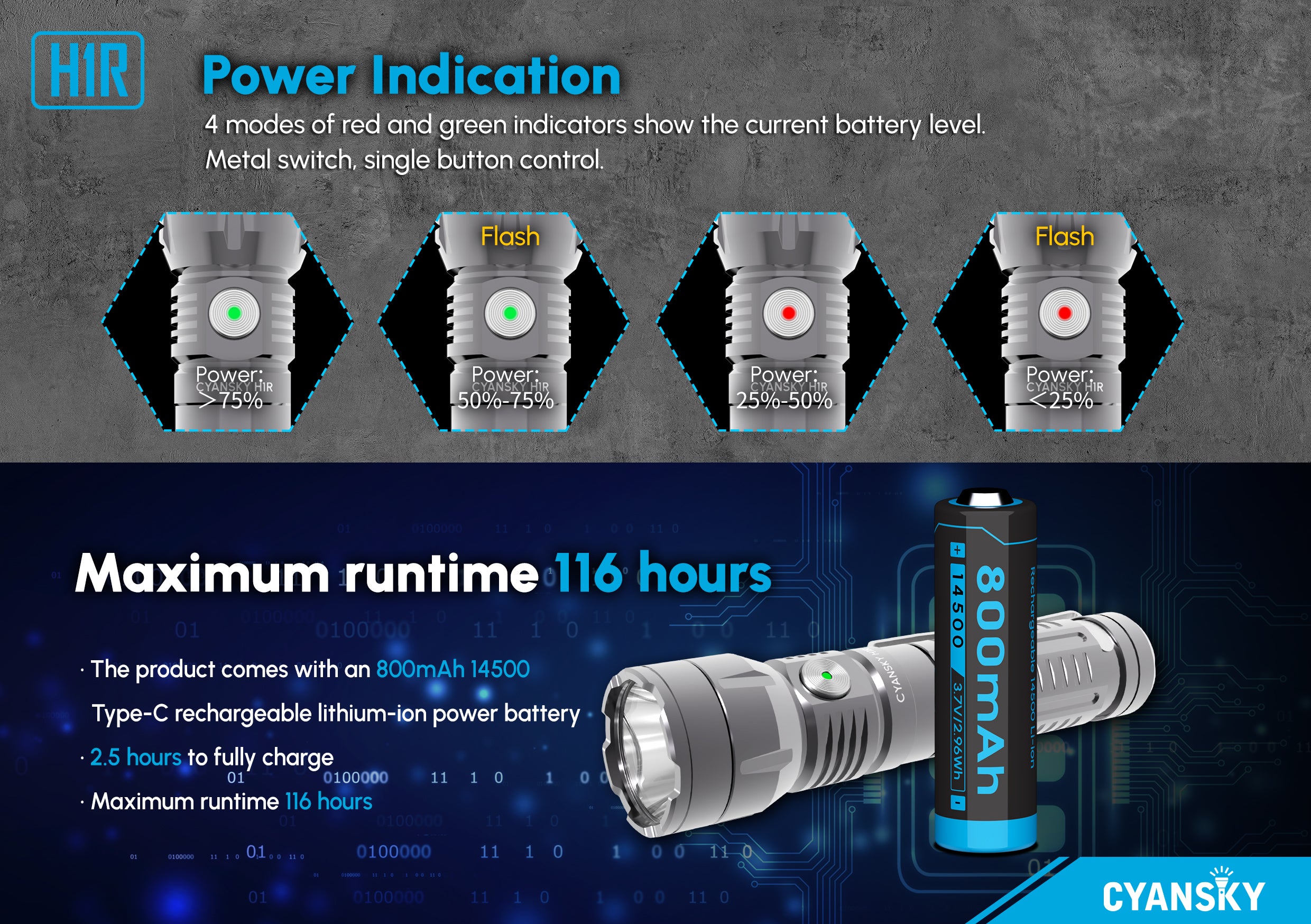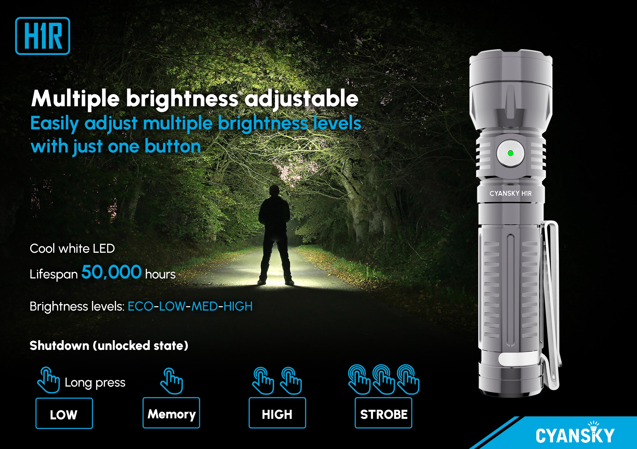 The Cyansky H1R Titanium Edition is a lightweight, portable, and compact EDC mini flashlight. H1R uses a 14500 lithium battery power supply, compatible with the common AA Alkaline battery and NI-MH battery on the market. USB Type-C charging interface, plug, and charge, convenient and fast. Max runtime 168 hours. H1R using OSRAM KW CSLNM1. TG LED. With a full metal reflector, it has a max brightness of 700 lumens and a max distance of 60 meters—body switch design, with the clip. The tail with a magnetic suction function, In addition, the H1R flashlight achieves an IP68 waterproof and dustproof level, resistant to 2 meters impact, to meet the needs of outdoor, leisure and maintenance, and other lighting needs in various environments.