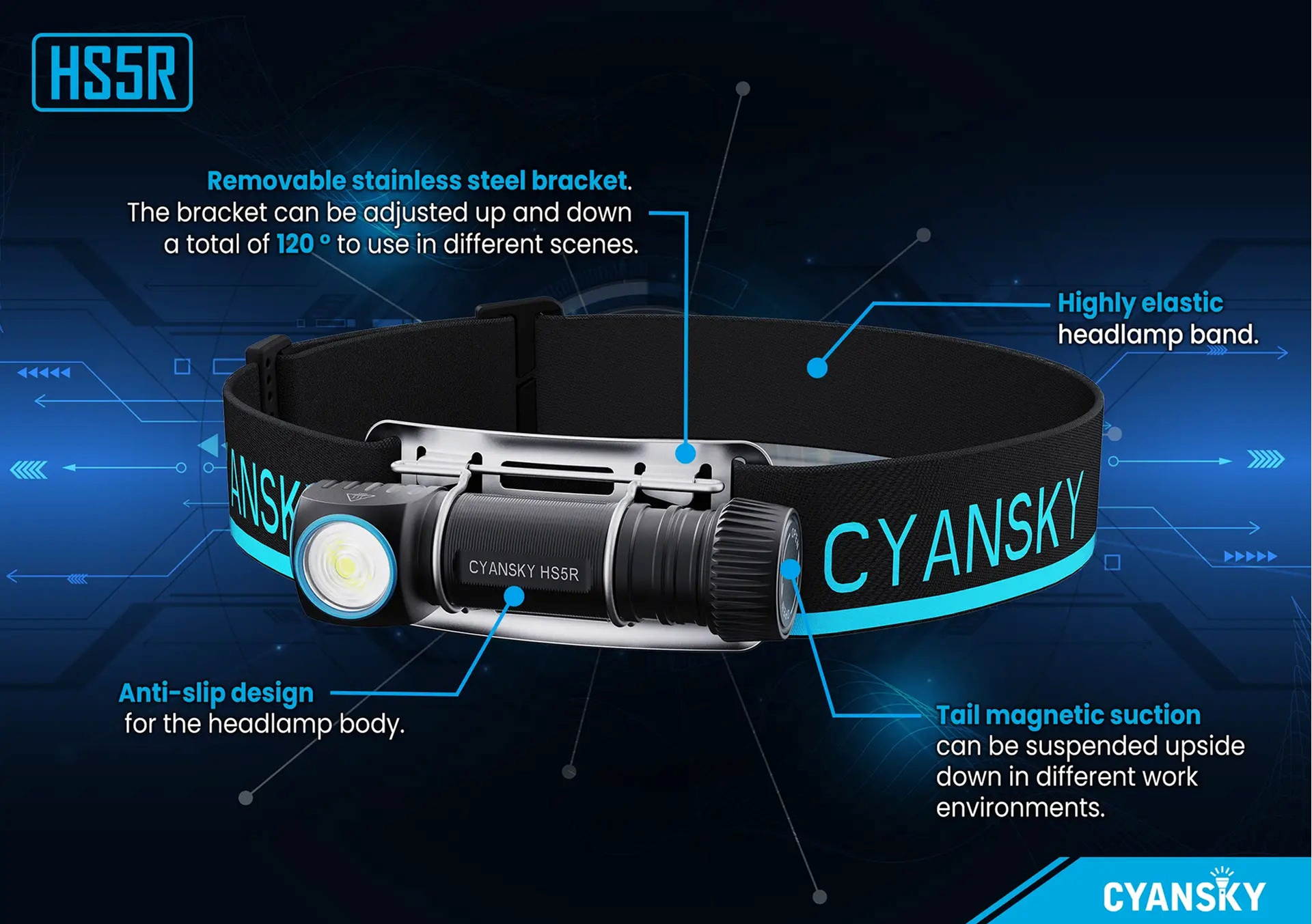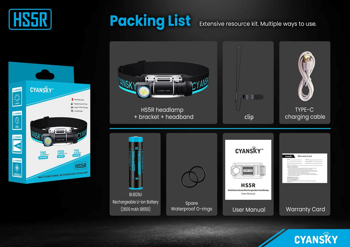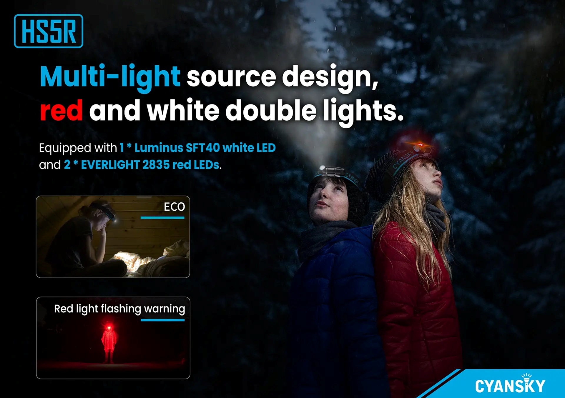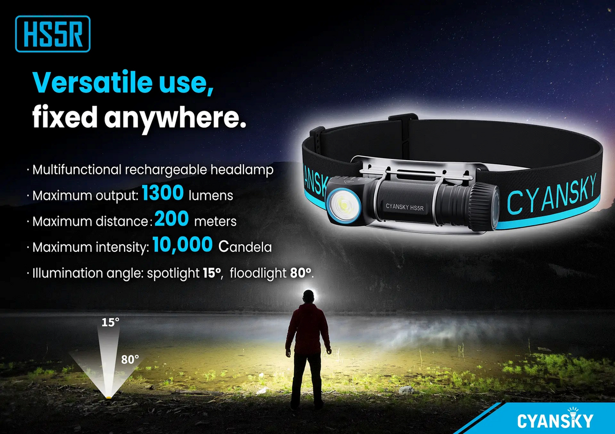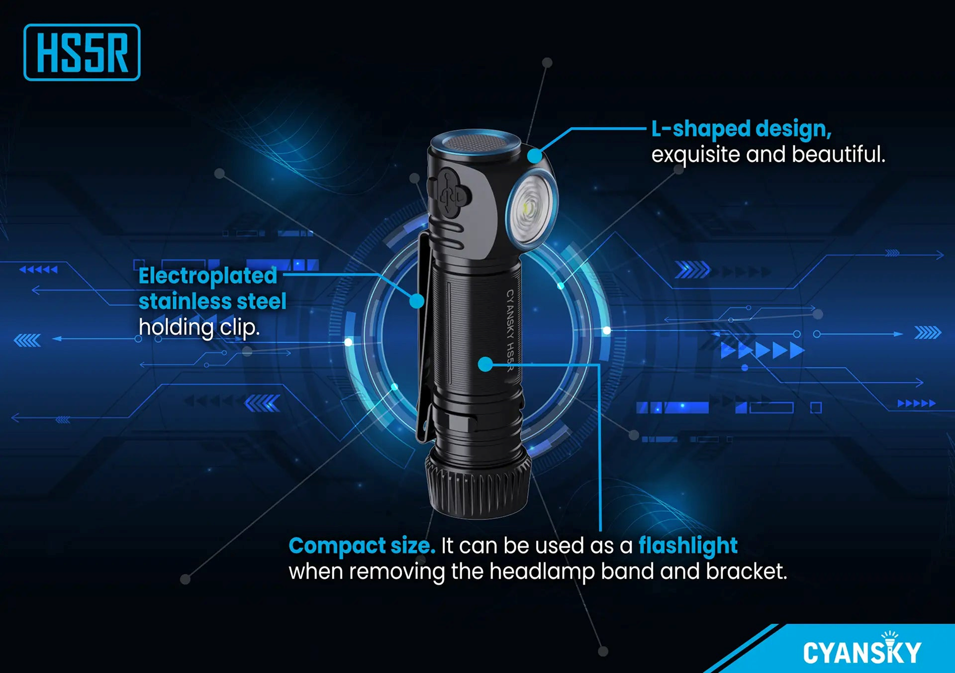 The Cyansky HS5R is multi-light red and white headlamp designed for outdoor sports, industrial work, repair, and camping. The Lightweight metal shell, L-shaped design is IPX8 waterproof with a ultra-thin lens, and a max of 1300 lumens high brightness. Features a multi-mode white spotlight, red light; single electronic button to control different light sources, electronic anti-reverse connection, compatible with convex and flat 18650 battery power, support TYPE-C charging. Wider headlamp strap to wear more stable. It can meet your lighting needs in different environments.