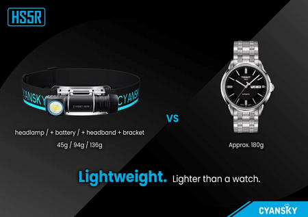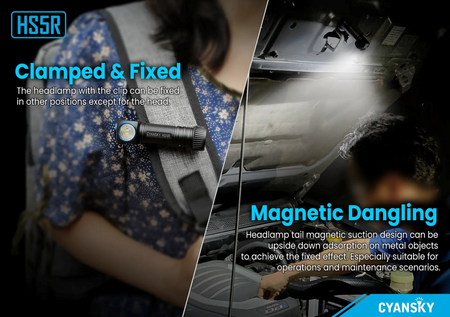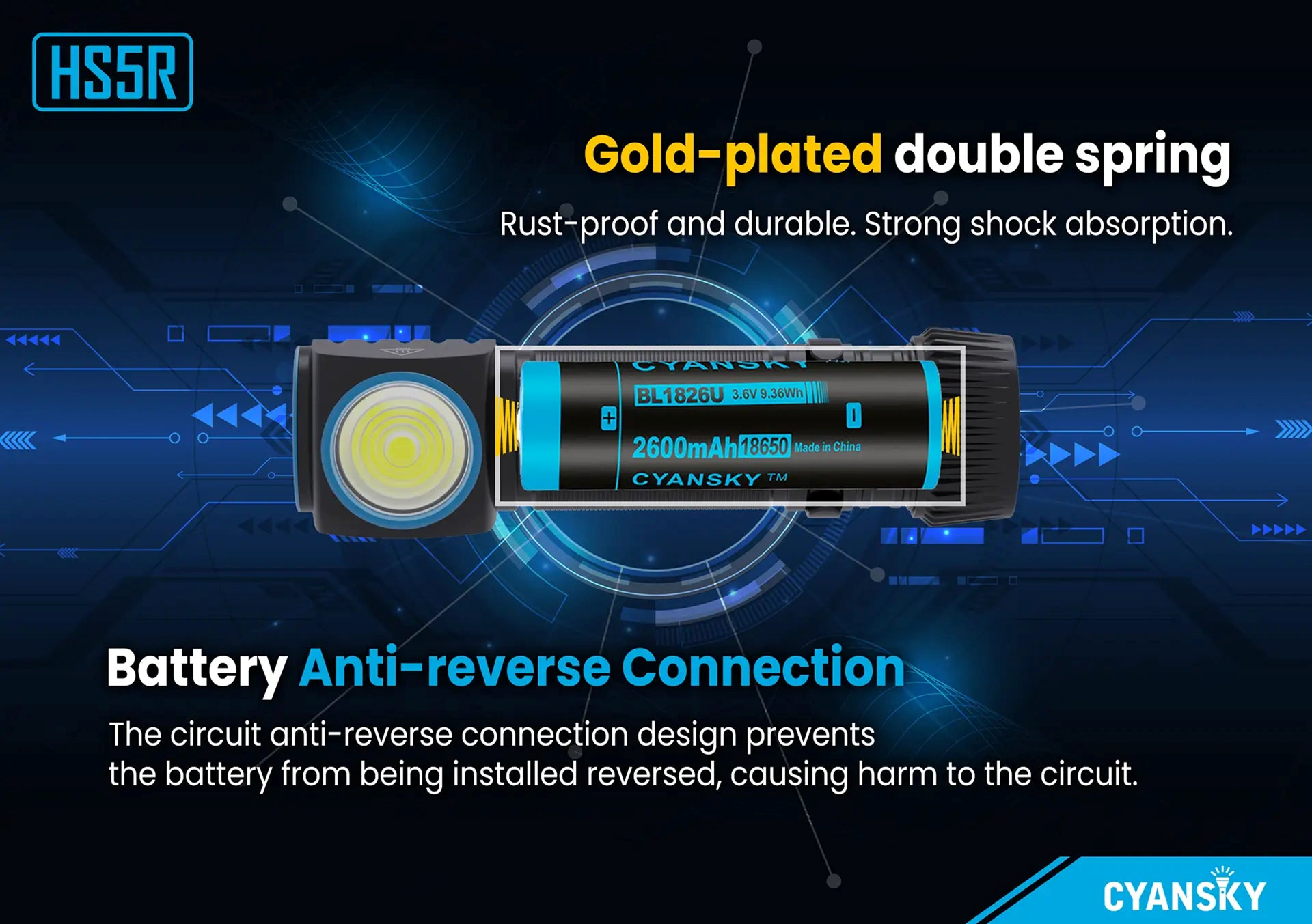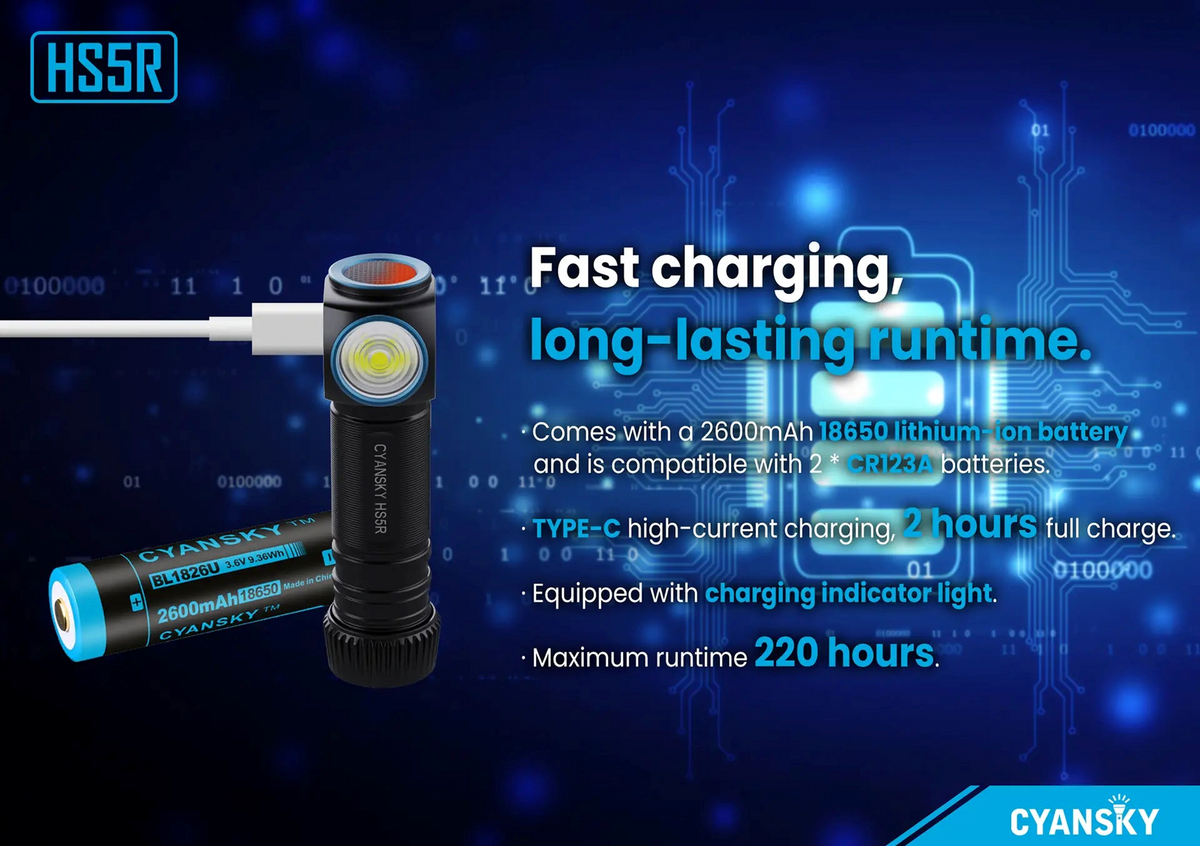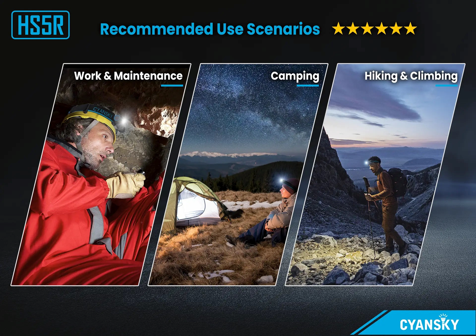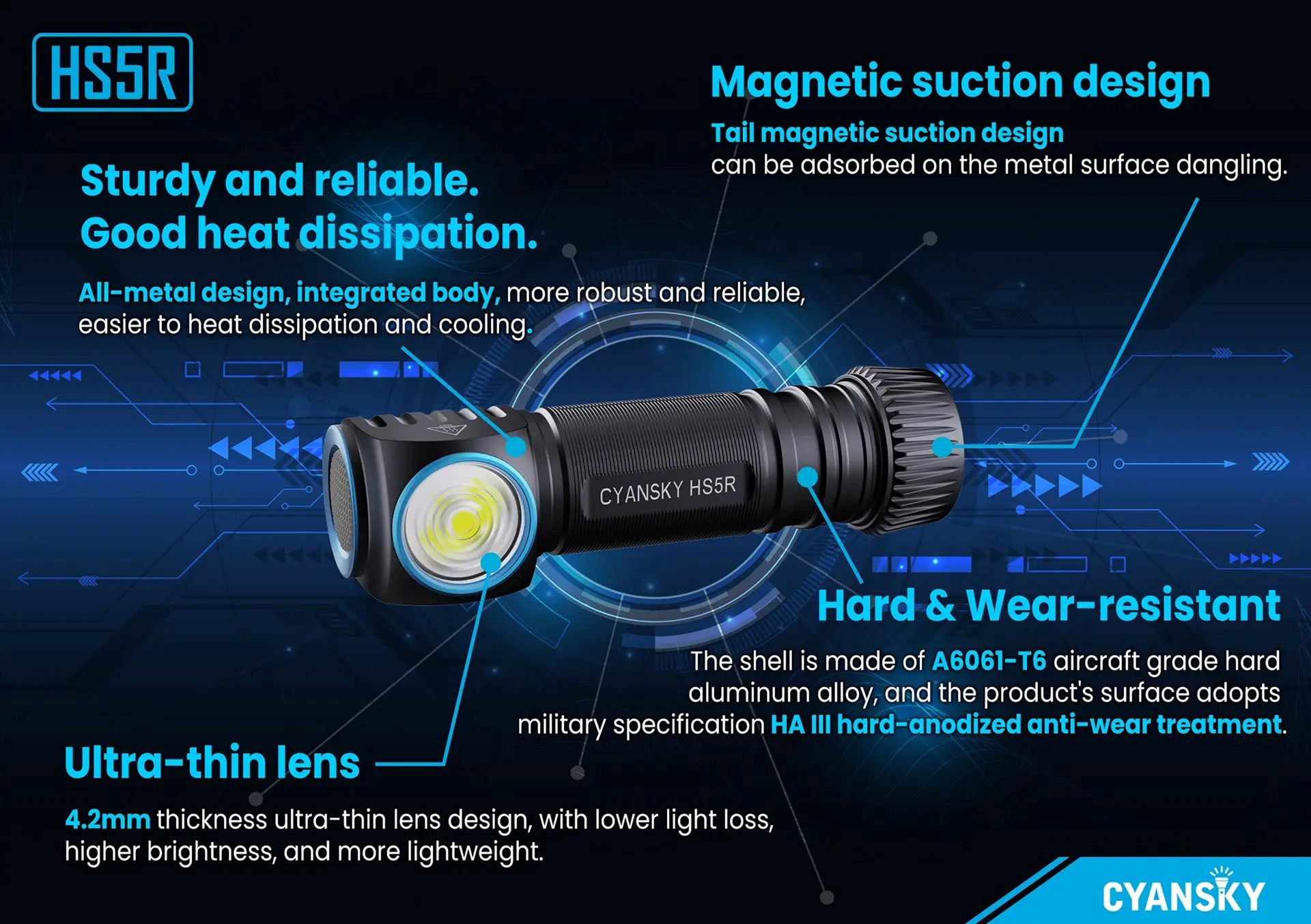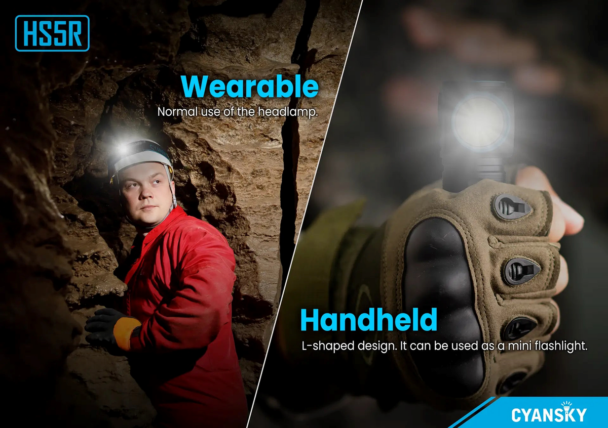 The Cyansky HS5R is multi-light red and white headlamp designed for outdoor sports, industrial work, repair, and camping. The Lightweight metal shell, L-shaped design is IPX8 waterproof with a ultra-thin lens, and a max of 1300 lumens high brightness. Features a multi-mode white spotlight, red light; single electronic button to control different light sources, electronic anti-reverse connection, compatible with convex and flat 18650 battery power, support TYPE-C charging. Wider headlamp strap to wear more stable. It can meet your lighting needs in different environments.
