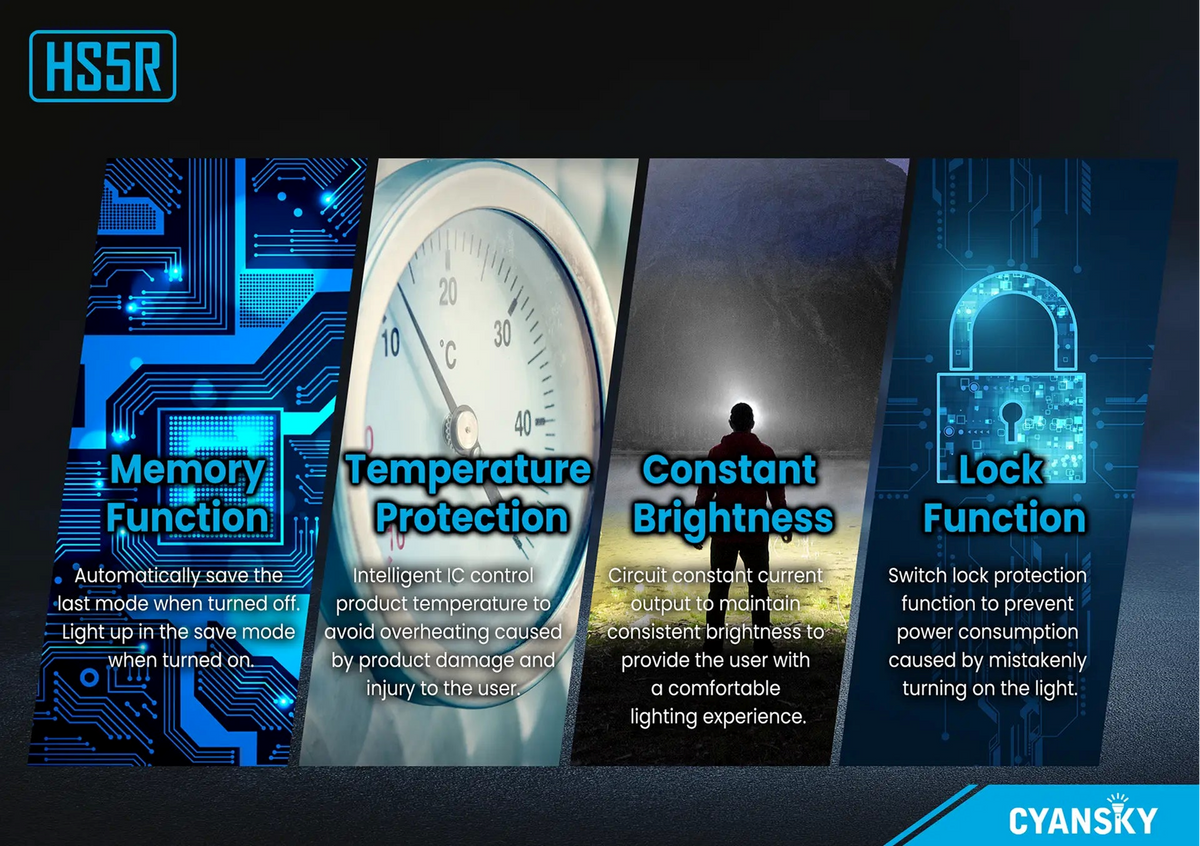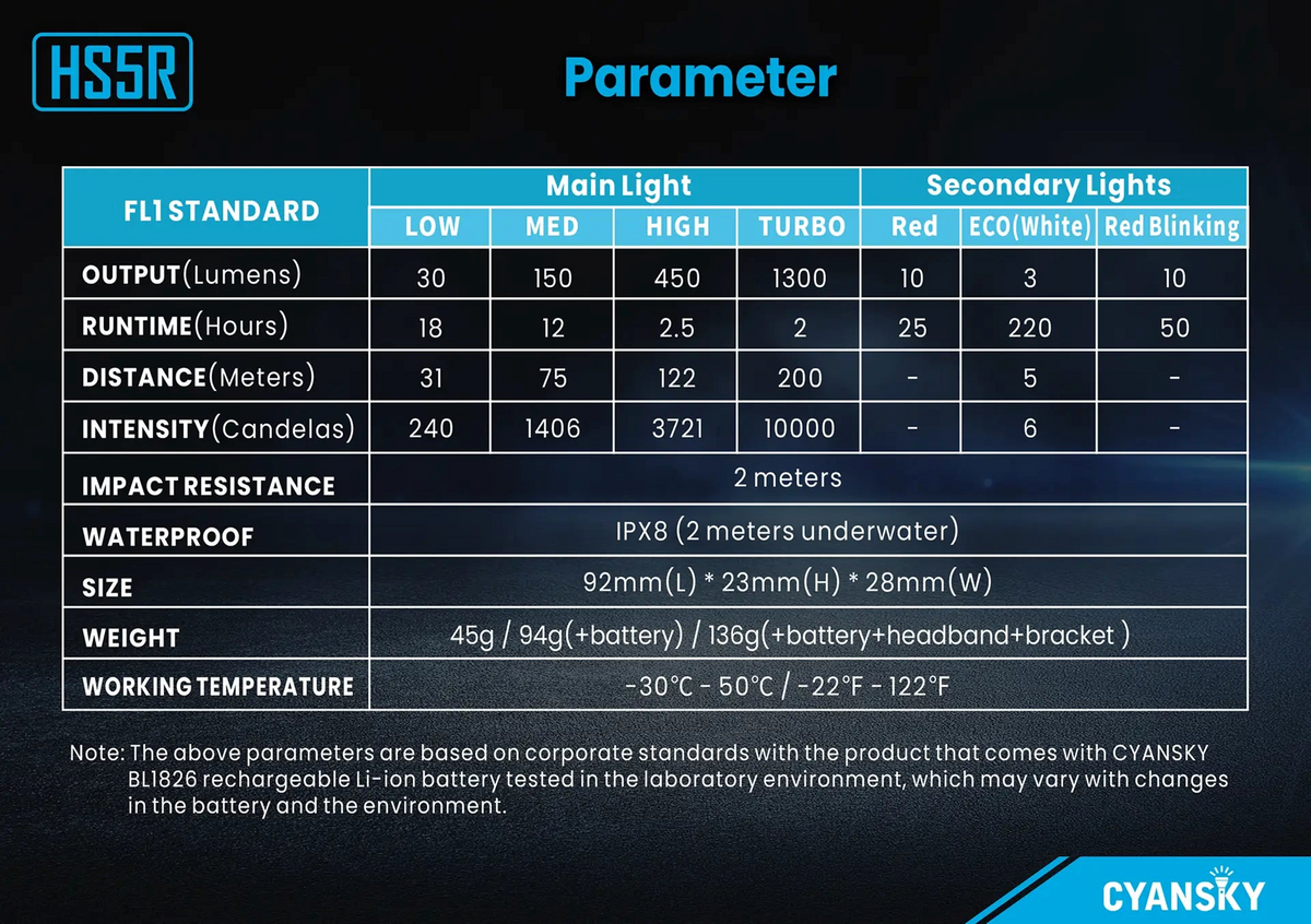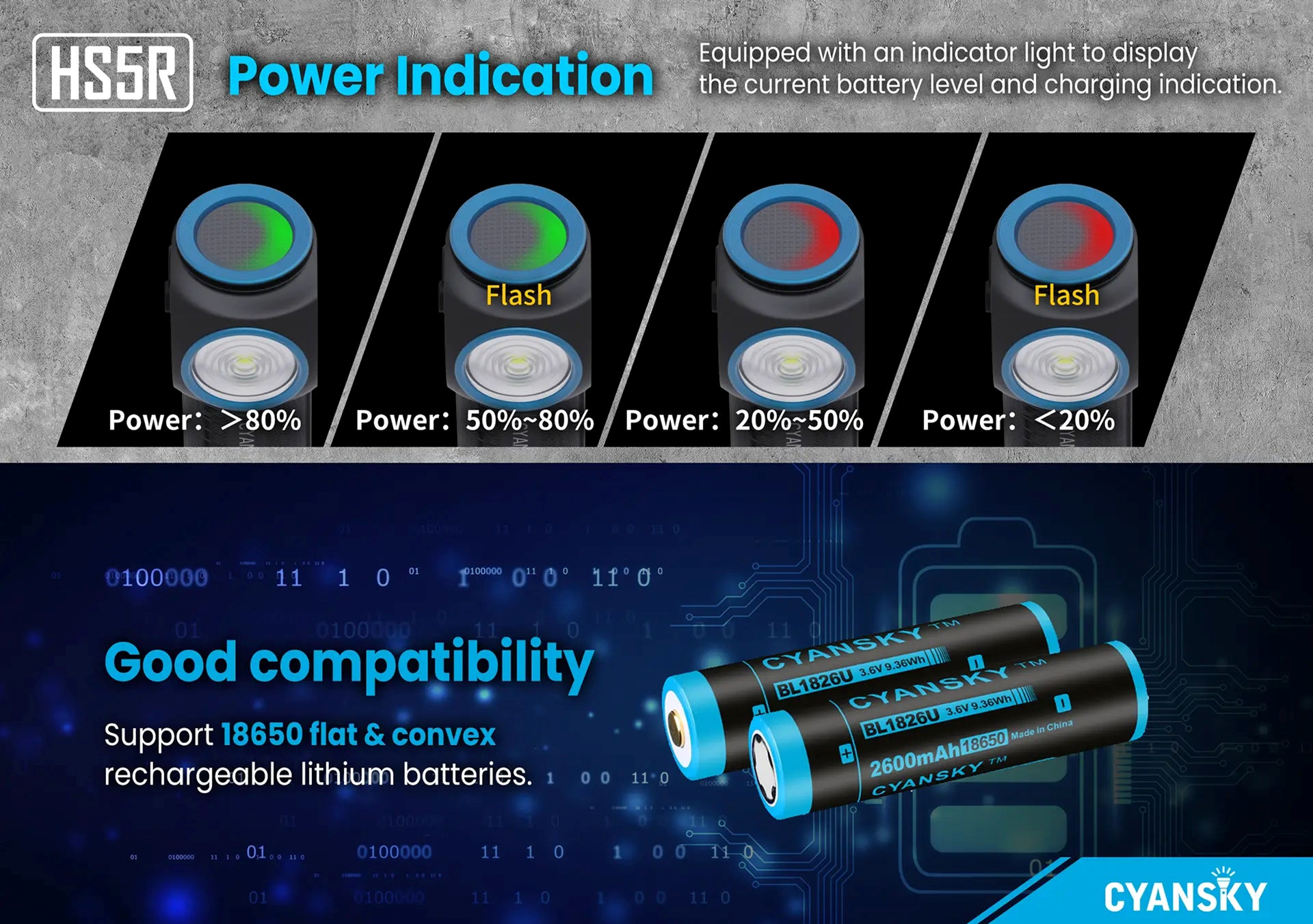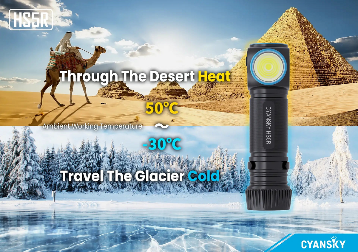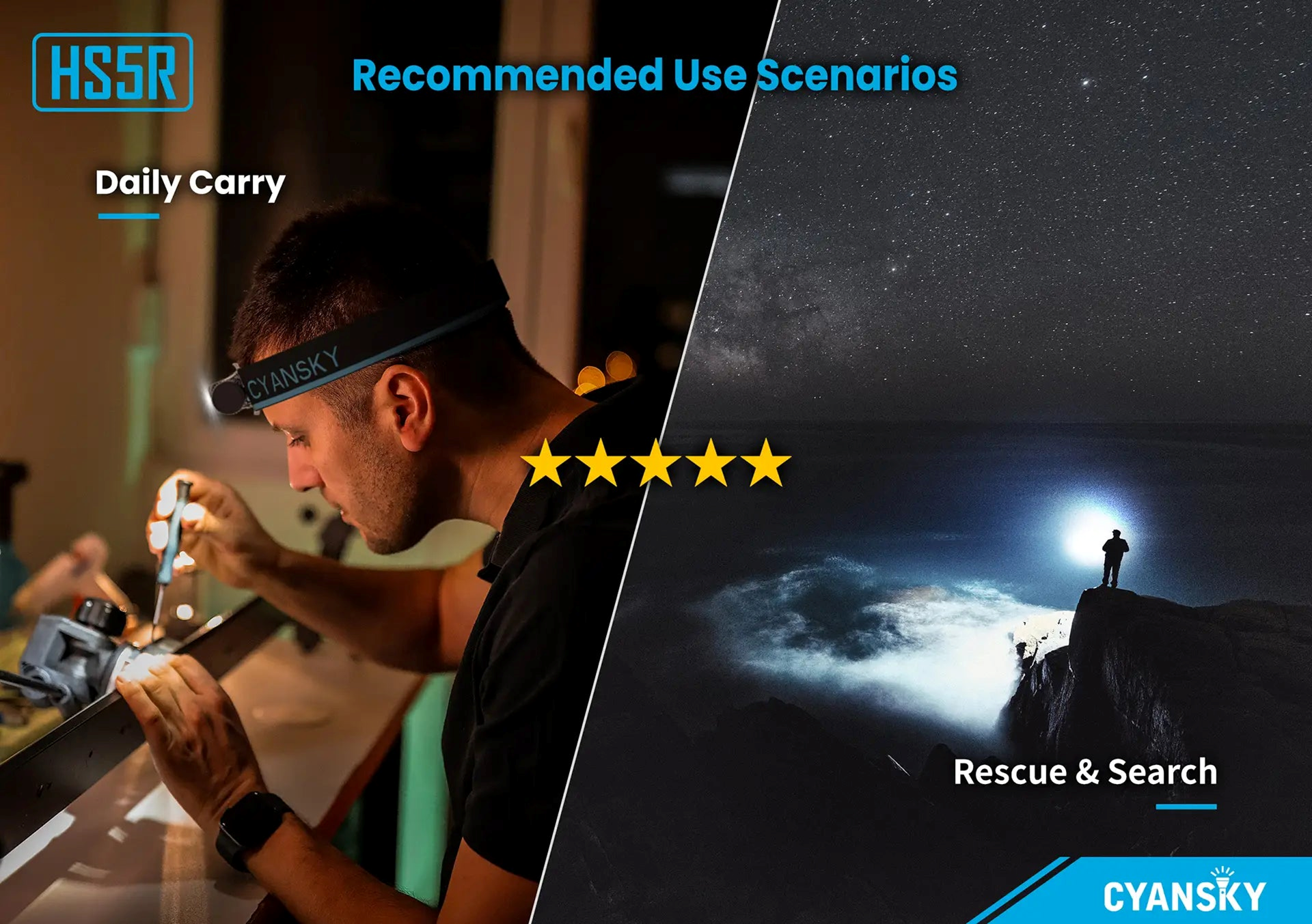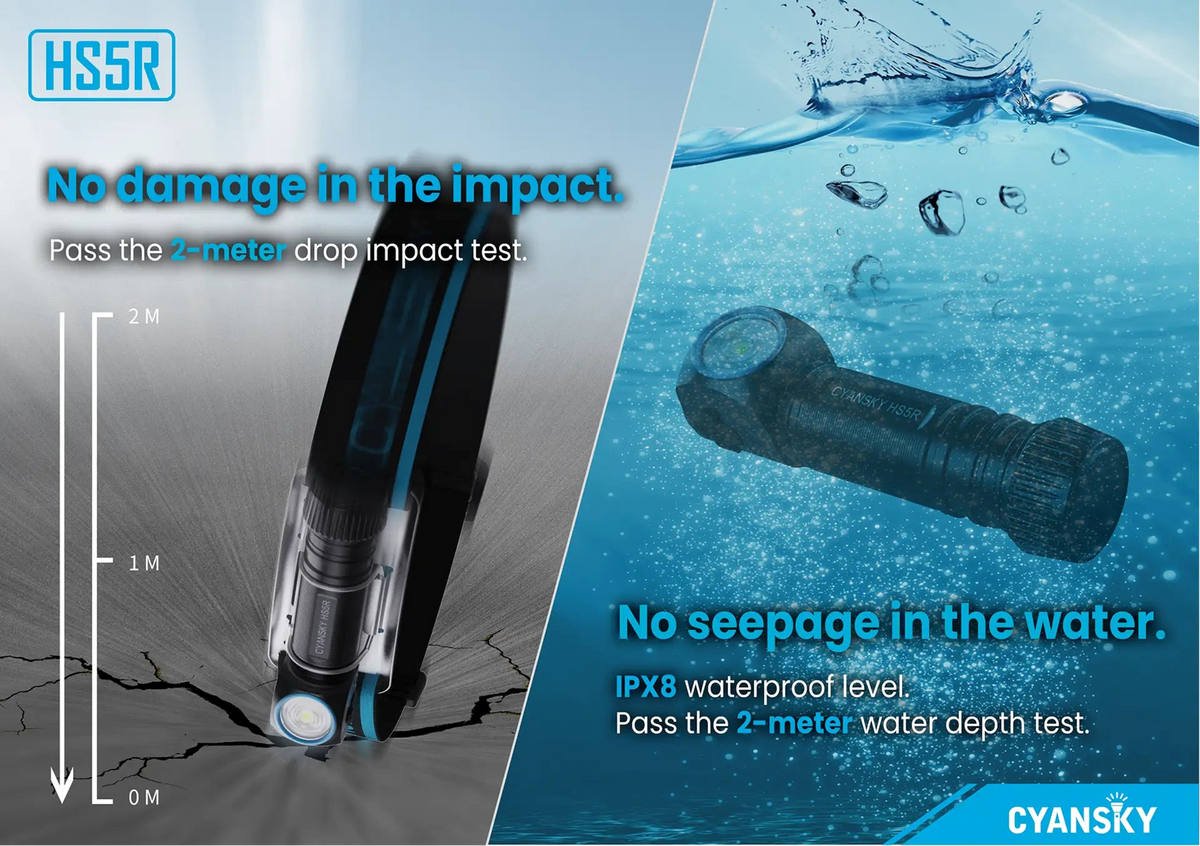The Cyansky HS5R is multi-light red and white headlamp designed for outdoor sports, industrial work, repair, and camping. The Lightweight metal shell, L-shaped design is IPX8 waterproof with a ultra-thin lens, and a max of 1300 lumens high brightness. Features a multi-mode white spotlight, red light; single electronic button to control different light sources, electronic anti-reverse connection, compatible with convex and flat 18650 battery power, support TYPE-C charging. Wider headlamp strap to wear more stable. It can meet your lighting needs in different environments.