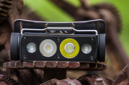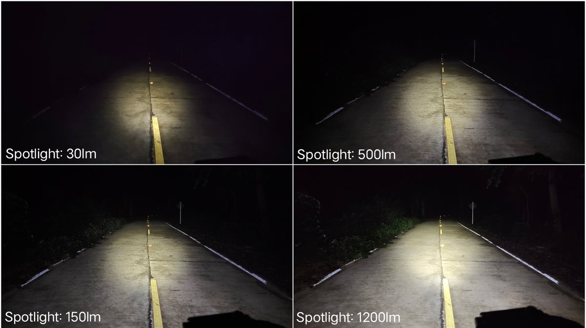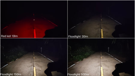 The main light beams a white spotlight with 30-1200 lumens from low to turbo mode great for long-range searching and exploring, an auxiliary warm white floodlight for camping, hiking, running, reading and industrial operations without hurting your eyes, while the auxiliary red light is same for reading and simple activities and keeping mosquitos away. 1400 lumens can be reached with the main white light and auxiliary white light on.