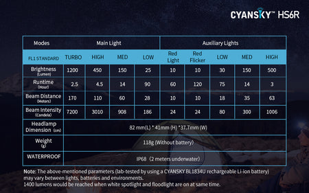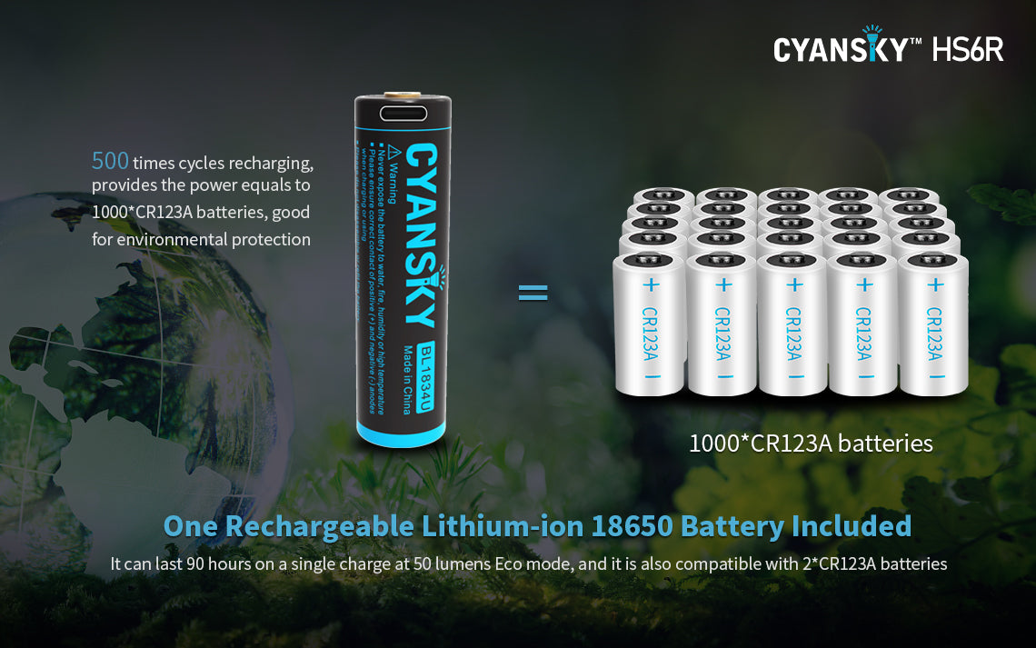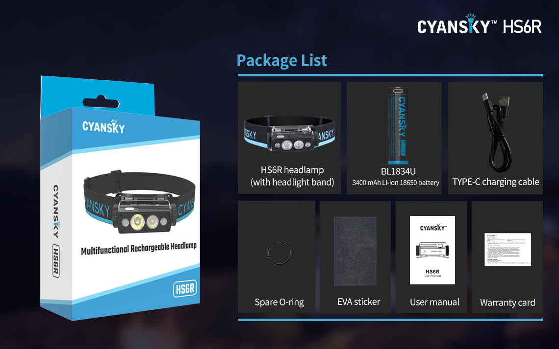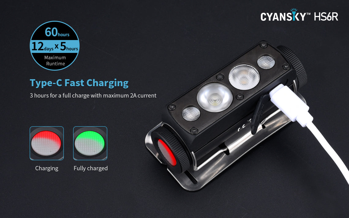 Cyansky HS6R is a rechargeable headlamp device with Type-C fast charging. It costs three hours per full charge.