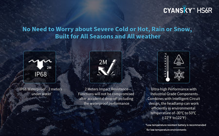 The powerful LED headlamp is shelled with the hard aluminum alloy with an anodized finish, 2-meter impact resistance, IPX8 waterproof (2-meter Submersible) and works under -30~50 centigrade environment.