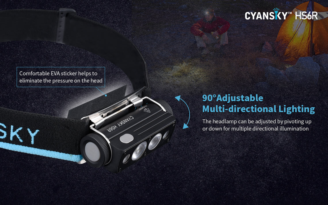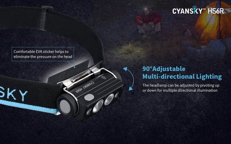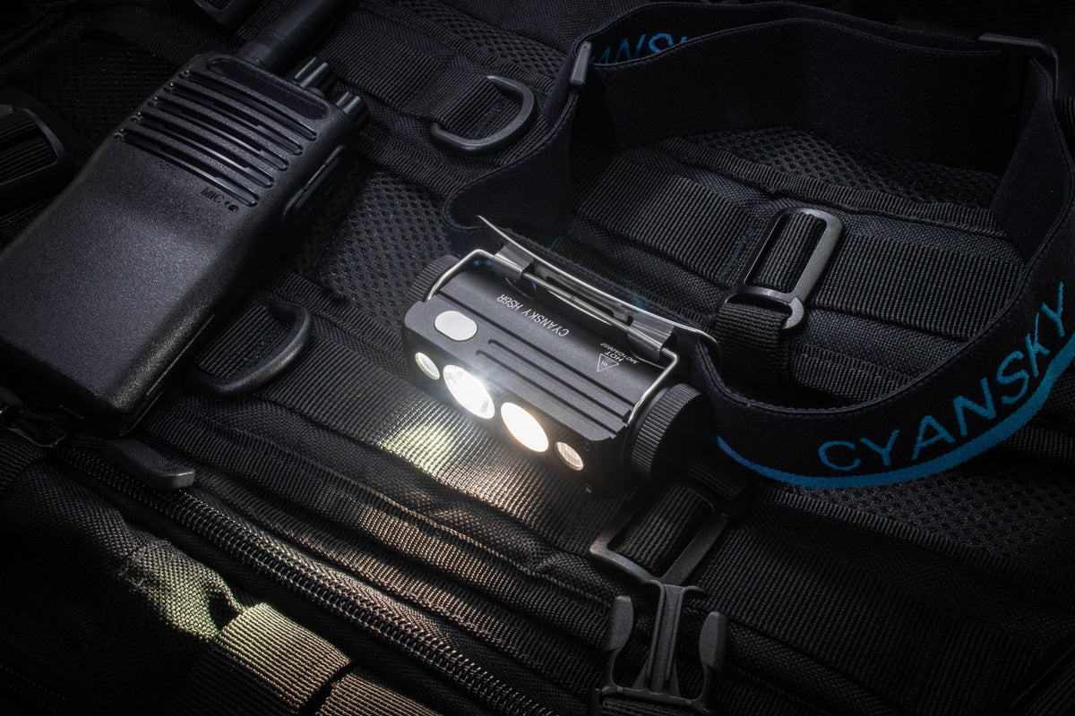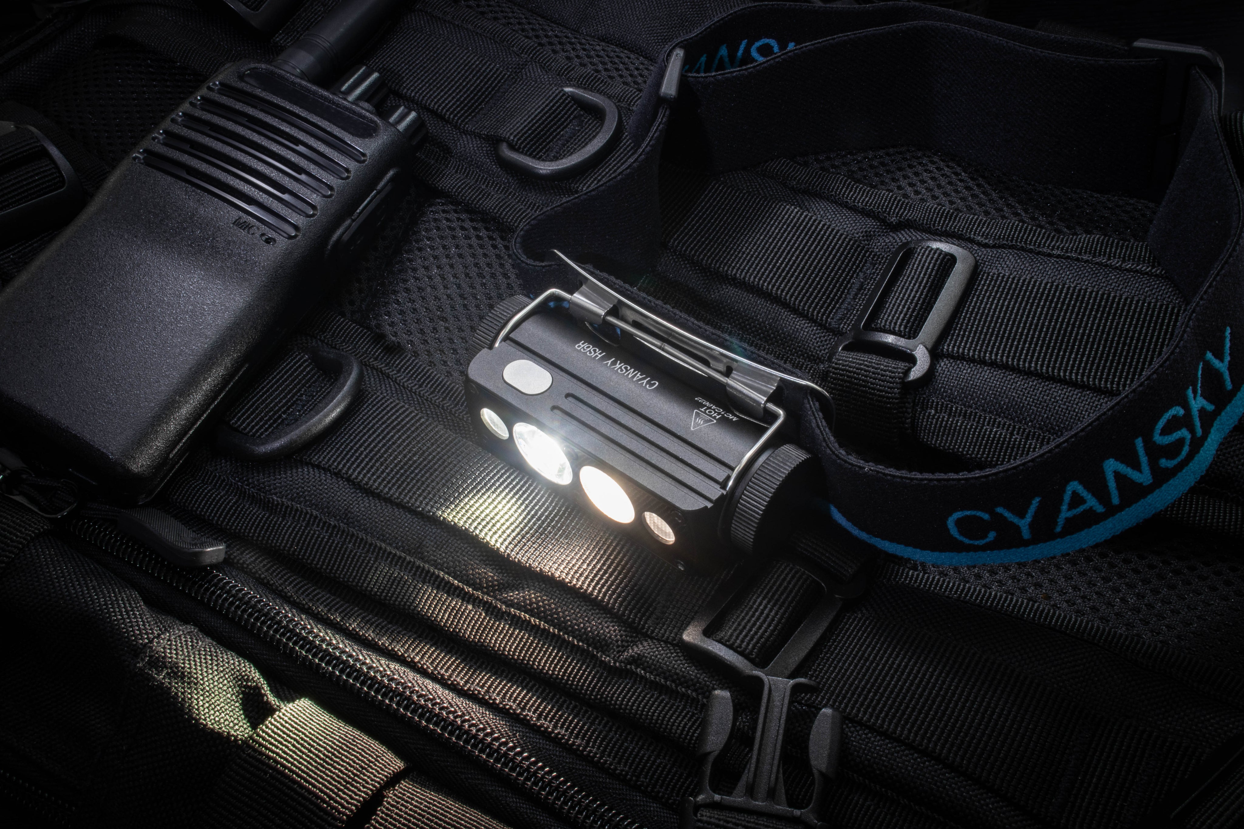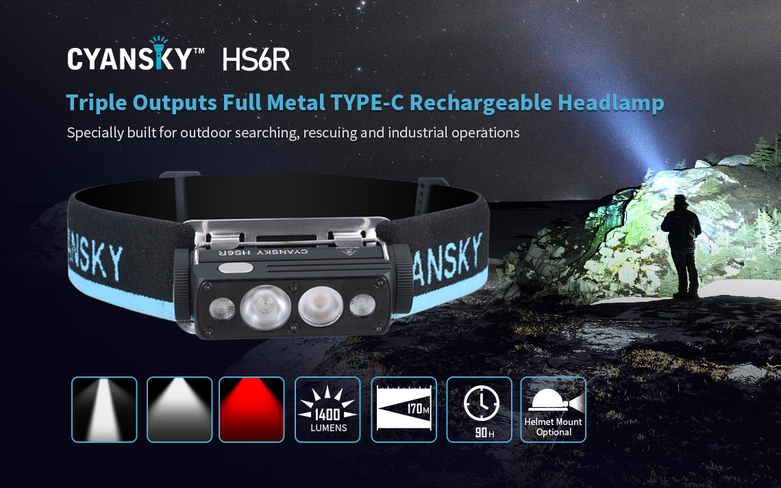 The Cyansky HS6R LED rechargeable headlamp beams triple output especially for outdoor searching and rescuing activities, and industry operation.
