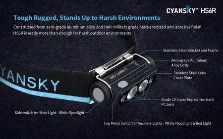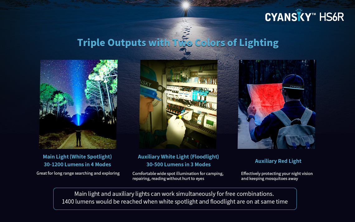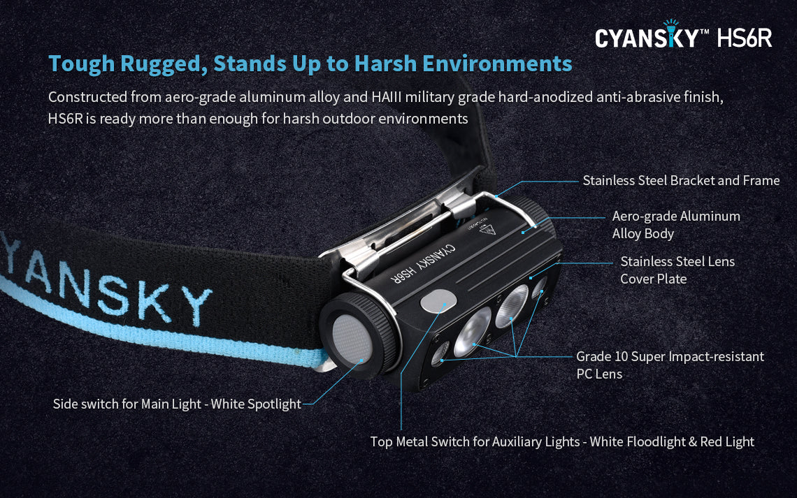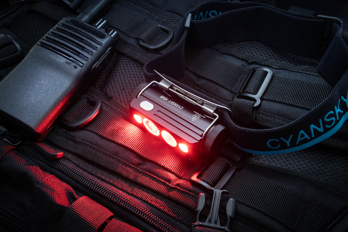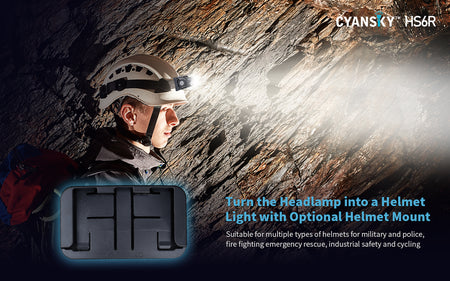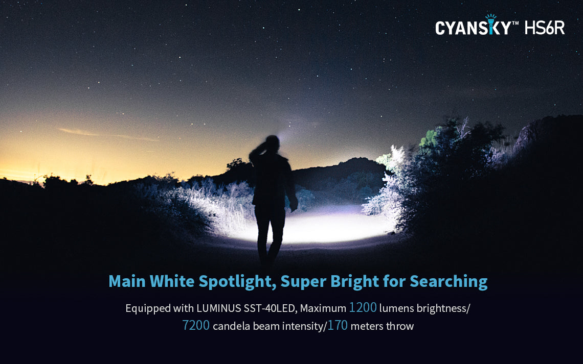 The Cyansky HS6R LED rechargeable headlamp beams triple output especially for outdoor searching and rescuing activities, and industry operation.