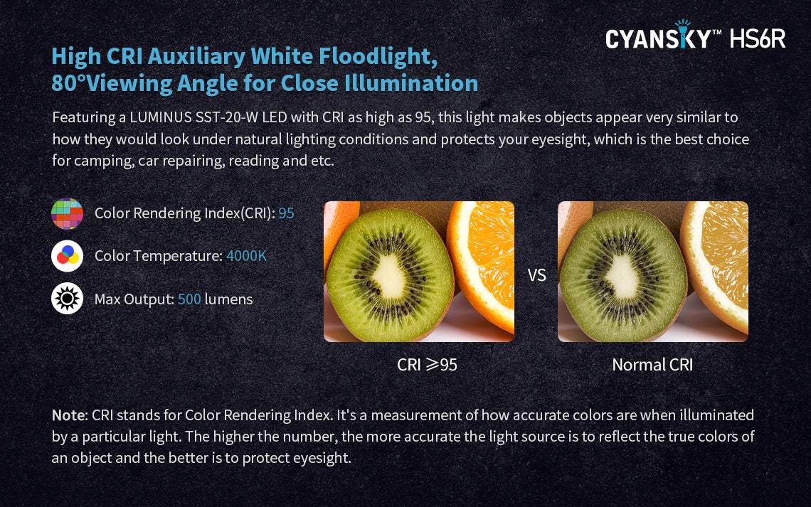 Its auxiliary white light beams warm white floodlight with high 95 CRI, best for camping, car preparing and reading, etc.