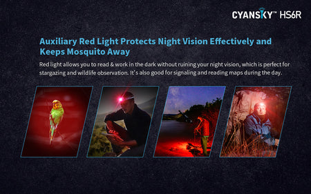The HS6R’s auxiliary red light protects the night vision effectively and keeps mosquitos away, good for reading, working, wildlife observation and signals alert.