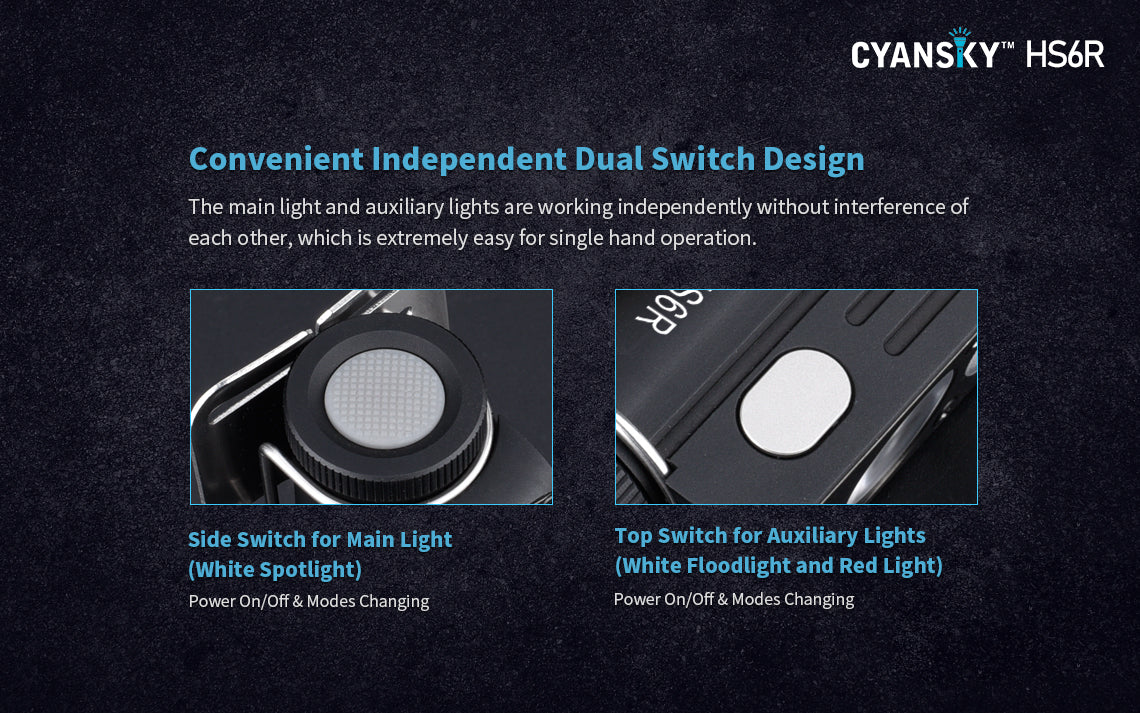 Different from other model LED flashlights from Cyansky Light, the side switch and top switch of the LED headlamp controls the main light and auxiliary lights separately, easy for one hand operation.