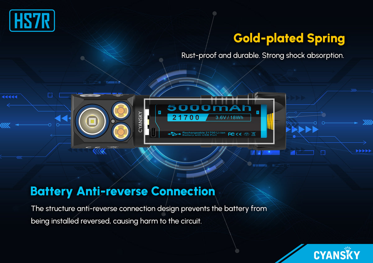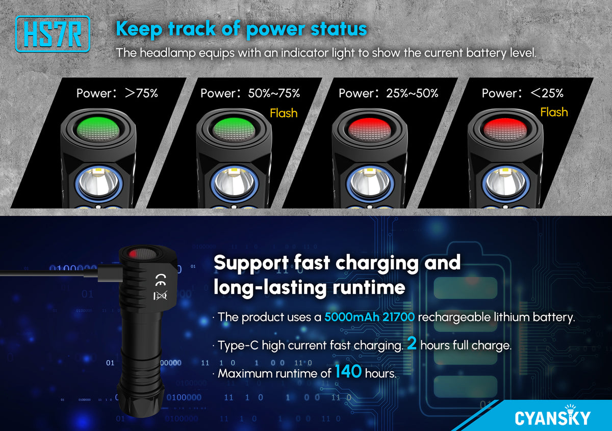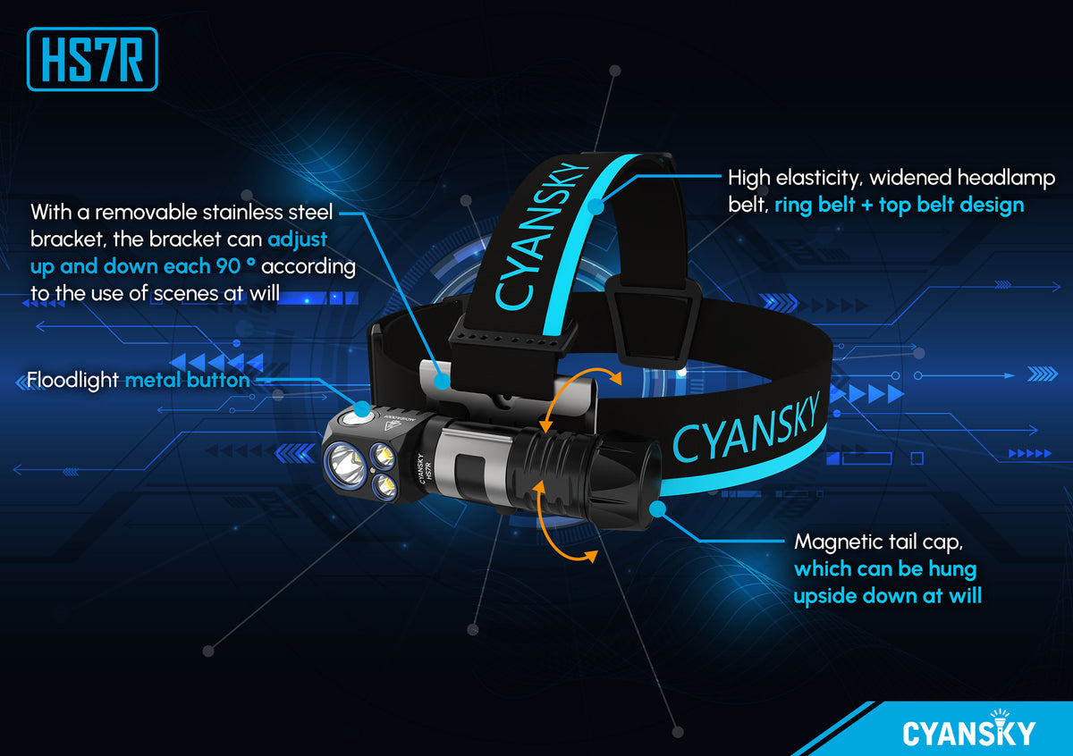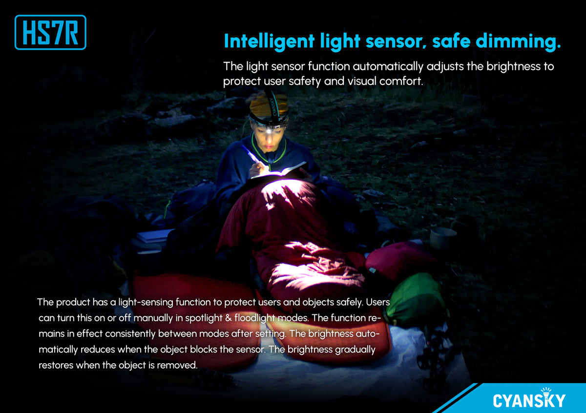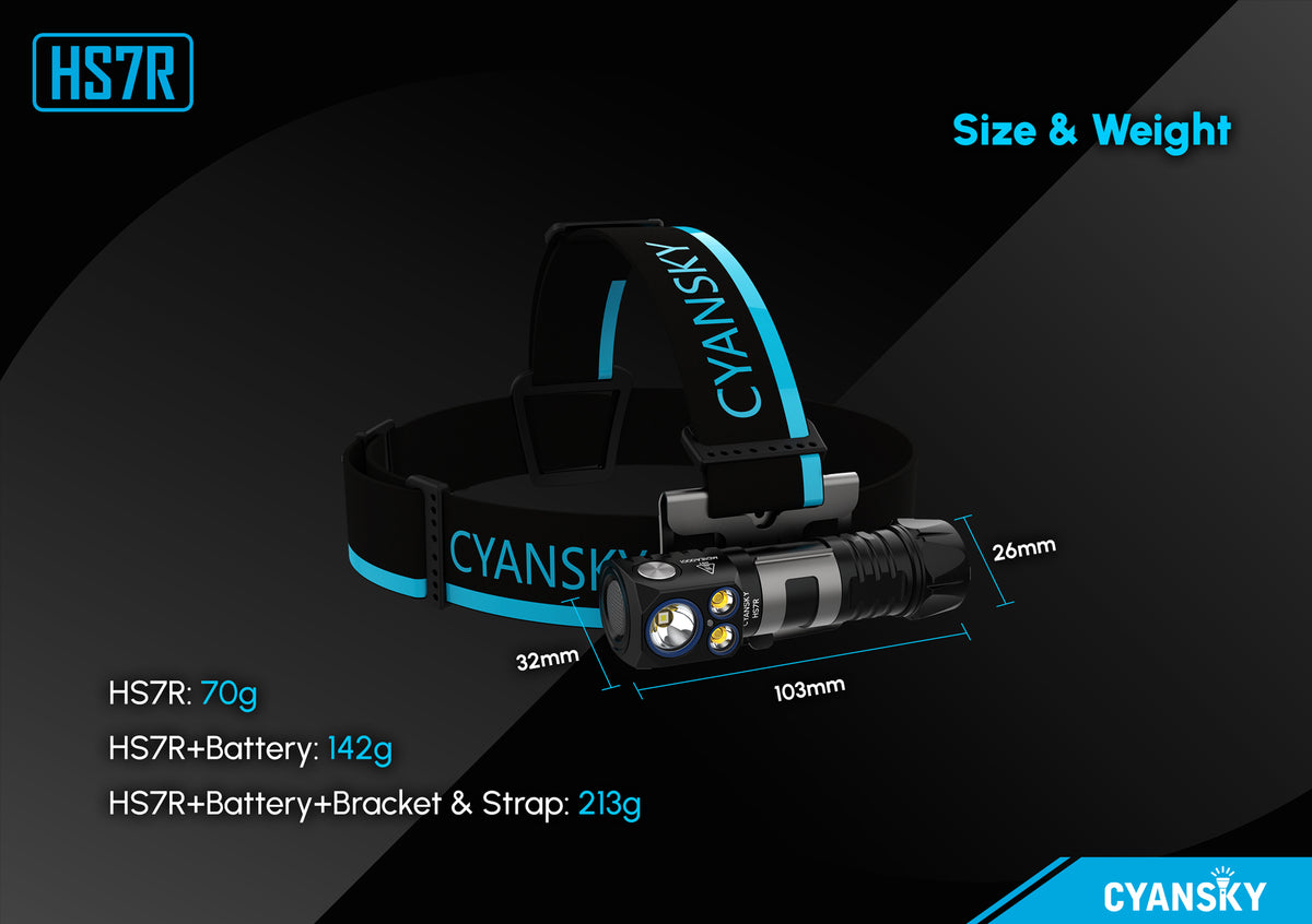 The HS7R headlamp is a rechargeable high-performance headlamp with various practical functions powered by a 21700 lithium battery. The HS7R has high-quality LED lights and provides spotlight and floodlight modes. The spotlight mode can output up to 2800 lumens, and the floodlight mode can output up to 2000 lumens. With multiple modes, you can easily switch to adapt to different scenarios. The multiple color temperature options also provide a comfortable, natural, and precise light source, making it suitable for outdoor adventures and industrial operations, providing you with an excellent visual experience. The HS7R headlamp has robust performance. It comes with a detachable stainless-steel bracket and a widened headband, which can be easily worn and removed, and held comfortably in hand. The headlamp has an IP68 waterproof and dustproof rating and has passed a 2-meter drop test. Regarding safety, the HS7R headlamp integrates intelligent temperature control and light sensing adjustment to ensure a worry-free lighting experience during use. With practicality and innovative design, the HS7R multifunctional rechargeable headlamp will add brilliance to any adventure or task.
