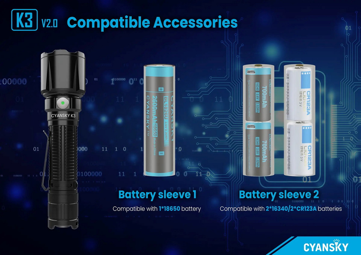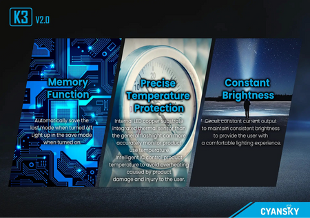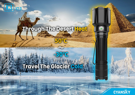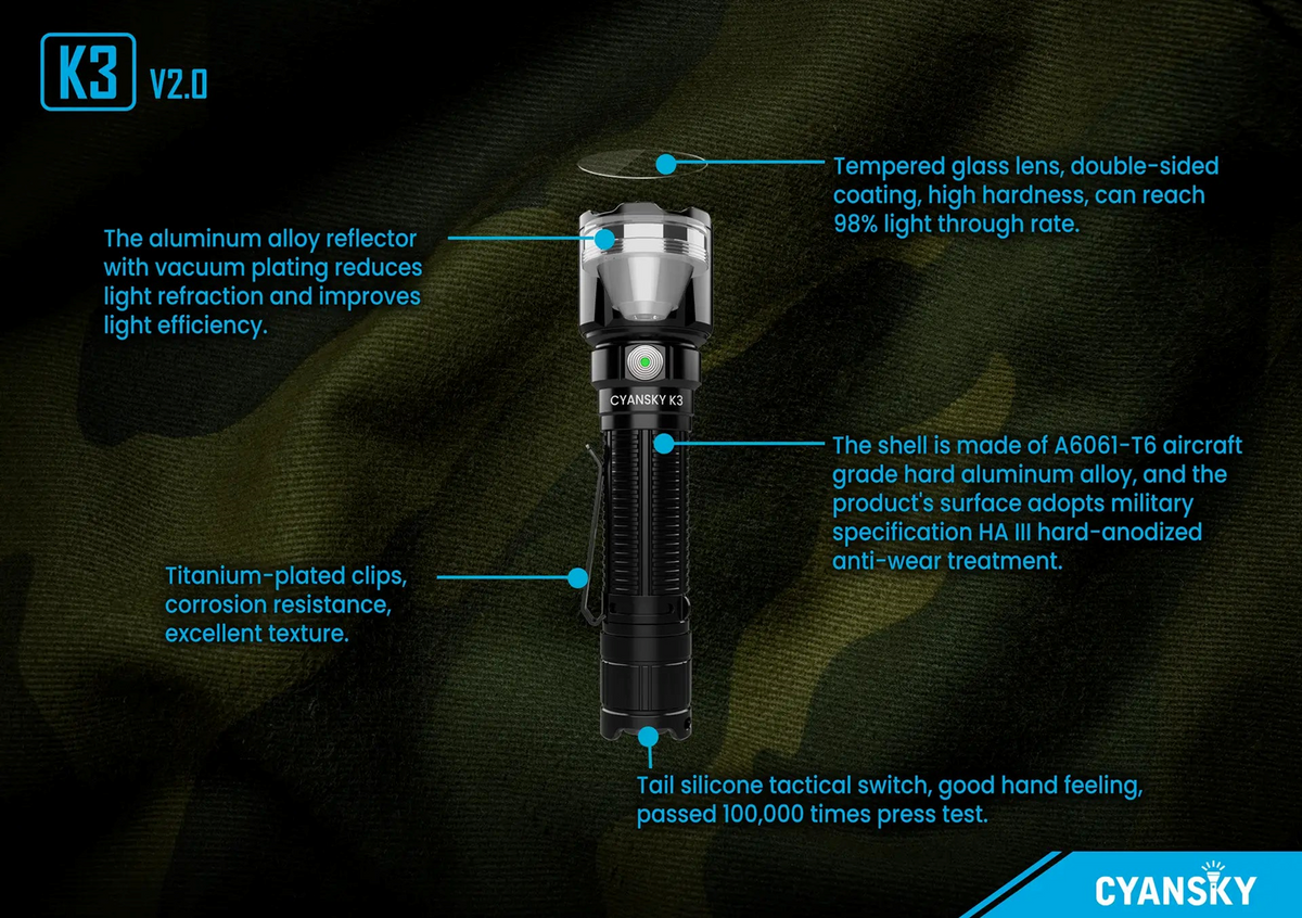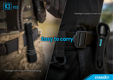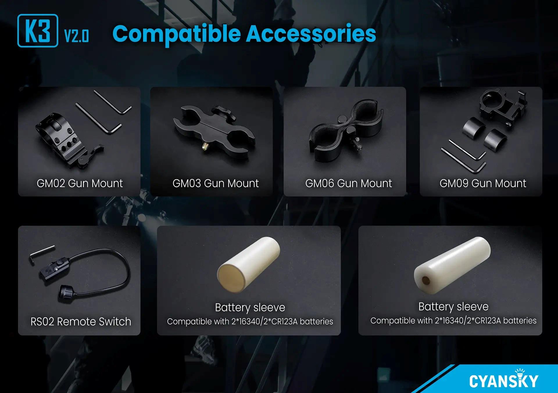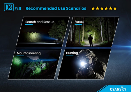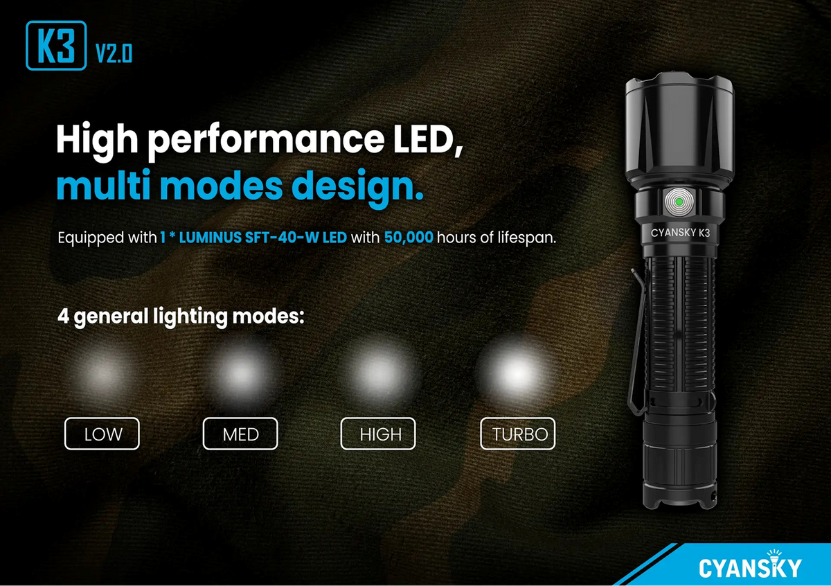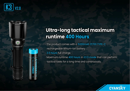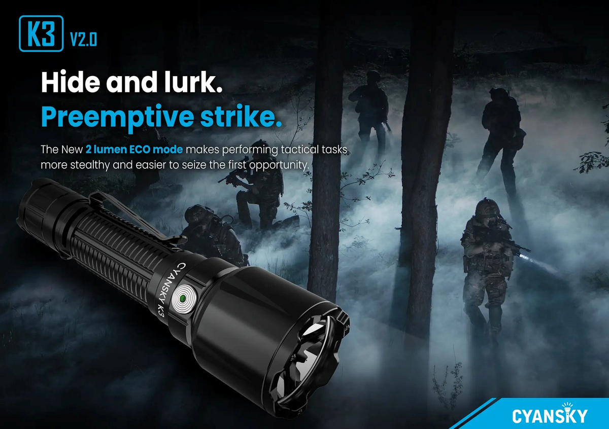 The Cyansky K3 V2.0 is a high-brightness, high-performance, ultra-long-range tactical flashlight. It is designed for military and police, law enforcement, tactical, patrol, search and rescue, etc. K3 V2.0 uses Luminus SFT-40-W LED, with a maximum brightness of 2000 lumens, a maximum distance of 700 meters, and a maximum runtime of 400 hours. It's designed with general mode with four brightness levels, ECO mode, and strobe mode. The product uses the classic tactical attack shell design, equipped with high-hardness zirconium beads, which can easily smash the glass and execute tactical missions. In addition, the optional gun mounts or remote switches can meet the needs of tactical use in different scenarios.