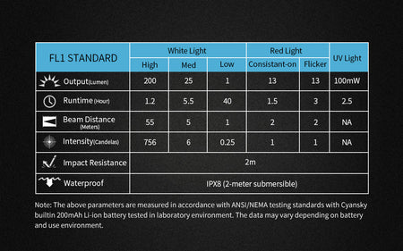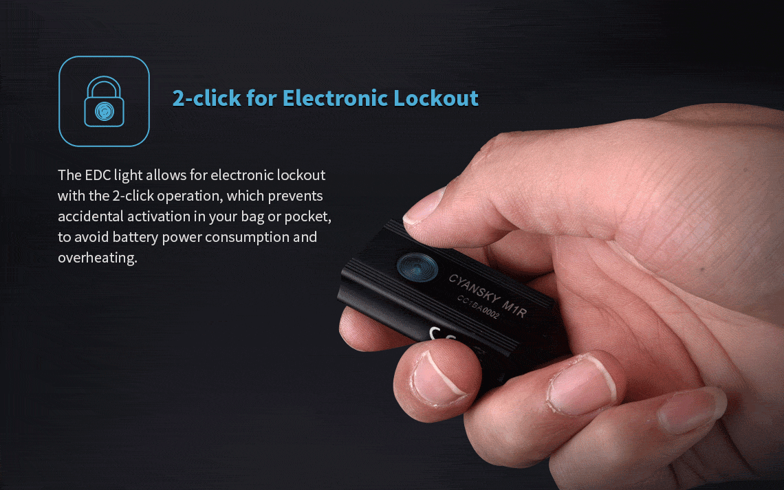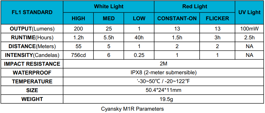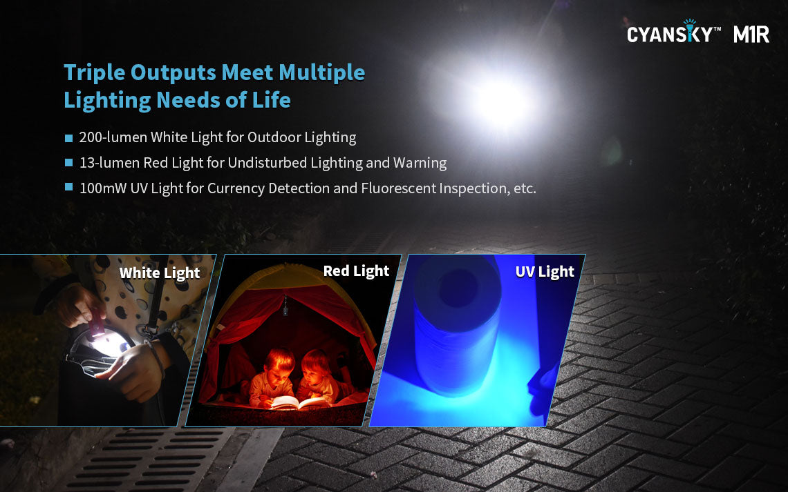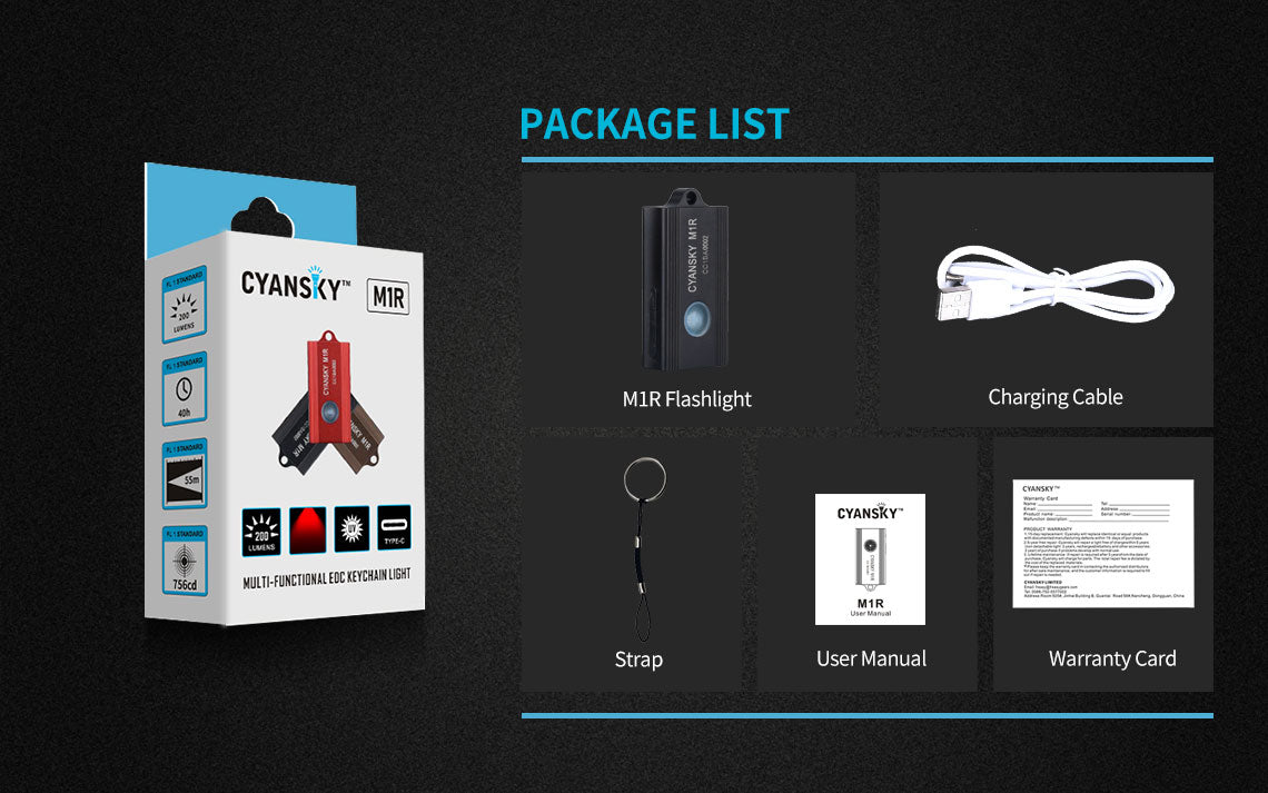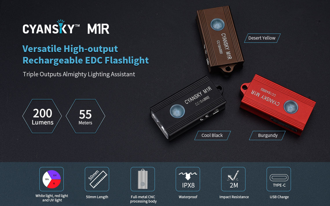 The Cyansky M1R is a multi-functional rechargeable EDC keychain light equipped with one built-in 200mAh Li-ion battery. It adopts a one-switch control design but with triple output of cool white light, red light, and UV light, allowing for multi-functions in various scenarios. The keychain light features IPX8 waterproof and 2 meters impact resistance, capable of all-weather use. The M1R light is the almighty light assistant for everyday carry.