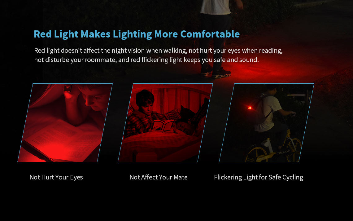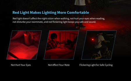 Red/UV light: with light on, single click the switch to cycle through Red→Red Flash→UV.