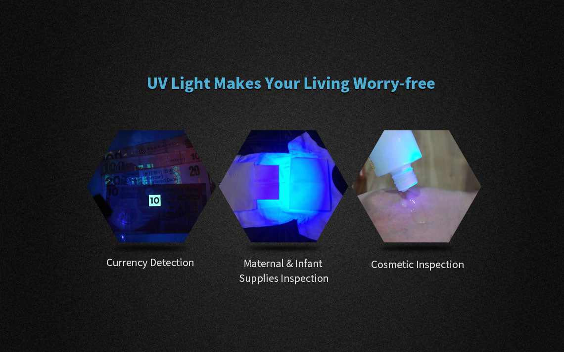 You don’t want to get nothing just because get a piece of fake banknote you can recognize, right? The UV is functional to detect the fake banknote to avoid further loss. What’s more, you can inspect whether your kid’s diaper, clothes or cosmetics is added too much fluorescent brightener.