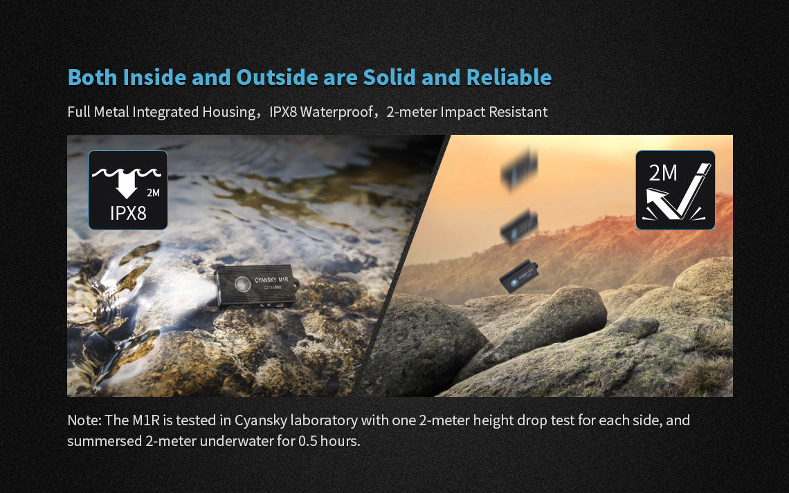 - Weatherproof: IPX8 Waterproof; 2 meters Impact-resistance; -30~50 centigrade working temperature