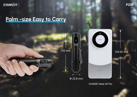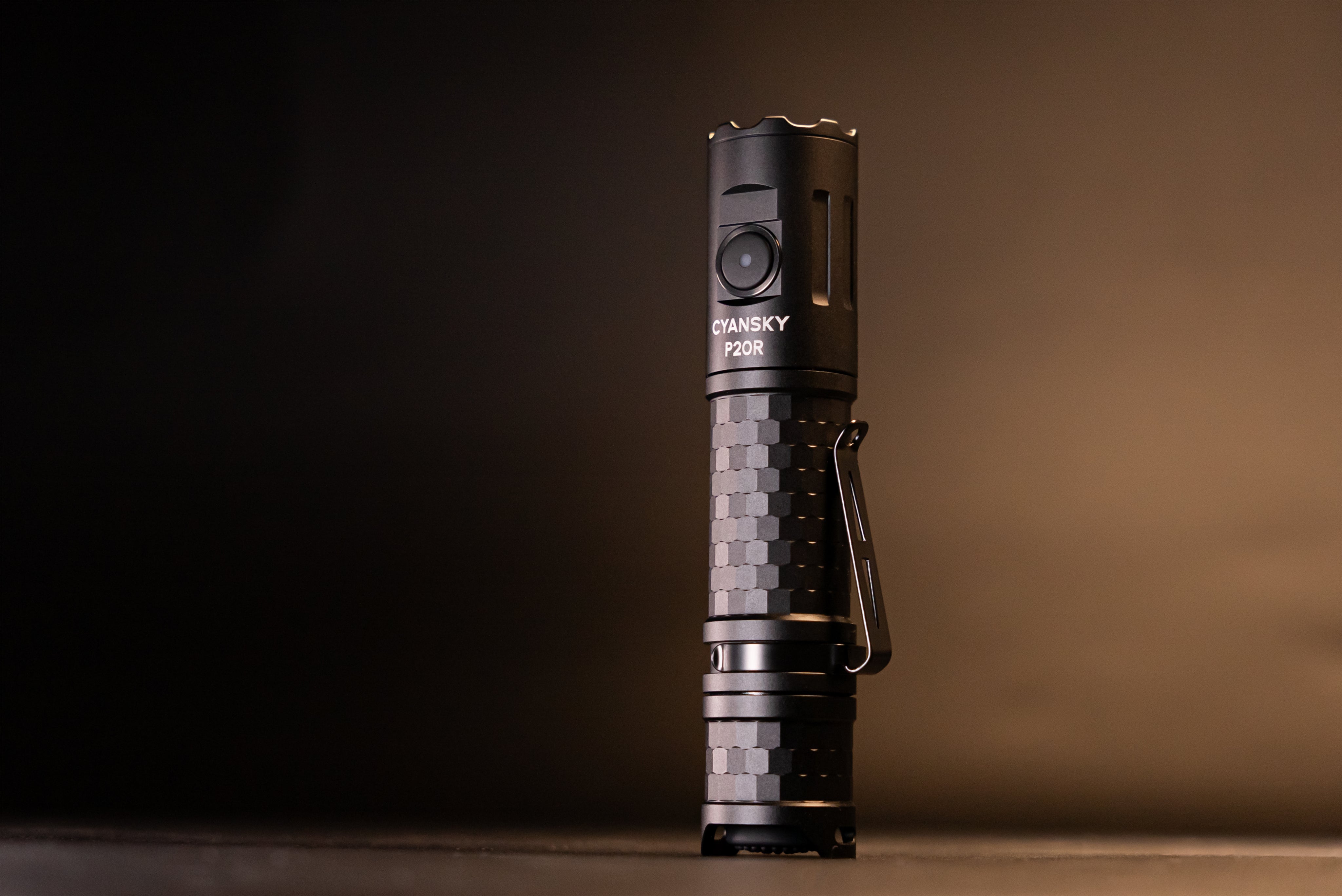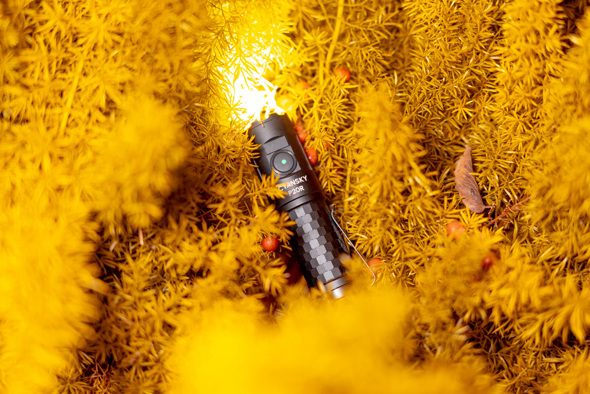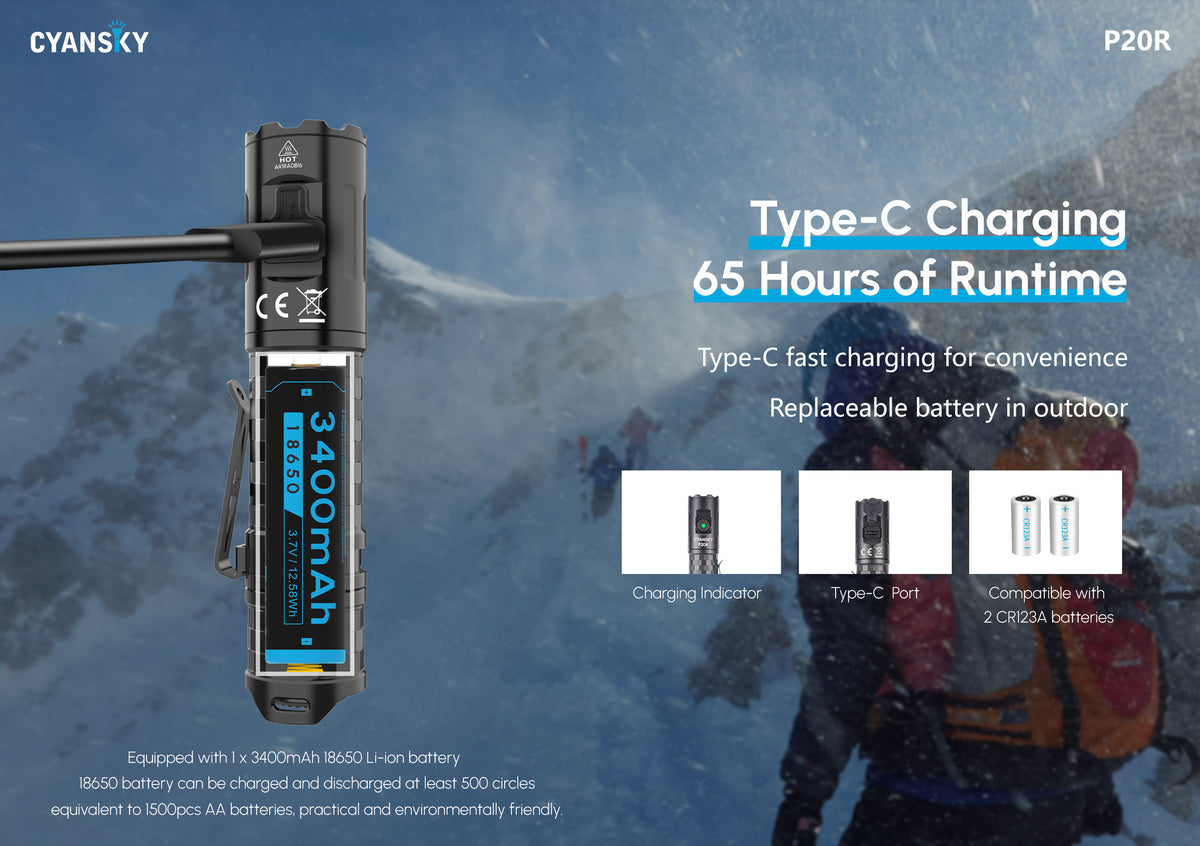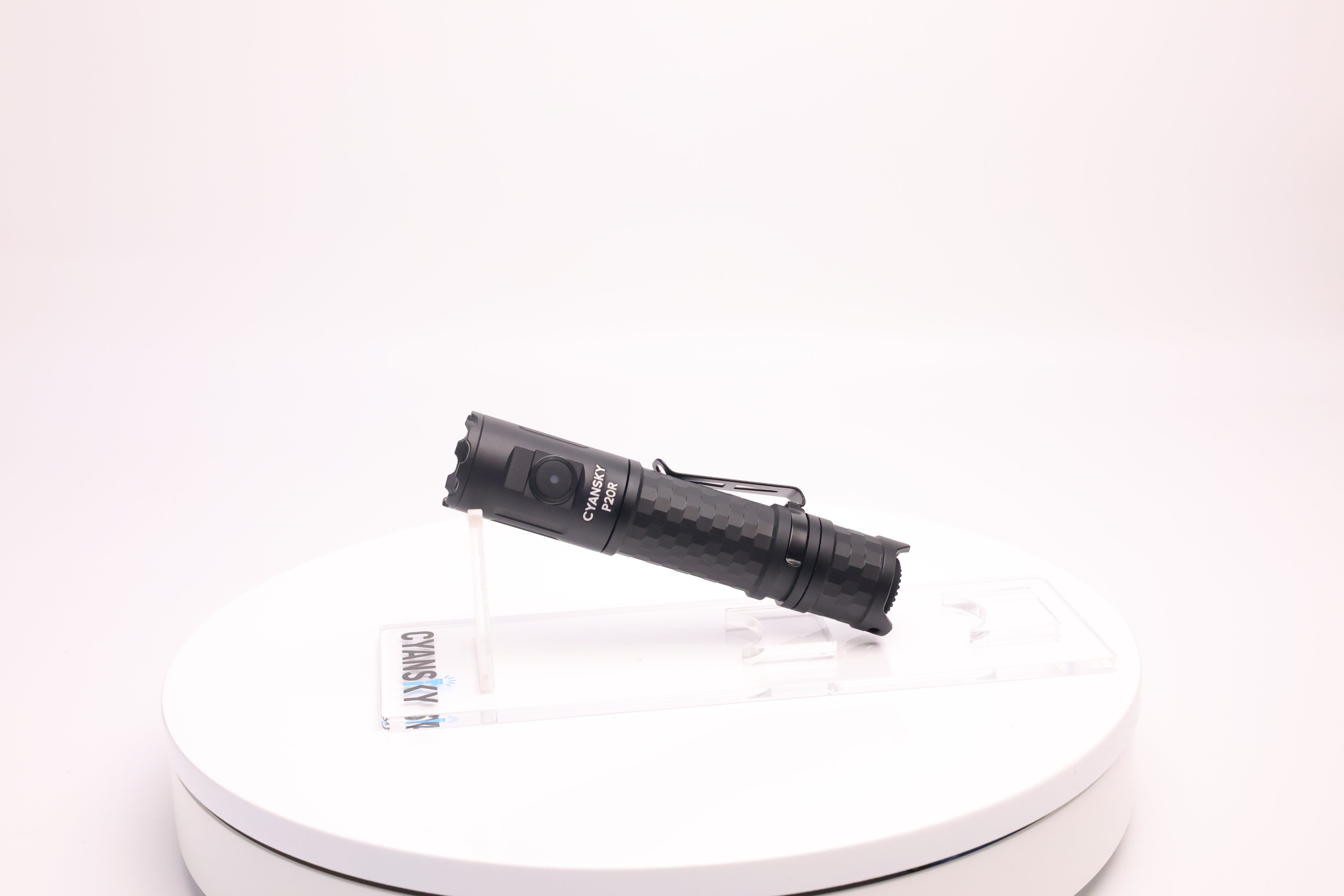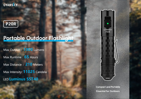 The CYANSKY P20R is a portable outdoor flashlight with a maximum brightness of up to 1900 lumens and a remarkable runtime of up to 65 hours. It features four different brightness levels, as well as strobe and SOS modes, catering to various lighting scenarios. The P20R boasts an IP68 protection rating and can withstand drops from a height of 1.5 meters, offering robust durability. Equipped with a standard 3400mAh 18650 battery, it supports USB Type-C fast charging and features a tail switch for power control and a side switch for mode adjustment. The compact design allows for easy one-handed operation, and the included unidirectional pocket clip ensures convenient carrying. With a rugged all-metal body that is both waterproof and shockproof, the CYANSKY P20R guarantees reliable quality.