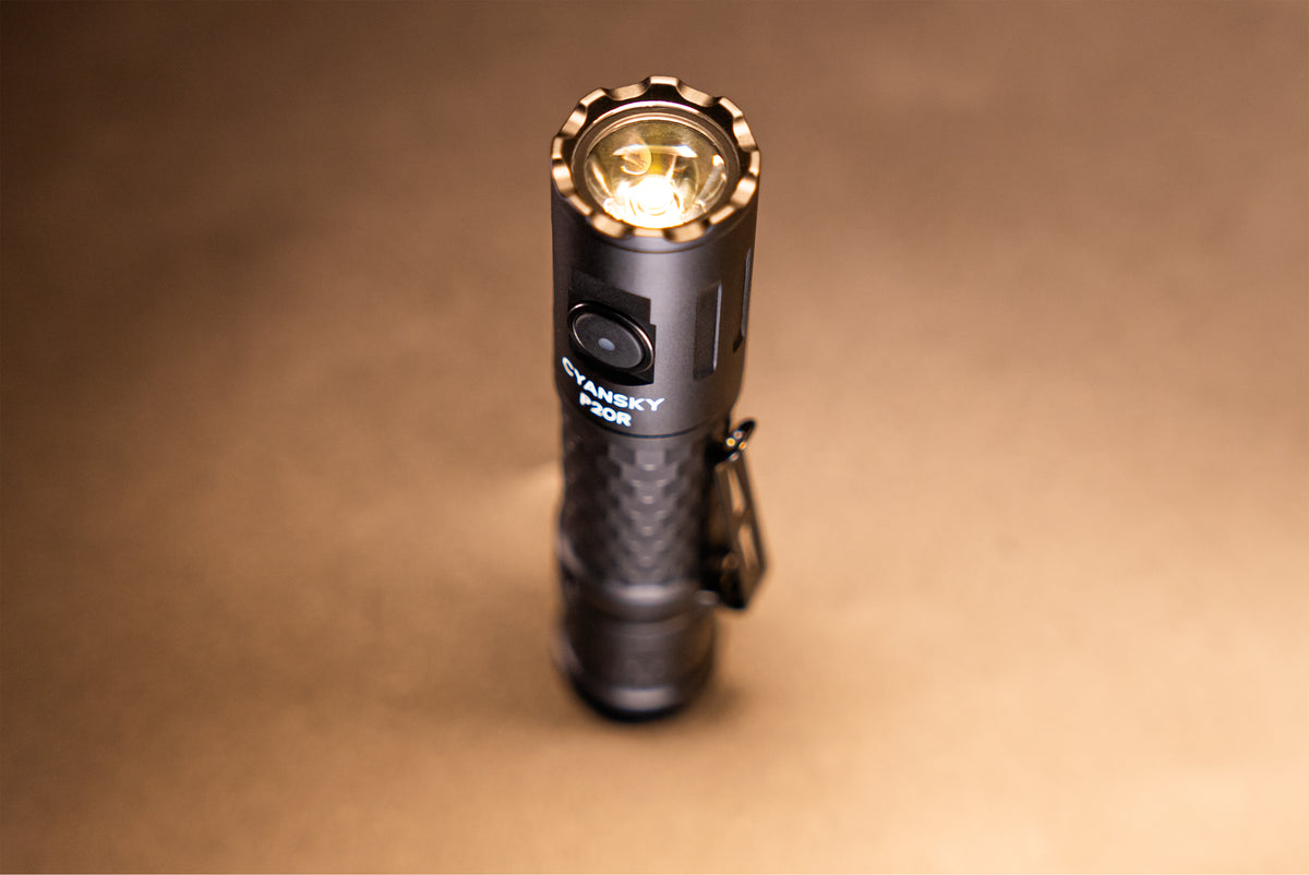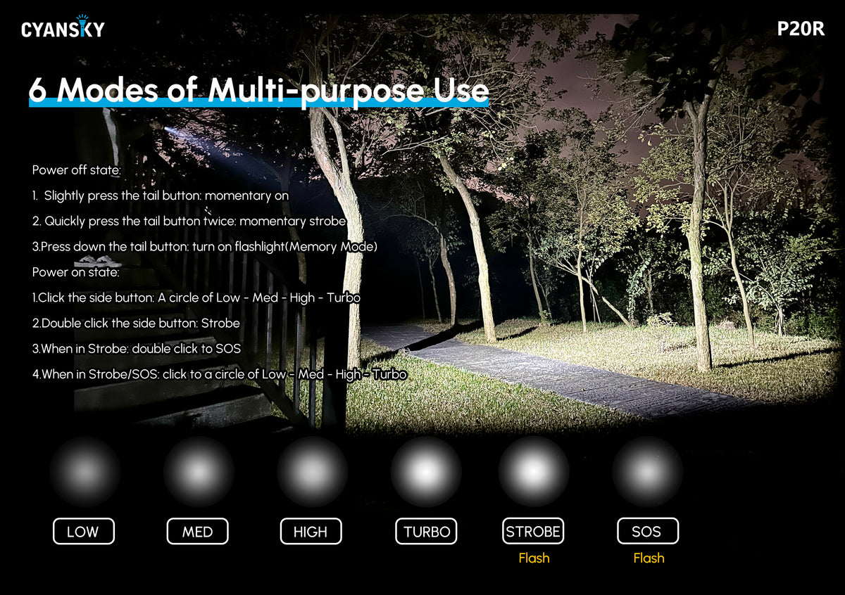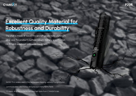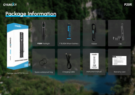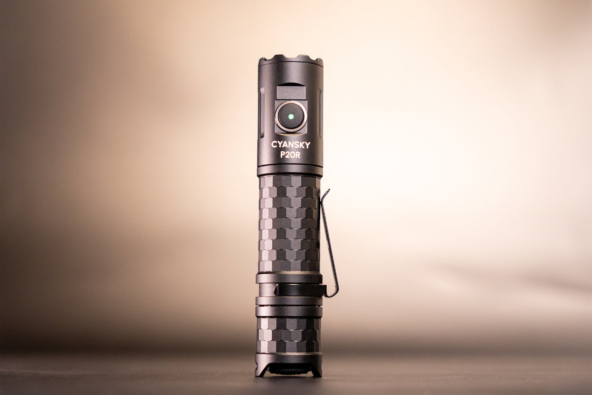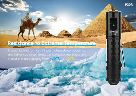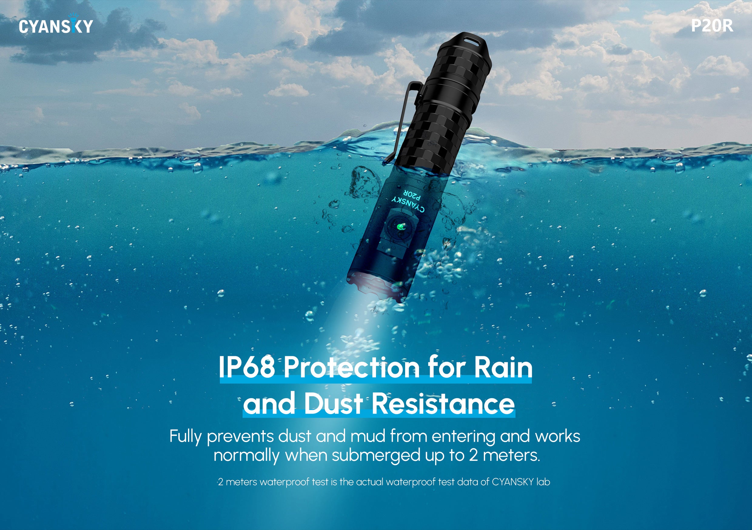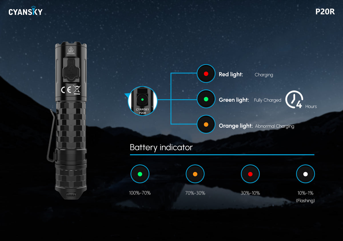 The CYANSKY P20R is a portable outdoor flashlight with a maximum brightness of up to 1900 lumens and a remarkable runtime of up to 65 hours. It features four different brightness levels, as well as strobe and SOS modes, catering to various lighting scenarios. The P20R boasts an IP68 protection rating and can withstand drops from a height of 1.5 meters, offering robust durability. Equipped with a standard 3400mAh 18650 battery, it supports USB Type-C fast charging and features a tail switch for power control and a side switch for mode adjustment. The compact design allows for easy one-handed operation, and the included unidirectional pocket clip ensures convenient carrying. With a rugged all-metal body that is both waterproof and shockproof, the CYANSKY P20R guarantees reliable quality.
