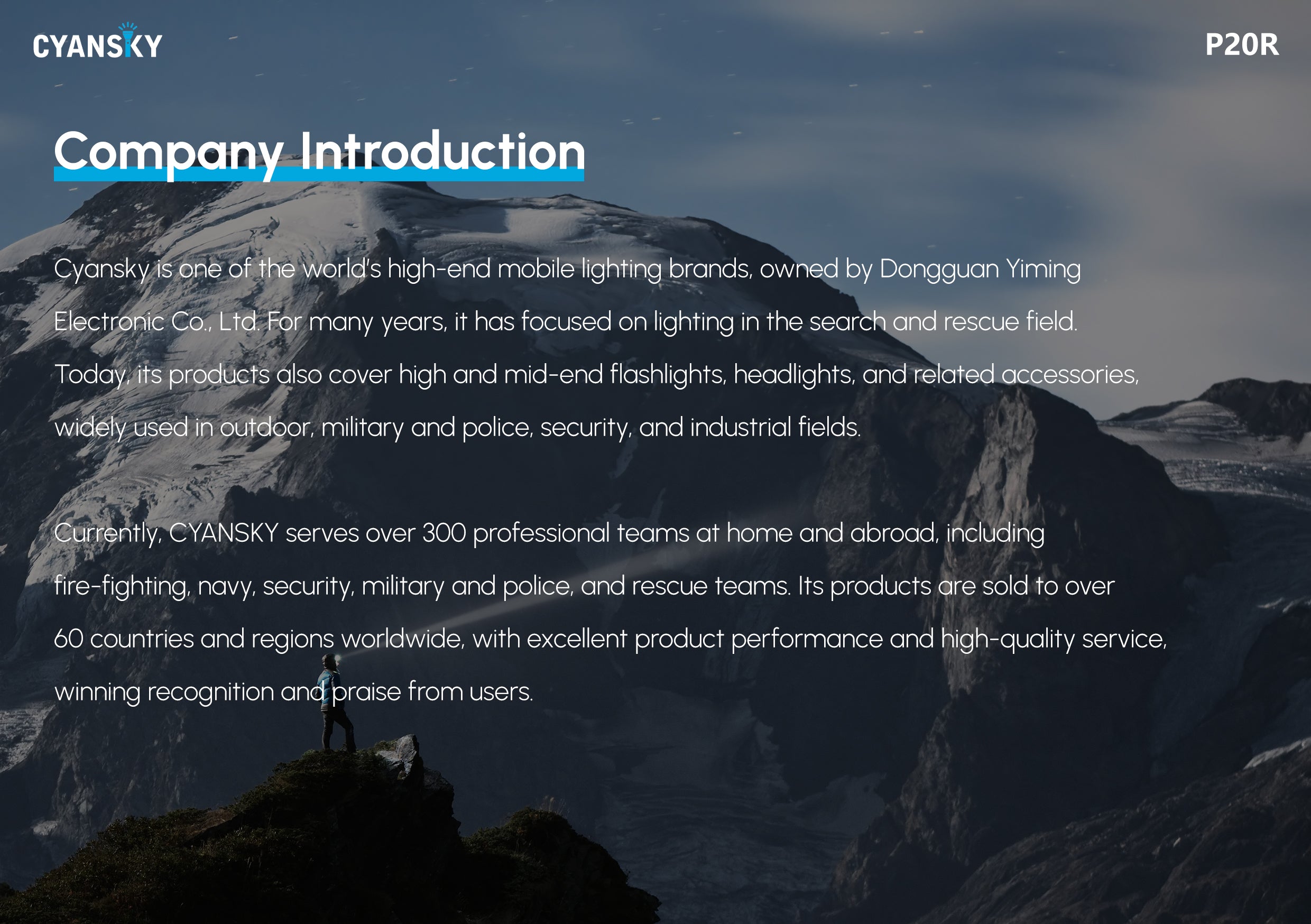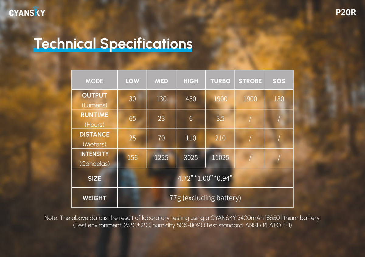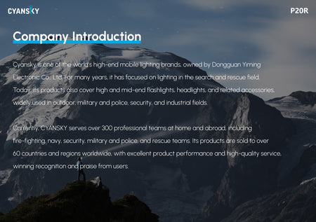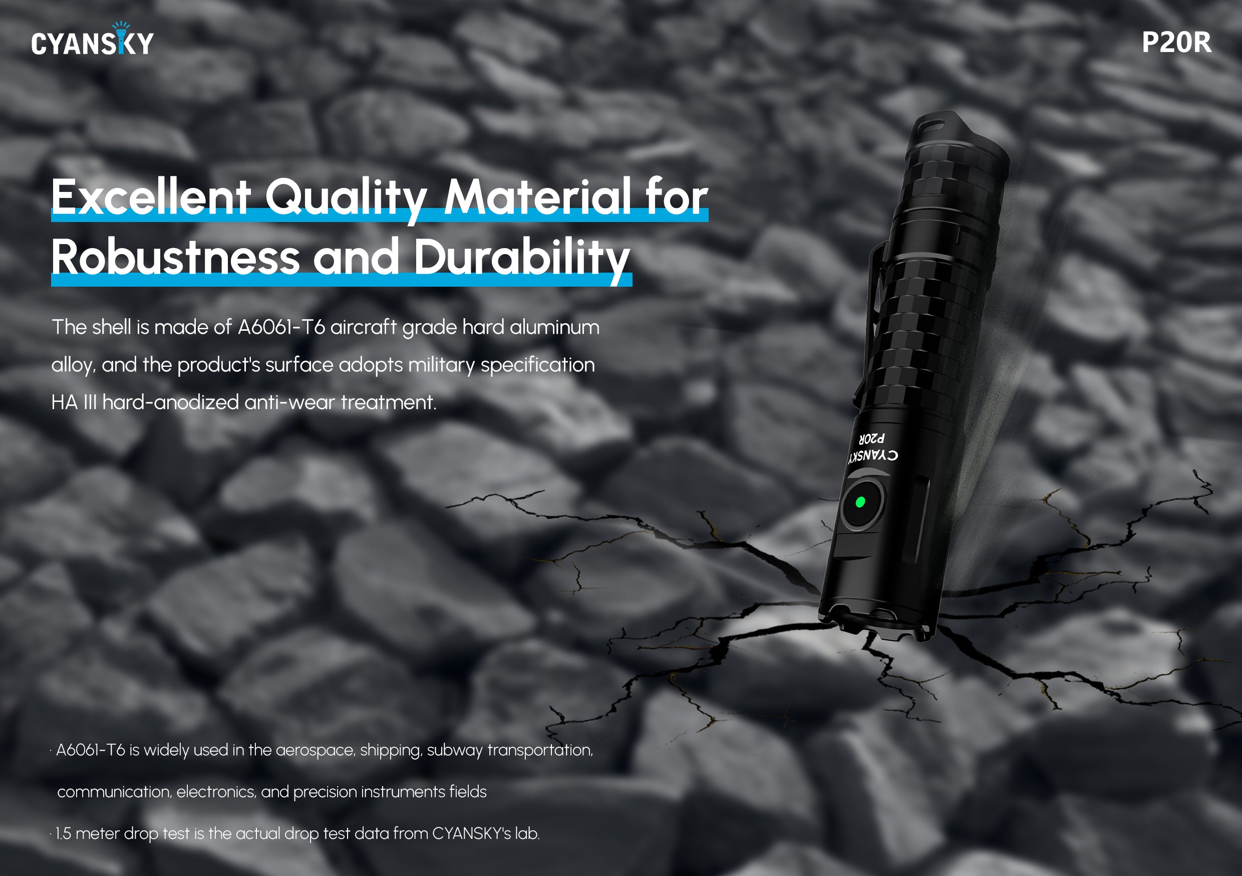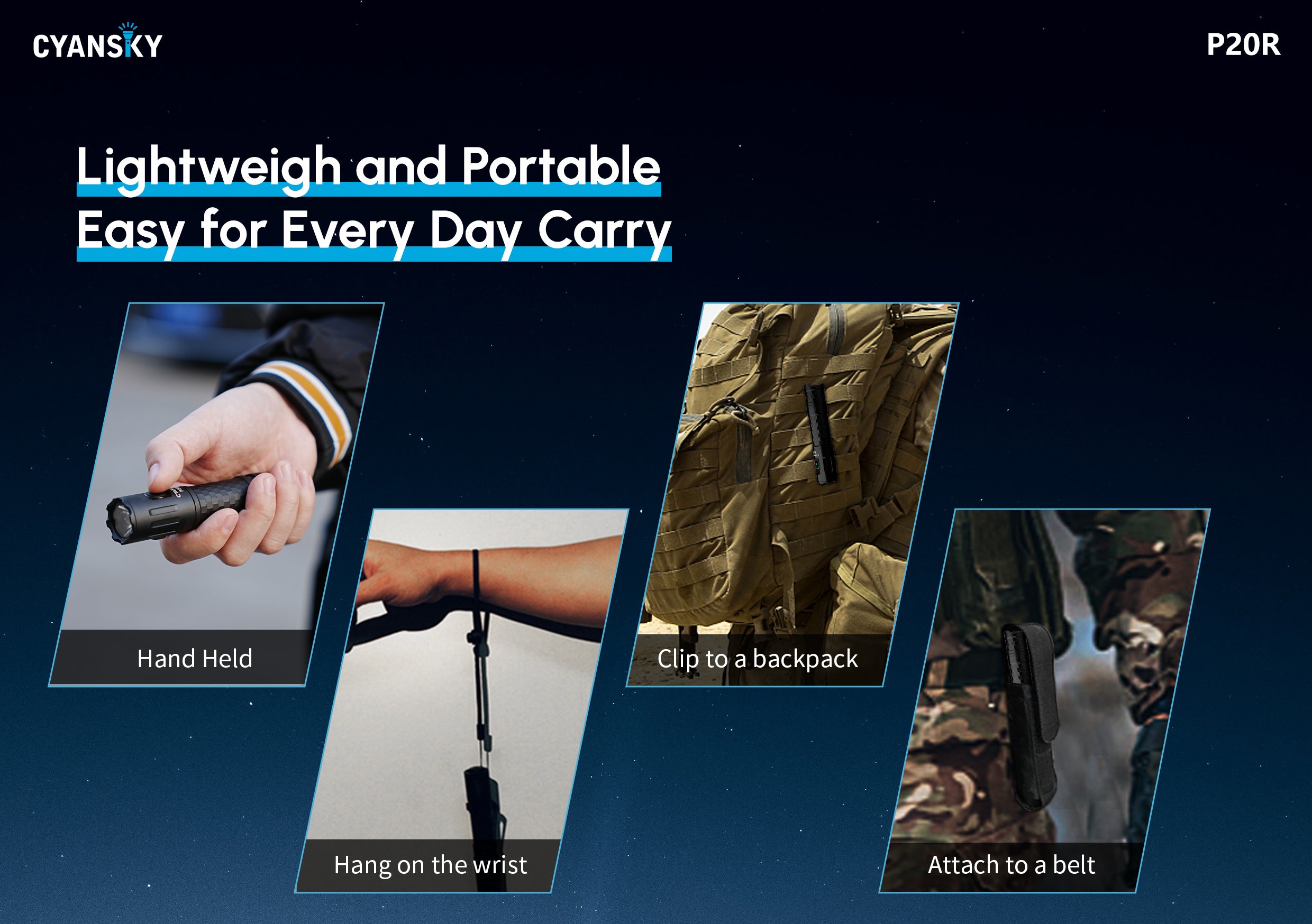 The CYANSKY P20R is a portable outdoor flashlight with a maximum brightness of up to 1900 lumens and a remarkable runtime of up to 65 hours. It features four different brightness levels, as well as strobe and SOS modes, catering to various lighting scenarios. The P20R boasts an IP68 protection rating and can withstand drops from a height of 1.5 meters, offering robust durability. Equipped with a standard 3400mAh 18650 battery, it supports USB Type-C fast charging and features a tail switch for power control and a side switch for mode adjustment. The compact design allows for easy one-handed operation, and the included unidirectional pocket clip ensures convenient carrying. With a rugged all-metal body that is both waterproof and shockproof, the CYANSKY P20R guarantees reliable quality.