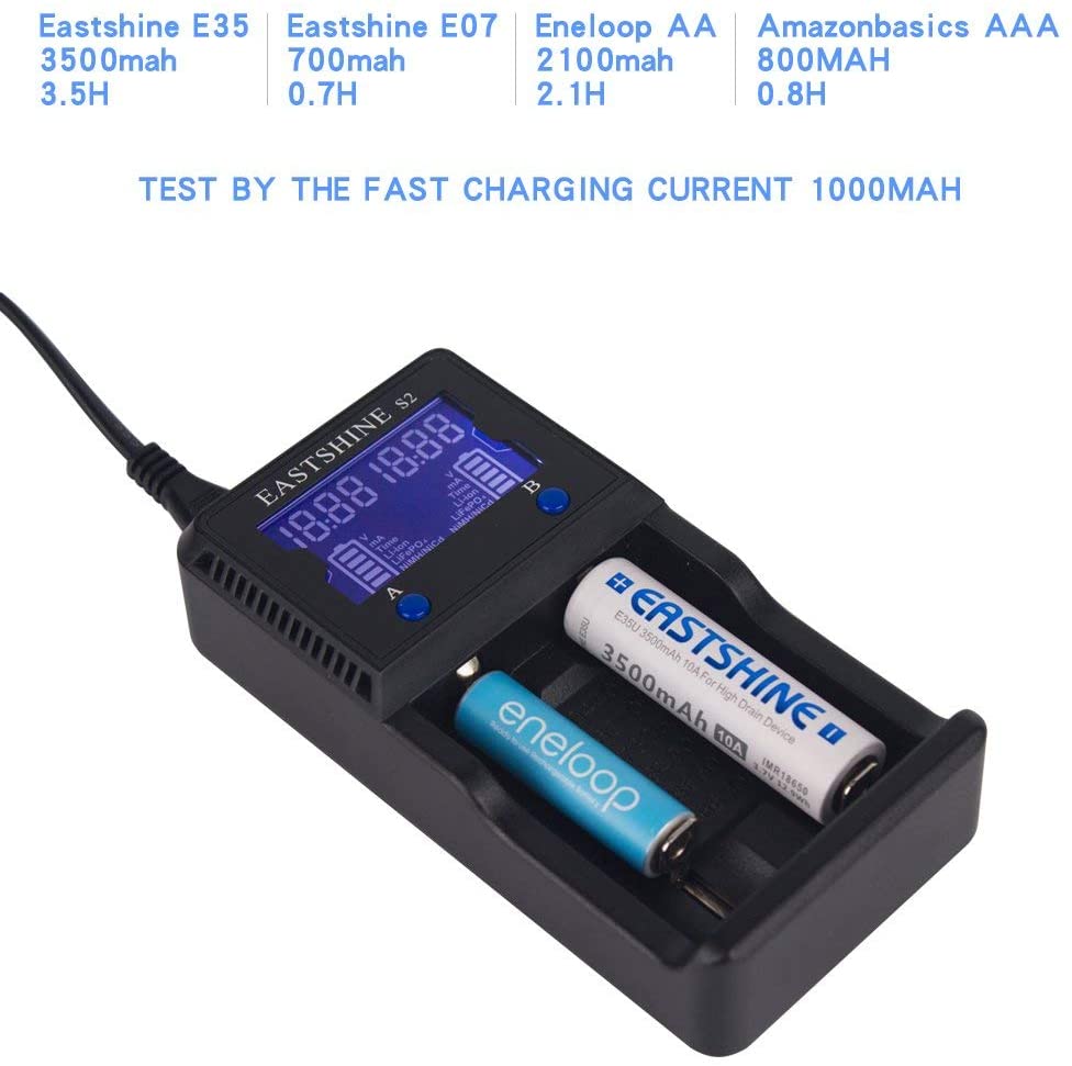 - 3. 2 Bay Speedy Rechargers for: Eneloop 2000mAh AA 2-Hour, Nickel Amazon basics 800mAh AAA 0.8-Hour, 3.7V Button Top Lithium ion 3400mAh Panasonic NCR18650B 3.5-Hour, 3.7 Volt Flat Top L-ion 2500mAh LG HE2 2.5-Hour @ 1A Fast Charge Current.
