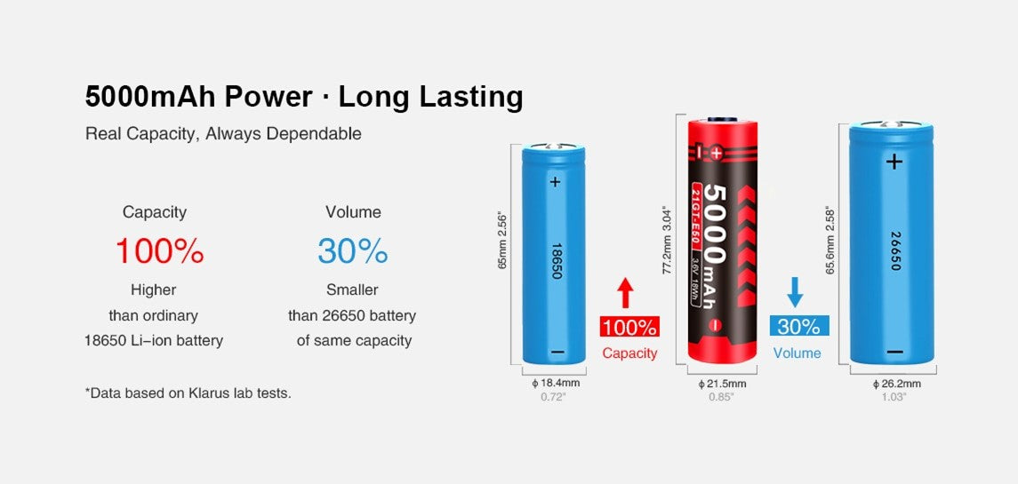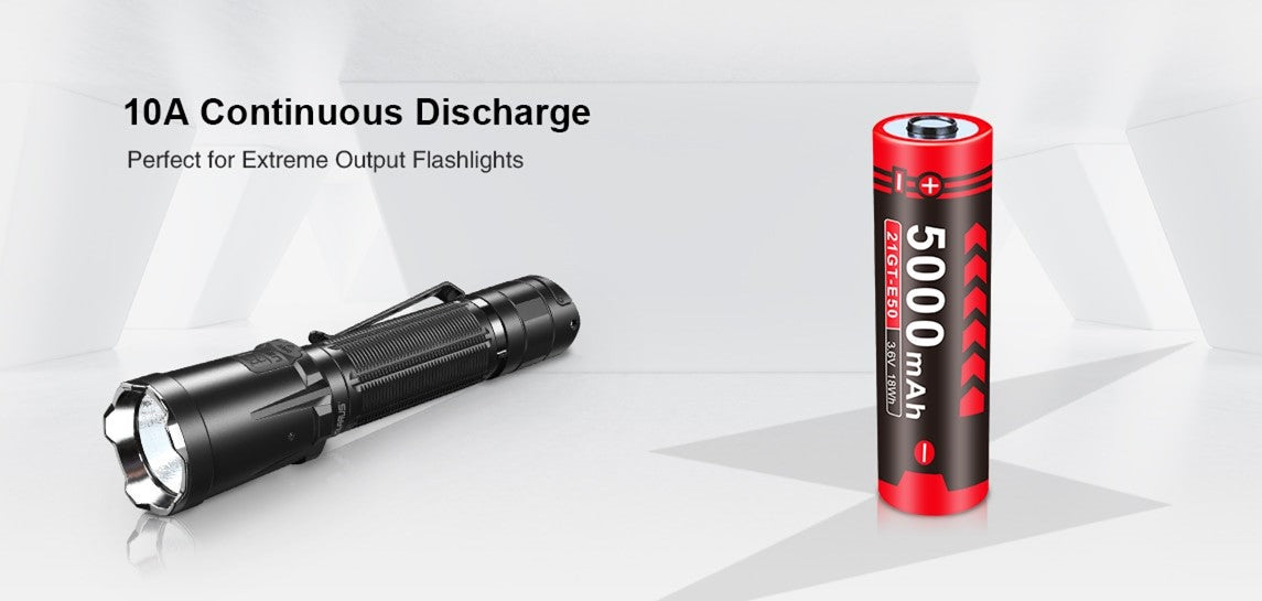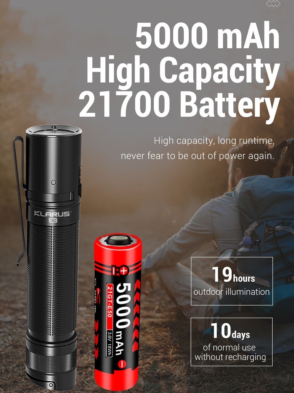The 21GT-E50 is a 21700 battery designed for high-drain Klarus flashlights. A 5,000mAh capacity provides the precise amount of power necessary and gives the longest runtimes possible. This battery was specifically designed for the Klarus E3 and the XT21C Klarus Flashlights.