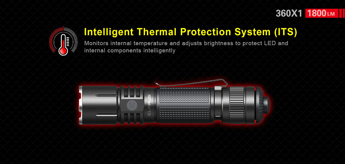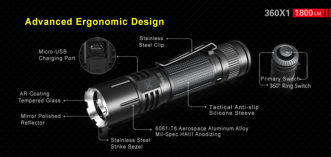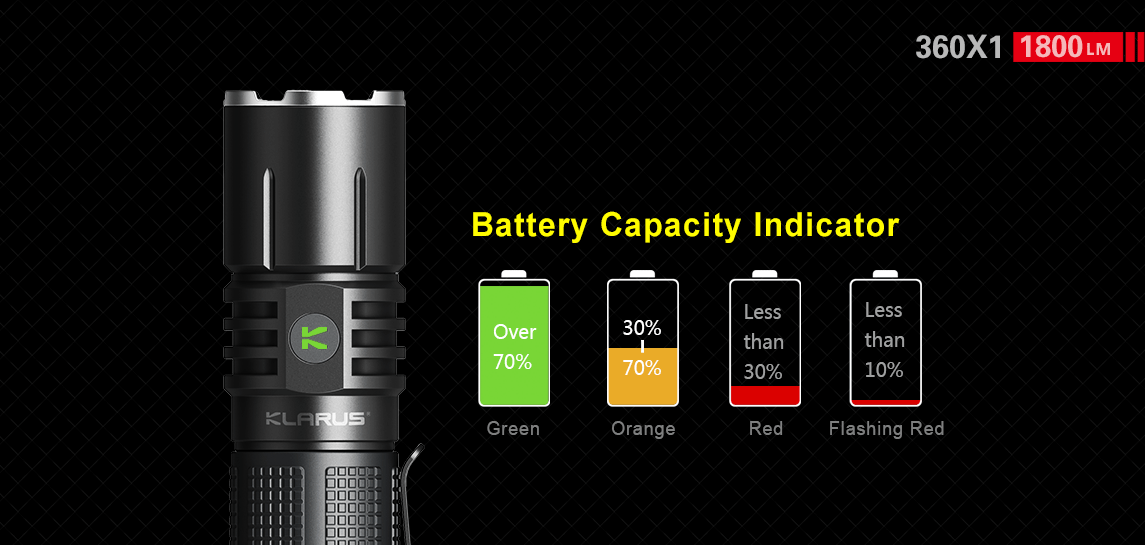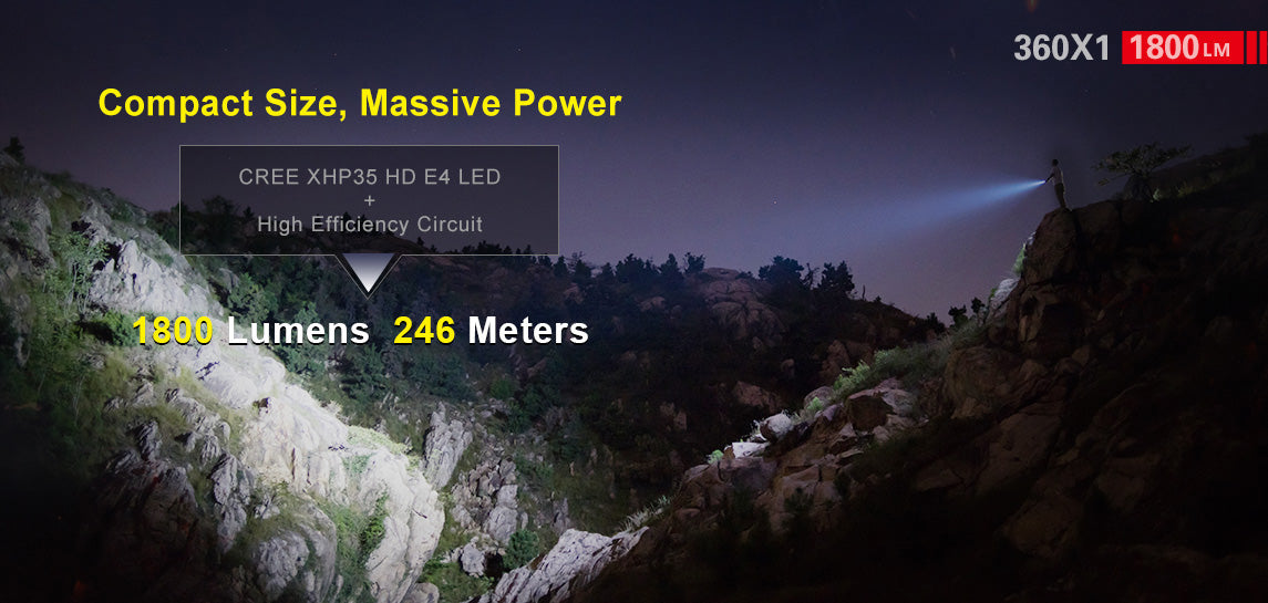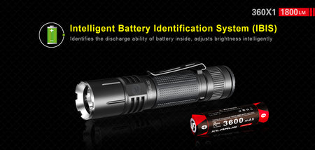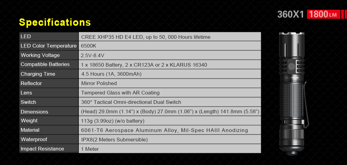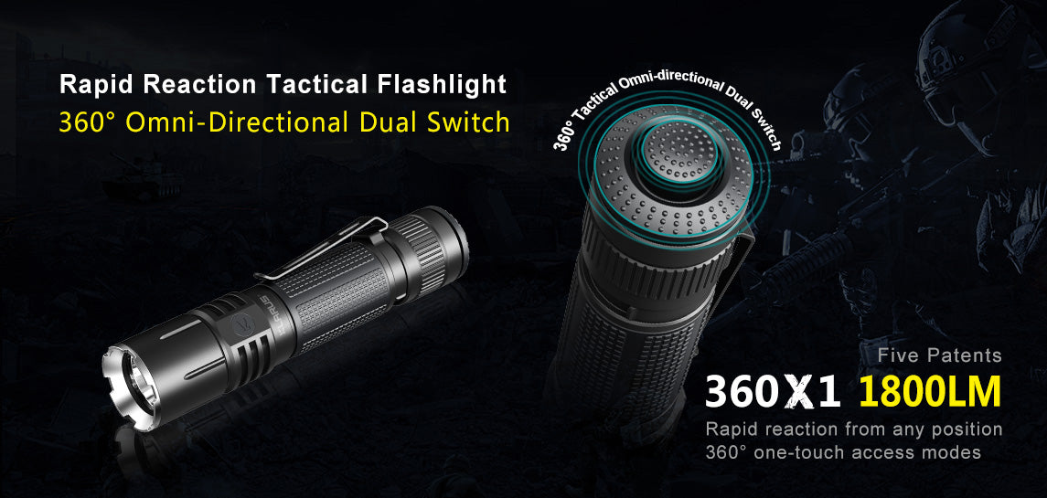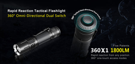 The Klarus 360X1 is a tactical rechargeable LED torch equipped with both a primary and 360° Omni-directional Dual switch. It has two interfaces: tactical setting and outdoor setting. It can produce 1800 lumens with 246 meters beam distance. 360° Omni-directional Dual switch. 3600mAh battery and holster included