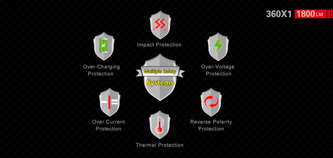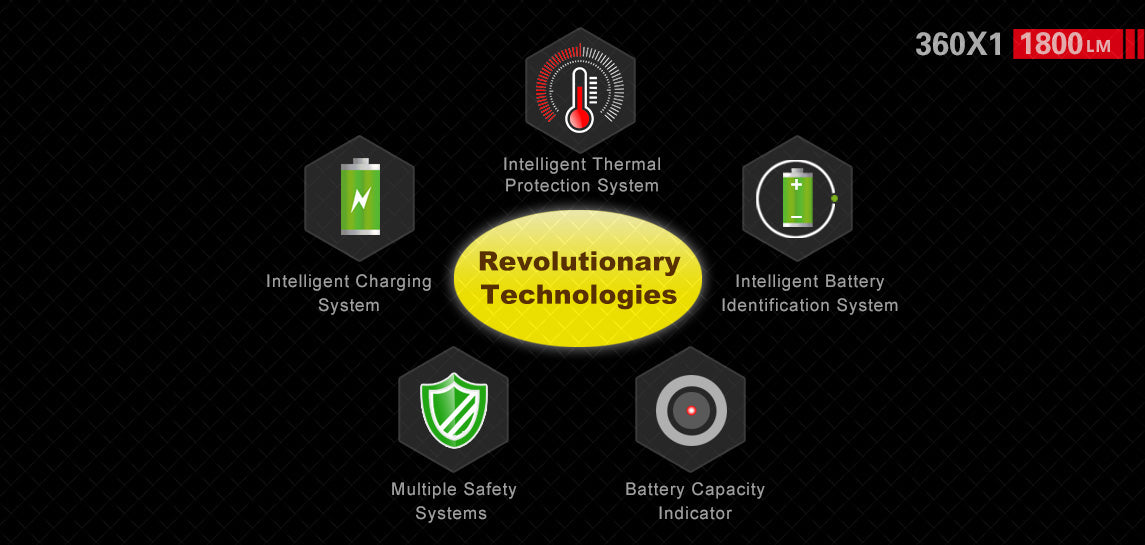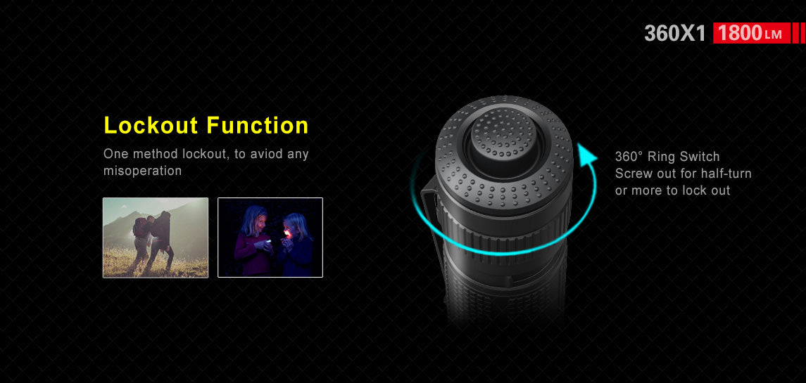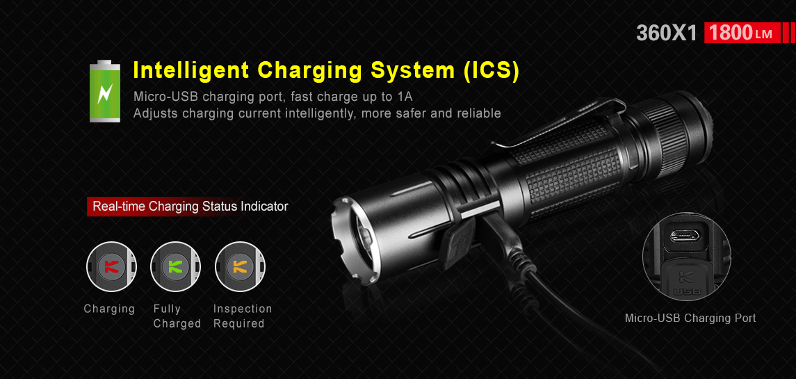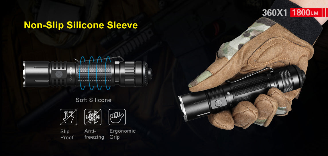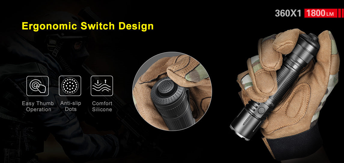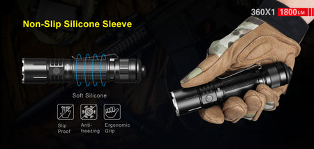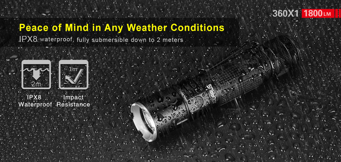 The Klarus 360X1 is a tactical rechargeable LED torch equipped with both a primary and 360° Omni-directional Dual switch. It has two interfaces: tactical setting and outdoor setting. It can produce 1800 lumens with 246 meters beam distance. 360° Omni-directional Dual switch. 3600mAh battery and holster included