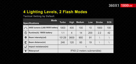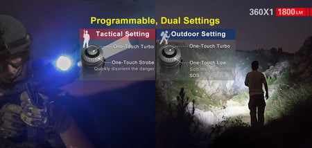 - Tactical Setting: specially designed for self-defense and tactical use. One-Touch Strobe; One-Touch Turbo