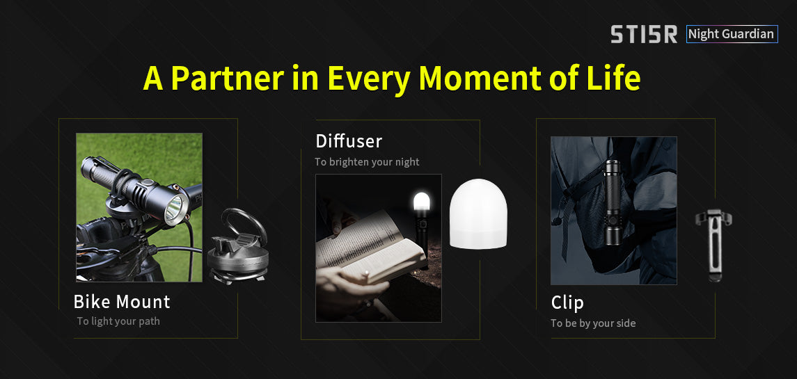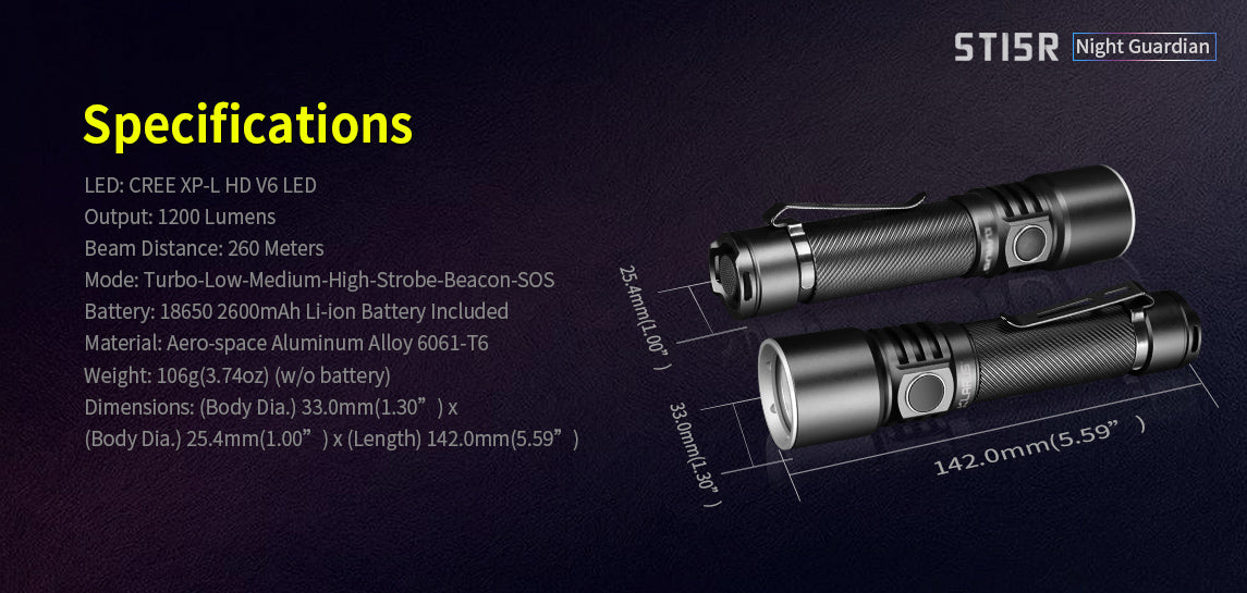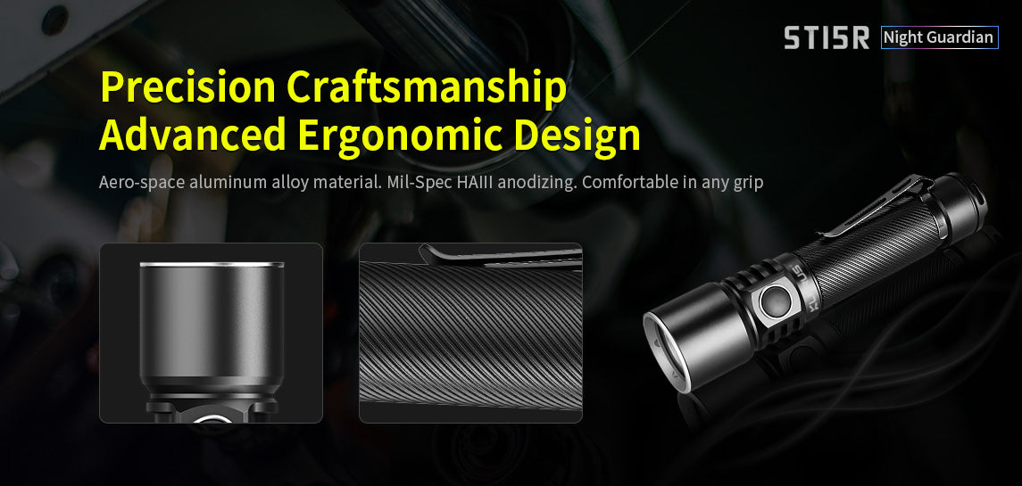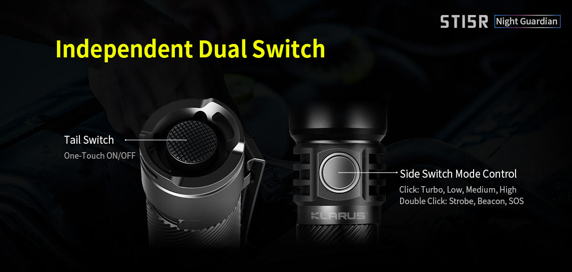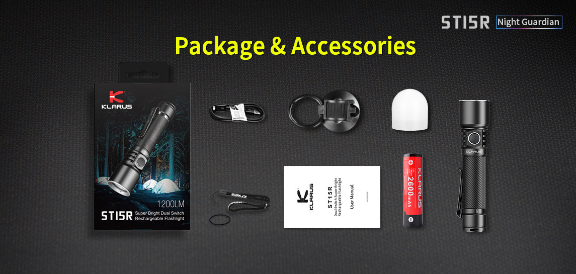The ST15R Night Guardian is one of Klarus's more reliable rechargeable flashlights with independent dual switch operation and amazing outputs. This light has four brightness levels and an additional three signal modes for emergency situations making this the perfect flashlight for any outdoor enthusiast. Pleasing to the eye, the spiral knurling ensures a comfortable, secure grip whether being used with gloves or not. The ST15R also includes all the accessories you could want for the perfect flashlight purchase.