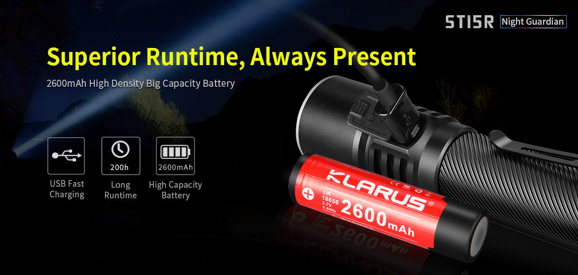 - Power Source: 1x (18650 Battery Included) or 2 x CR123A or 2 x Klarus 16340