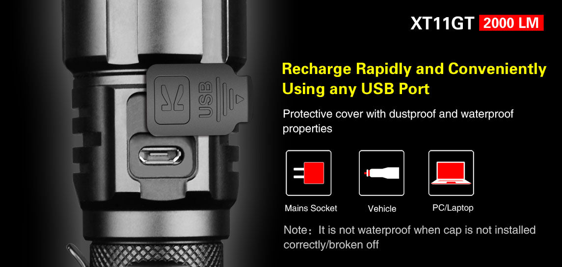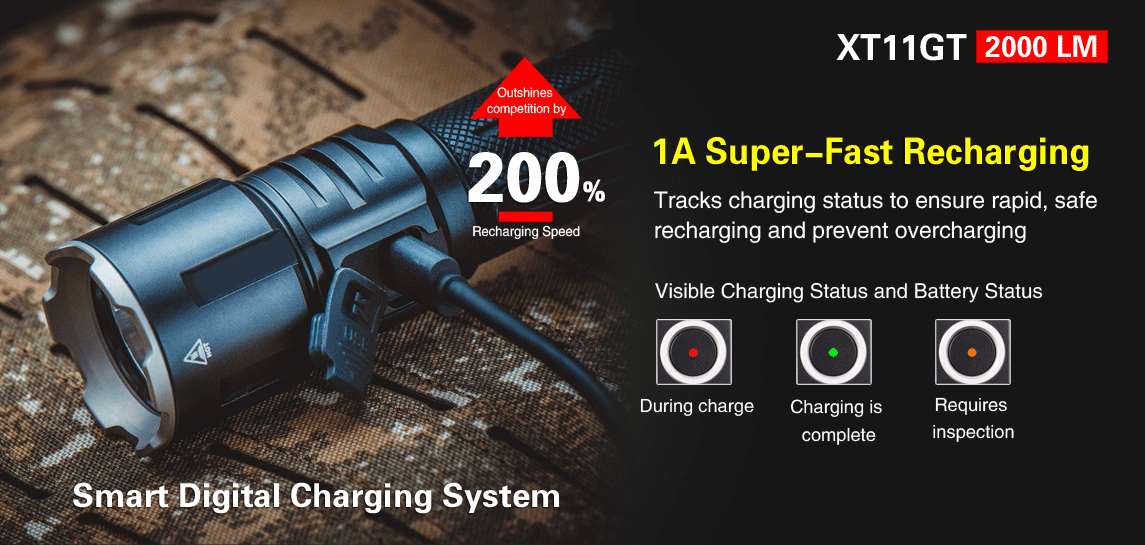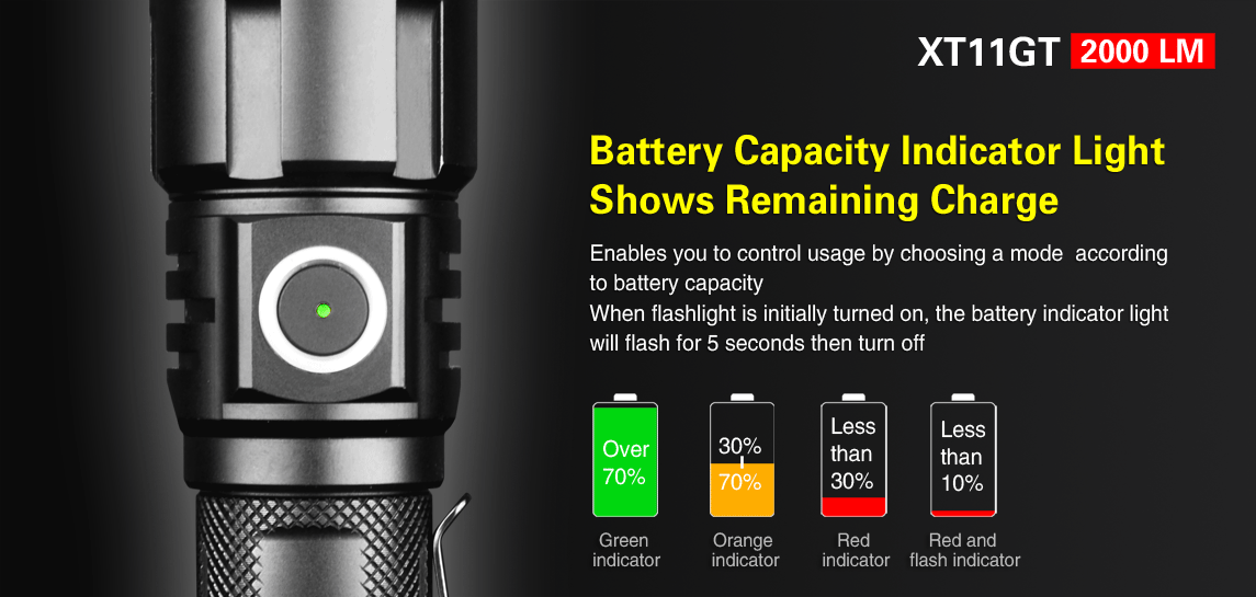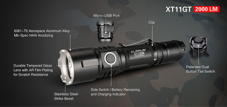 The Klarus XT11GT tactical flashlight, using high-quality aluminum, highly effective anti-rust and oxidation treatment, is very suitable for outdoor camping, hiking, mountaineering, military police law enforcement, rescue, etc. The 5th-generation tail dual-switch is faster and more accurate. The strobe is always ready, allowing you to react without hesitation when encountering danger. The brightness of 2000 lumens can suppress the target with one touch. The fixed pocket clip design allows you to run at full speed without worrying about the flashlight falling from the pocket clip. Support direct charging, fit 90% charging methods in the market. The IPX8 waterproof (2 meters underwater) makes the flashlight suitable to a variety of environments.