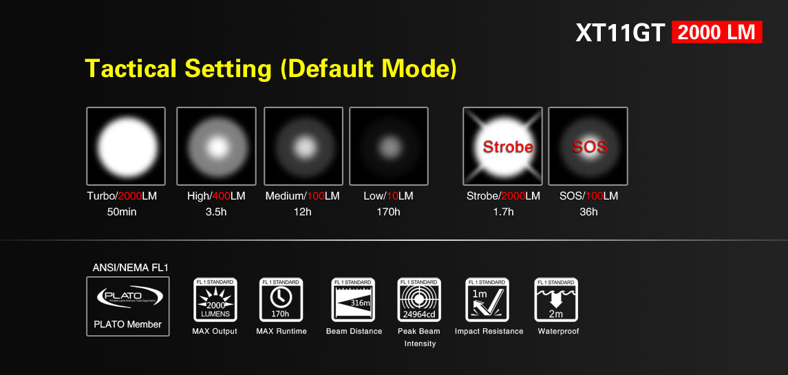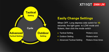 3 PROGRAMMABLE SETTINGS: Tactical Setting (conventional everyday use), Outdoor Setting (Instant high- or low-light and tactical tail switch without strobe mode), Advanced Tactical Setting (one-touch Turbo, one-touch Strobe mode and the side switch is inactivated for use in extreme tactical situations).