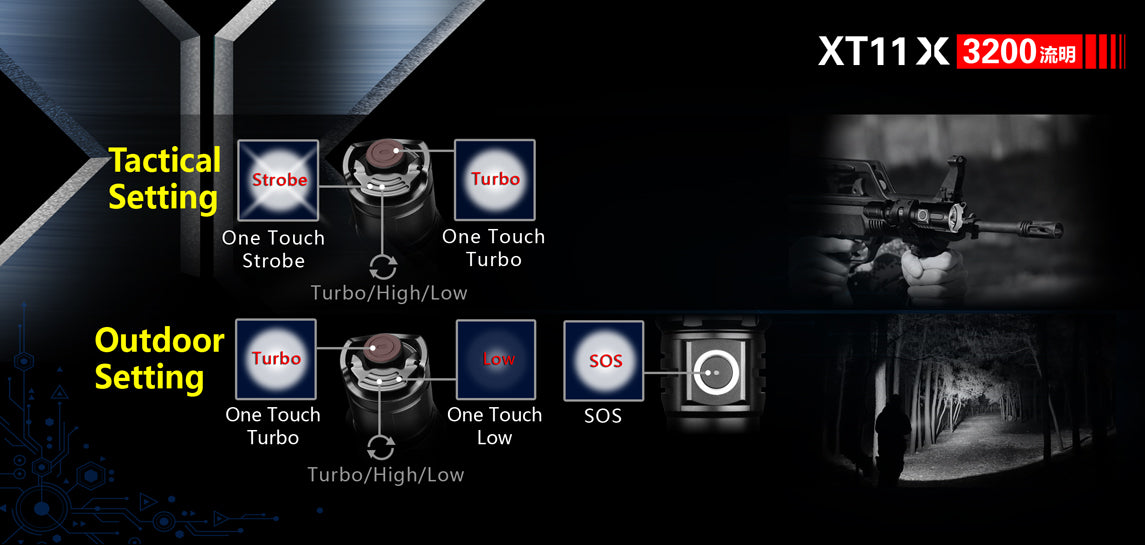 - Two programmable settings will give you 2 choices at any given time. If you're going to be using your XT11X outside or outdoor adventure then that Outdoor Setting is probably perfect for you. If you plan on using your XT11X for Law Enforcement, Military or self defense then the Tactical Setting is the one for you.