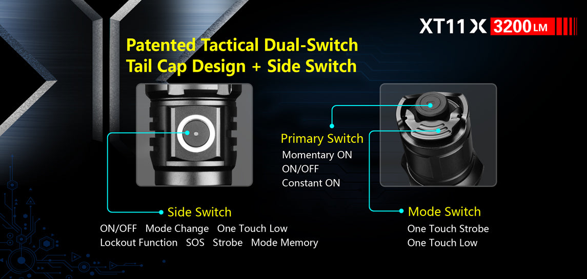 - Switch: Tactical Tail cap Dual-Switch + Side Switch.