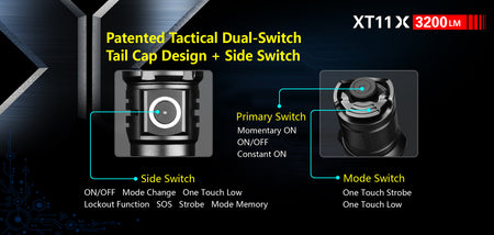 - The Side switch will remain the same allowing you to turn on and off the flashlight, cycle through the modes, and have access to the One-Touch Low and the built-in memory