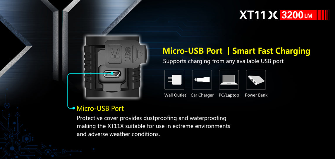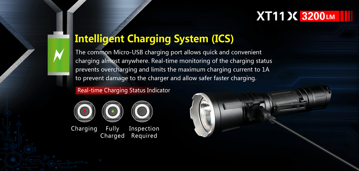 Direct USB Recharging: XT11X is a USB rechargeable flashlight that features an Intelligent Charging System. This ICS system monitors the charging, prevents overcharging, and limits the charging current to 1A to ensure safe and quick charging. You can monitor the charging status through the indicator located on the side switch. This indicator doubles as a battery capacity indicator to let you know the charge of your battery as you use the flashlight.