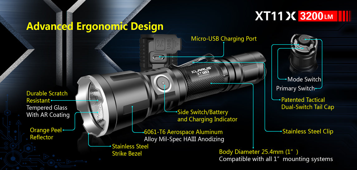 The XT11X is the perfect combination of ultimate control and superior illumination. 3200 lumens, far exceeds industry standard, brighter than car headlights; XT11X adopts Klarus exclusive dual tail switch, which cooperate with side switch to ensure the extreme experience, one touch turbo , one touch strobe, quick response ;