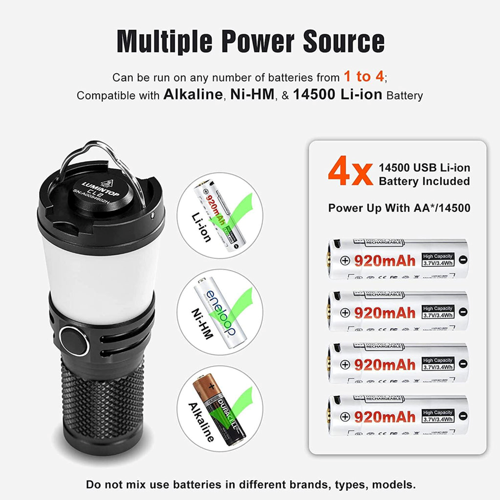 - Powered by 1, 2, 3, or 4 X 14500 Li-ion / AA batteries