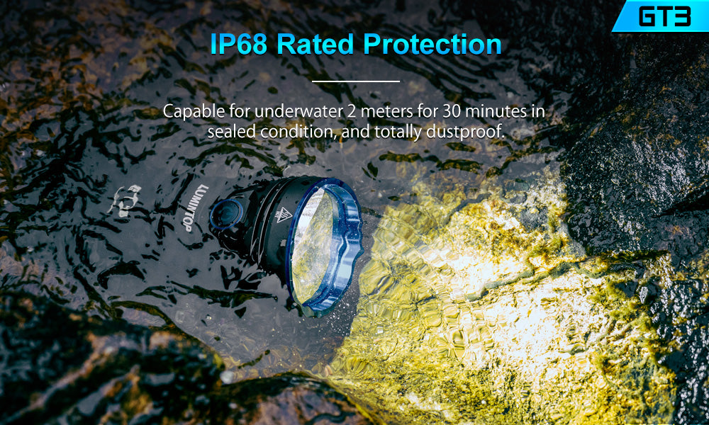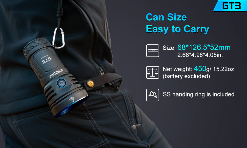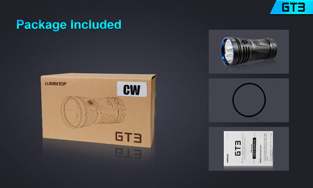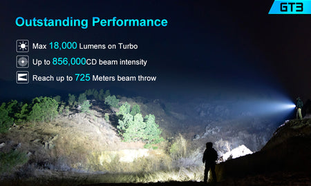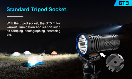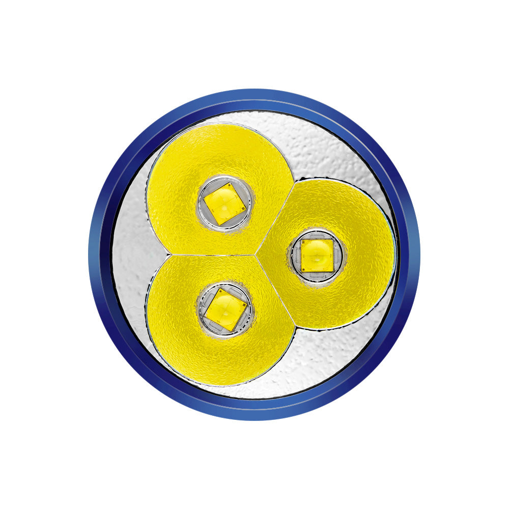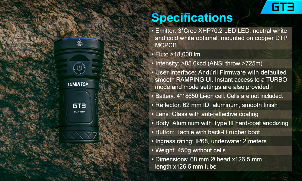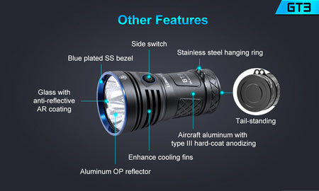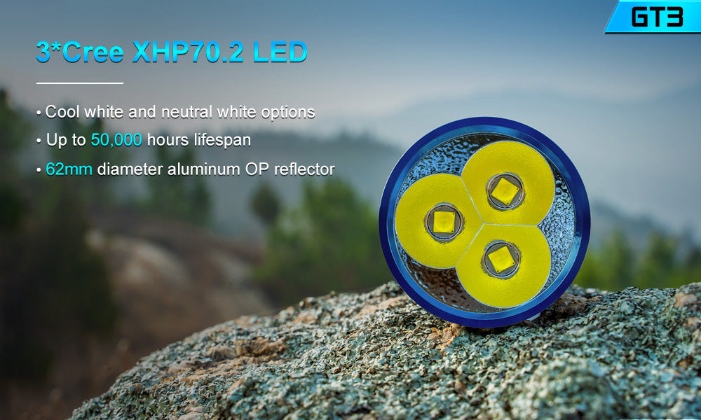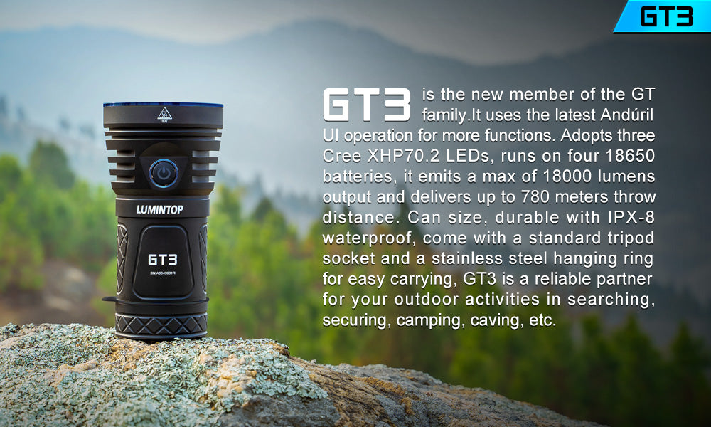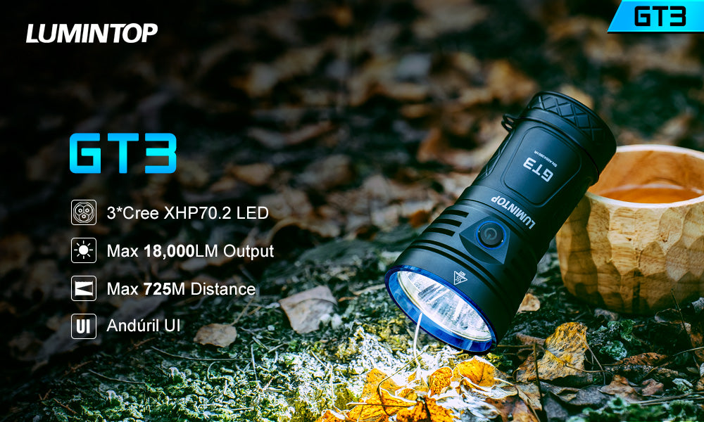The Lumintop BLF GT3 flashlight is a massive output light using 3 Cree XHP70.2 emitters and running on four 18650 cells. This compact beast has a range over 700 meters, this is the perfect light wide area searches, lighting up forests and mountain sides.