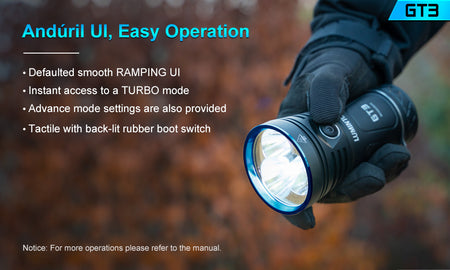 Firmware: Andúril Firmware with defaulted smooth RAMPING UI. Instant access to a TURBO mode and mode settings are also provided.