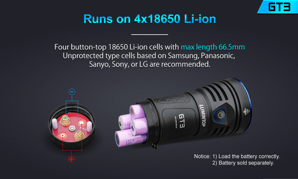 Battery: Uses Four 18650 cells. Unprotected cells are recommended. ***Batteries are not included***