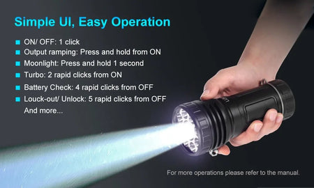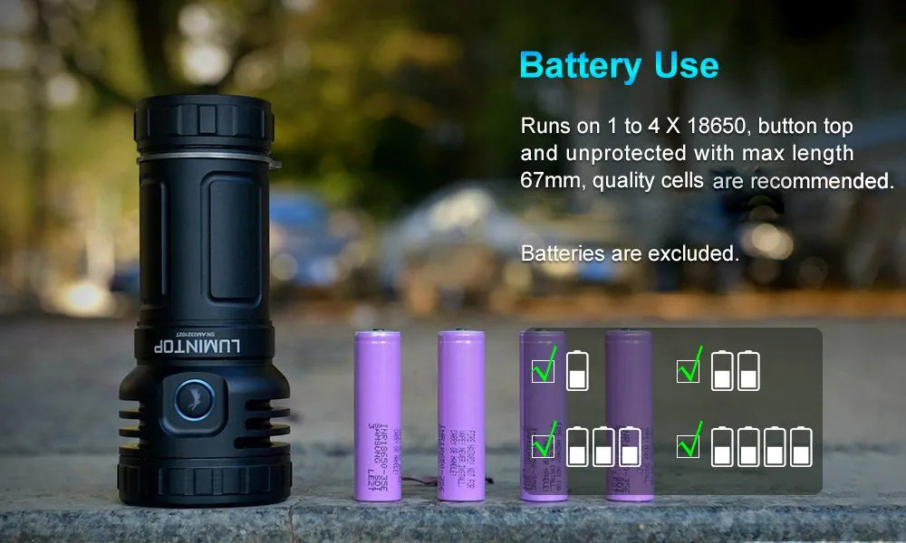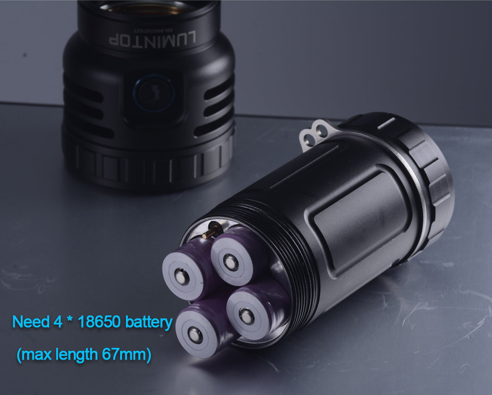 - Battery: 1-4 X 18650, button-top, unprotected, max length 67mm (excluded)