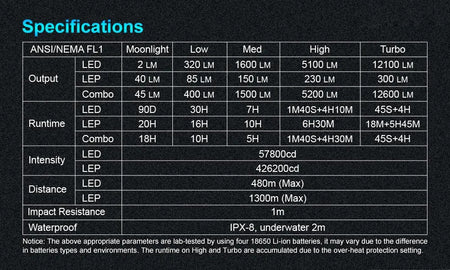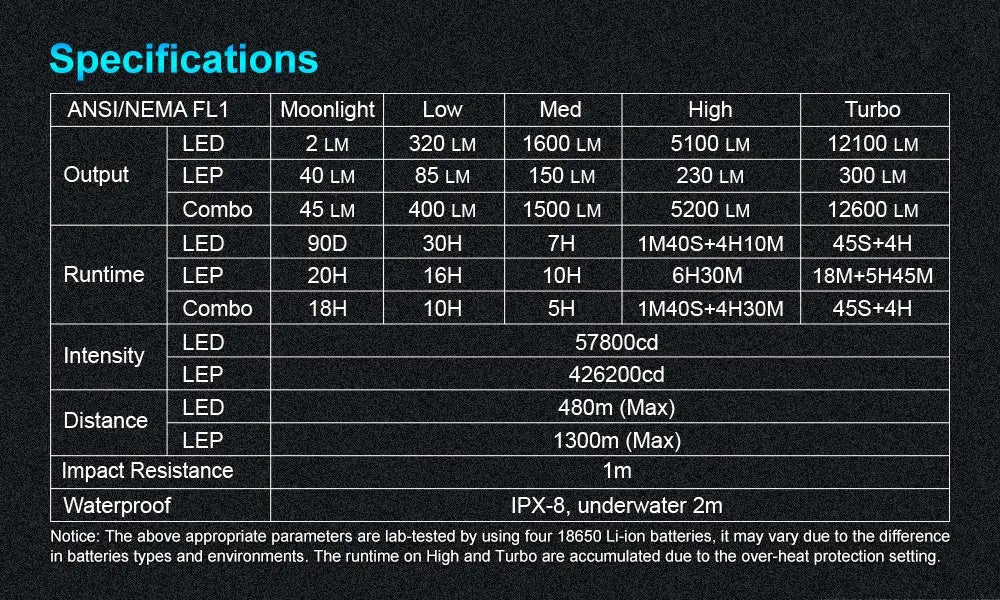 | Battery | 1-4 x 18650, button-top, unprotected, max length 67mm (excluded) | |||||