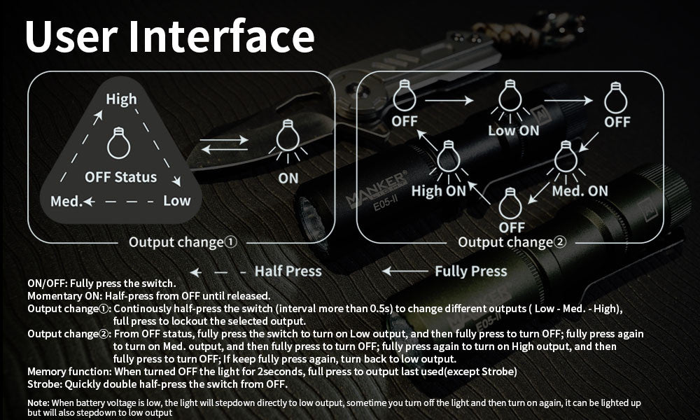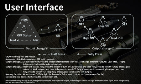 Output change②: From OFF status, fully press the switch to turn on Low output, and then fully press to turn OFF; fully press again to turn on Med. output, and then fully press to turn OFF; fully press again to turn on High output, and then fully press to turn OFF; If keep fully press again, turn back to low output.