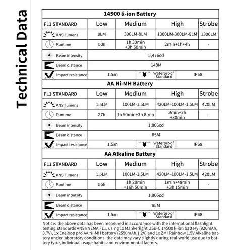 • Runtime: 2 min +1 hrs+4 hrs - 1hrs 30 min + 3hrs 50 min - 50 hrs (powered by 14500 USB-C Li-ion Battery)
