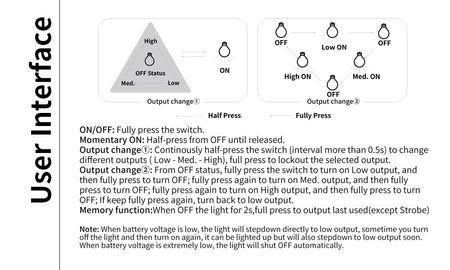 Note: When battery voltage is low, the light will step-down directly to low output, sometime you turn off the light and then turn on again, it can be lighted up but will also step-down to low output soon. When battery voltage is extremely low, the light will shut OFF automatically.